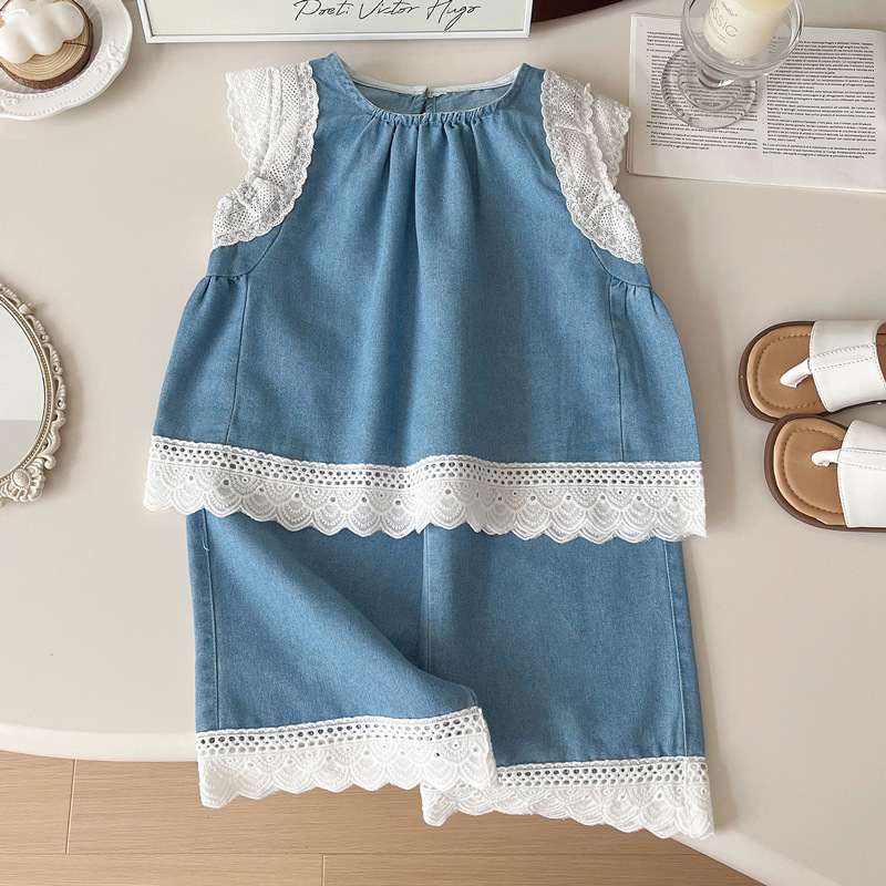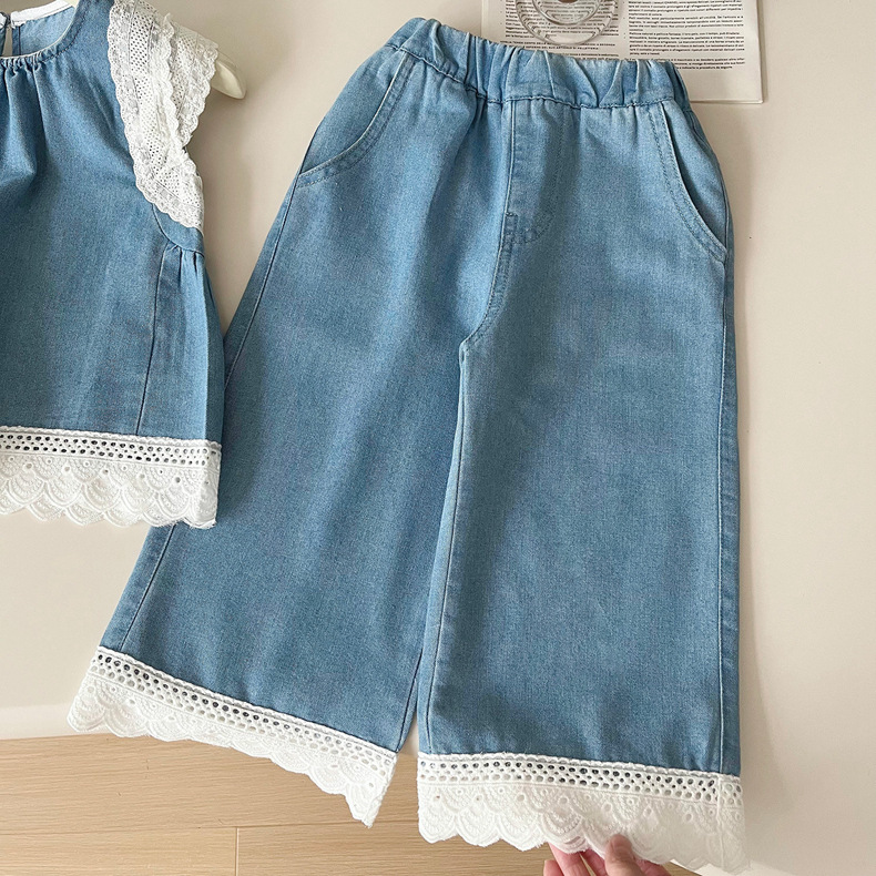 한국 스타일 걸스 데님 세트 여름 새 2024 어린이 레이스 민소매 조끼 바지 투피스 트렌디 세트