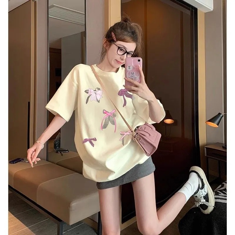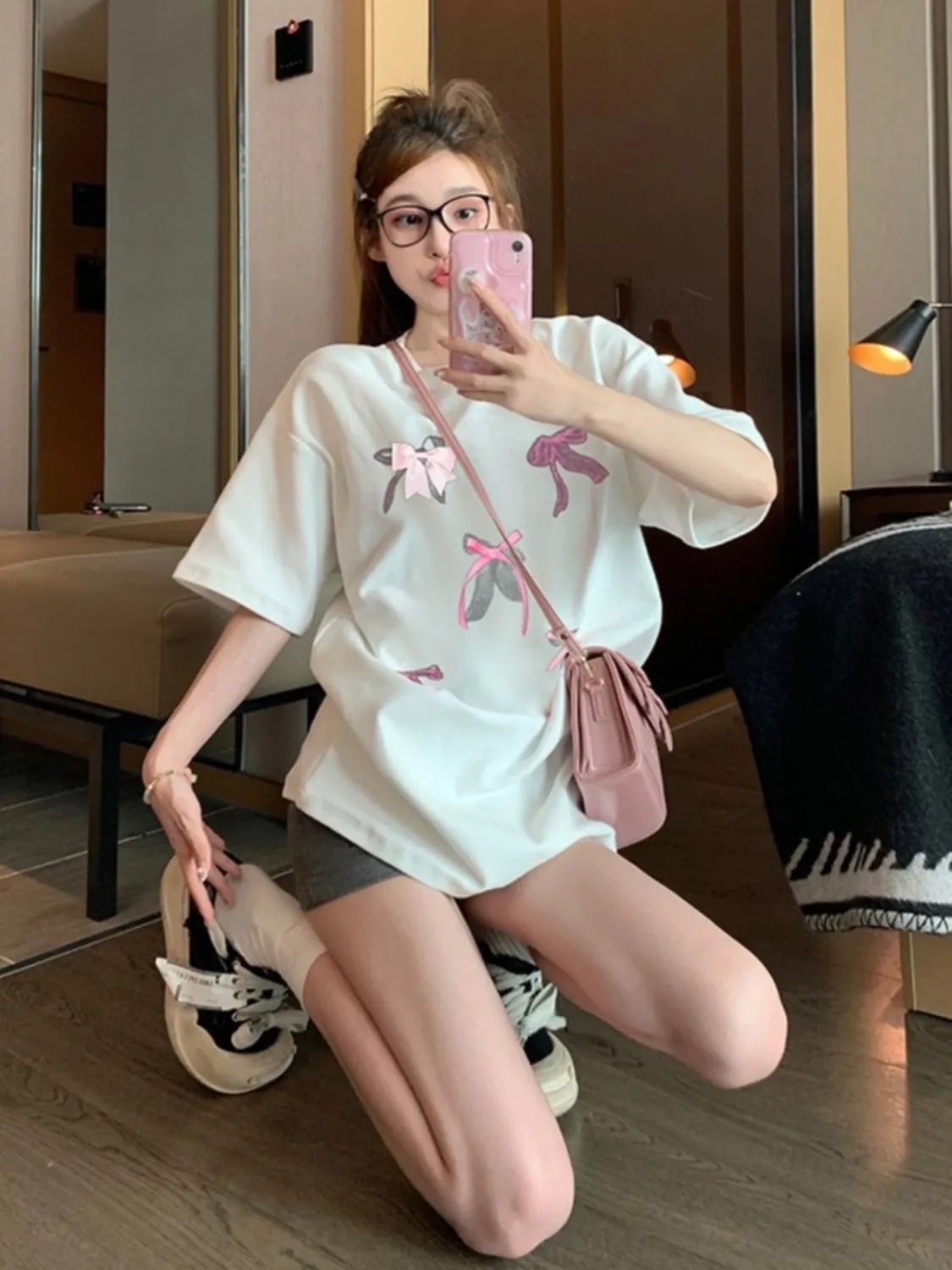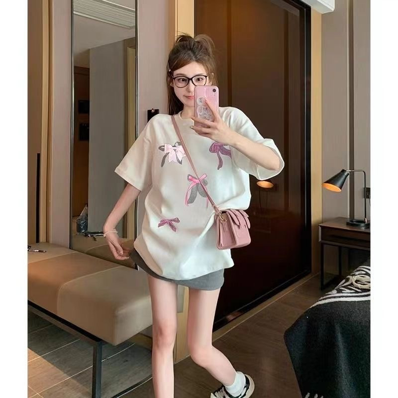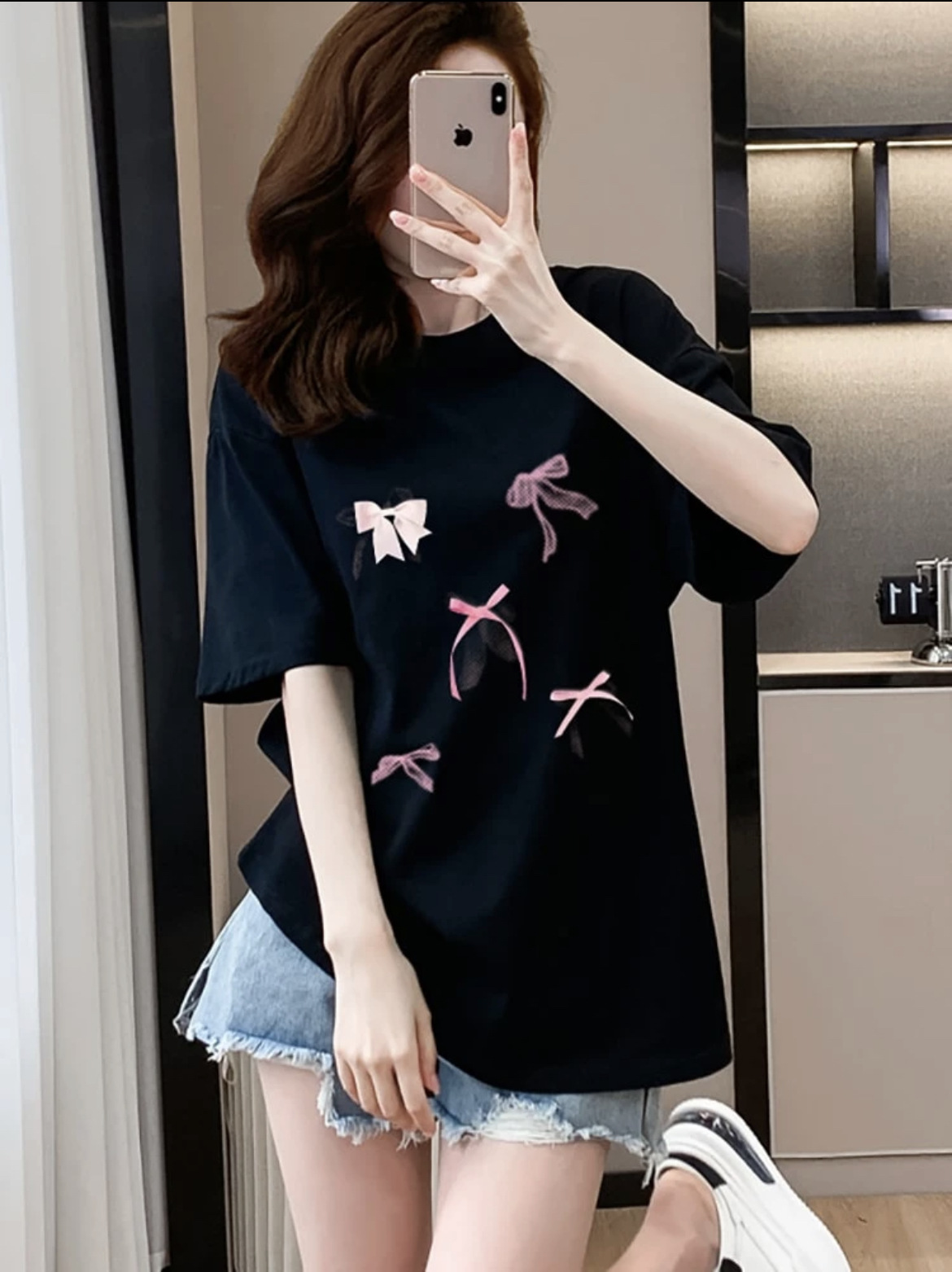 통통녀 플러스 사이즈 1.00 kg-150.00 kg 활 인쇄 반팔 티셔츠 여성용 여름 루즈 올 매치 캐주얼 미드 길이 탑