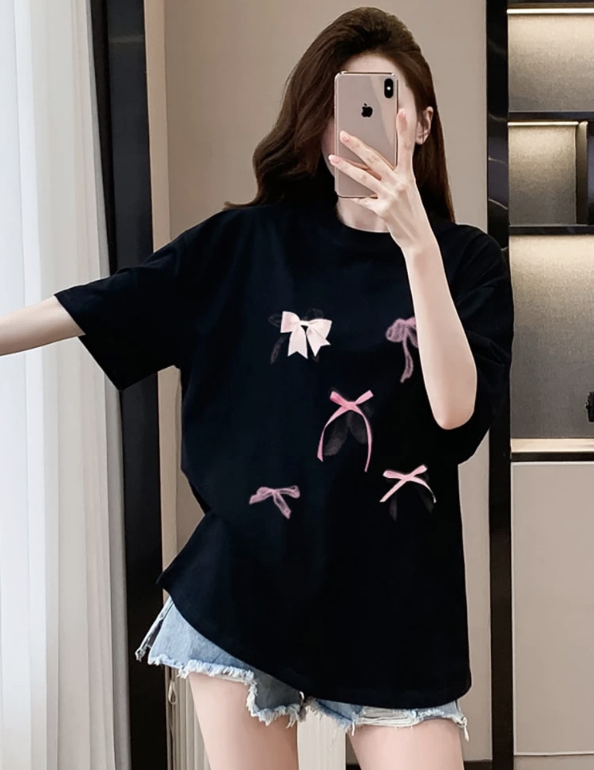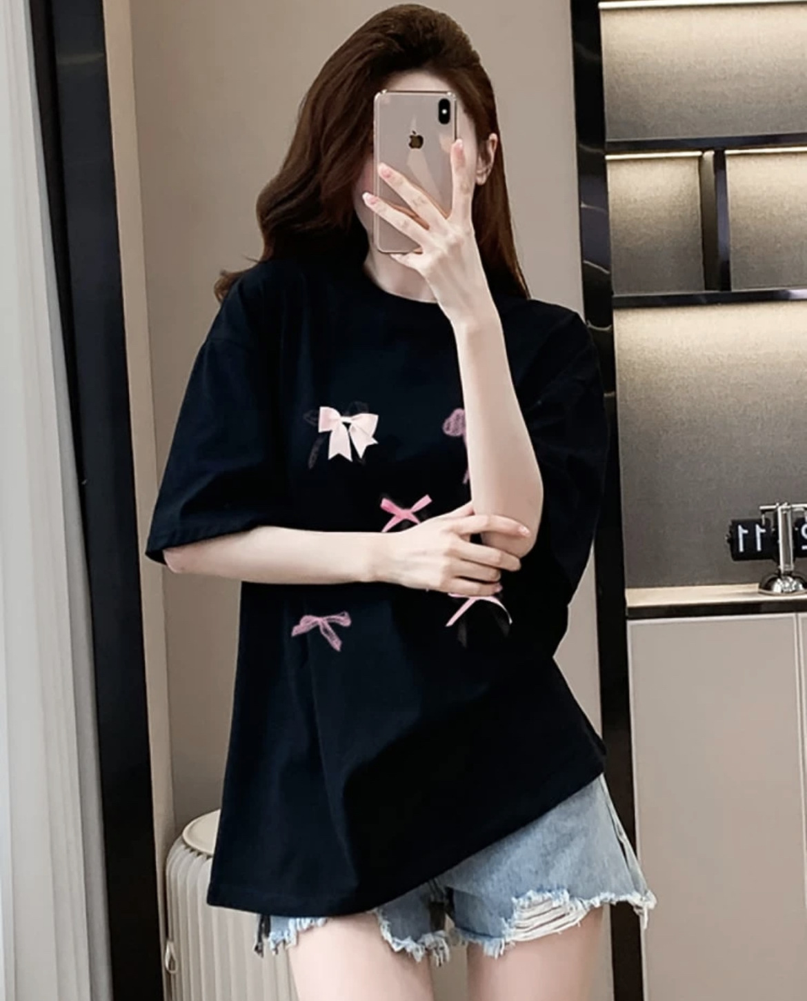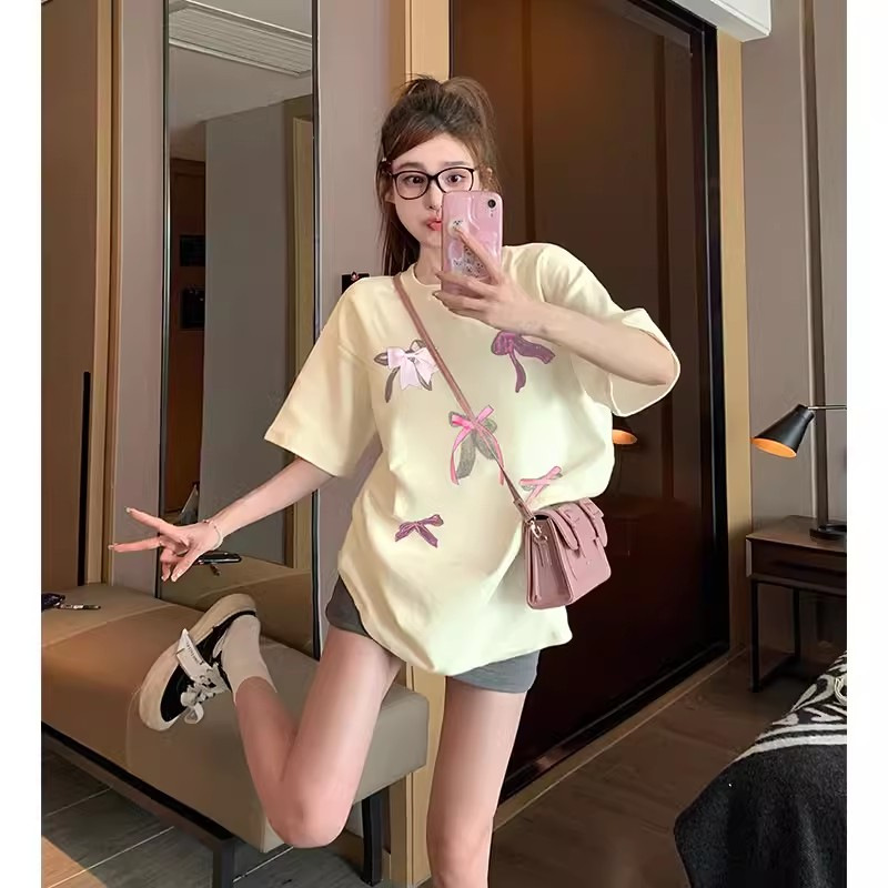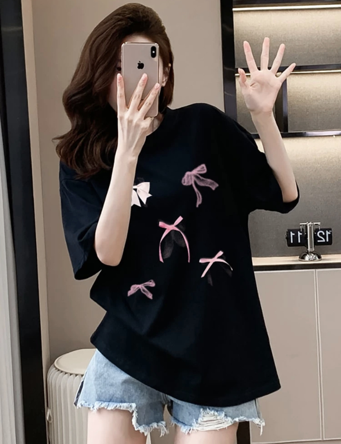 통통녀 플러스 사이즈 1.00 kg-150.00 kg 활 인쇄 반팔 티셔츠 여성용 여름 루즈 올 매치 캐주얼 미드 길이 탑