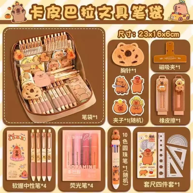 • 다층 스탠딩 필통 - 커피_10 카피바라 스티커_메모지_키링_브로치 2개