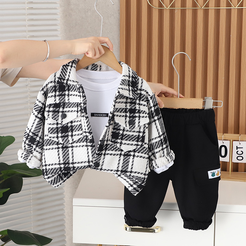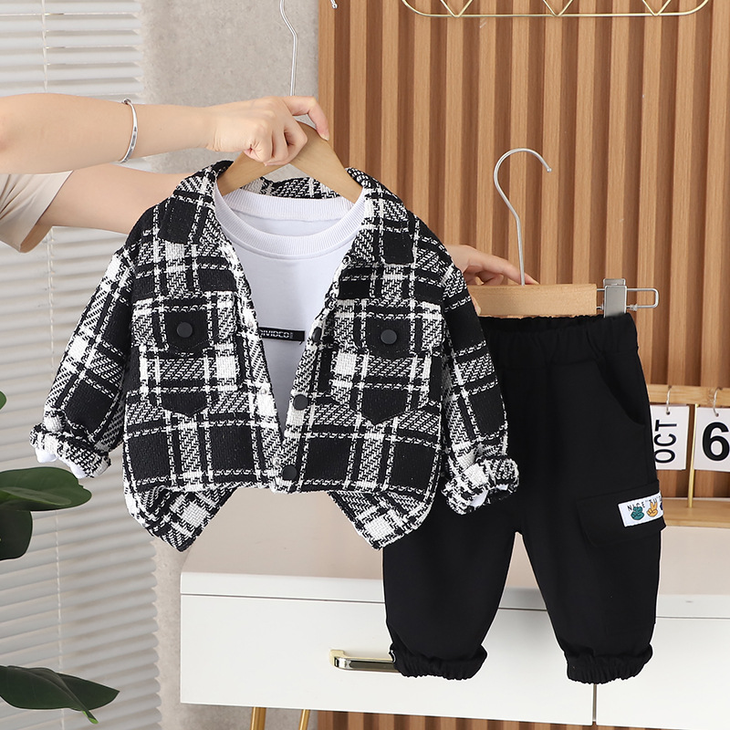 소년 셔츠 가을 세트 2024 새로운 아기 서양식 어린이 봄과 가을 캐주얼 격자 무늬 긴 소매 3 조각 트렌디스토어 가기