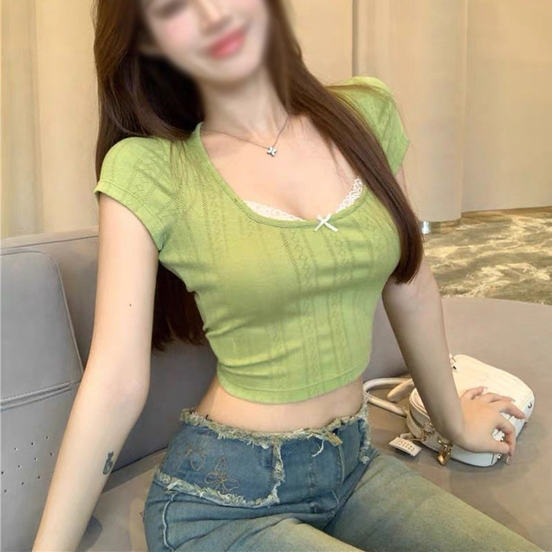 배색 레이스 스티치 그린 반팔 티셔츠 여성 여름 디자인 숏탑 달콤하고 섹시한 탑 일본 및 한국 캐주얼 스타일