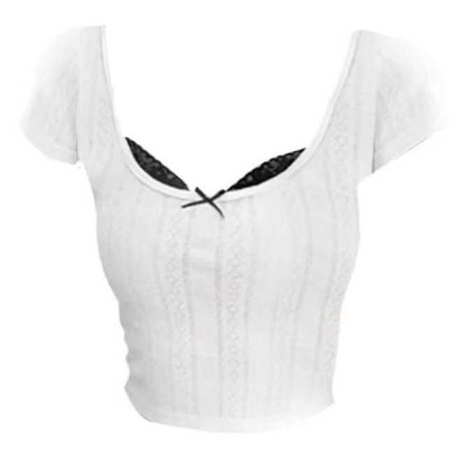 배색 레이스 스티치 그린 반팔 티셔츠 여성 여름 디자인 숏탑 달콤하고 섹시한 탑 일본 및 한국 캐주얼 스타일스토어 가기