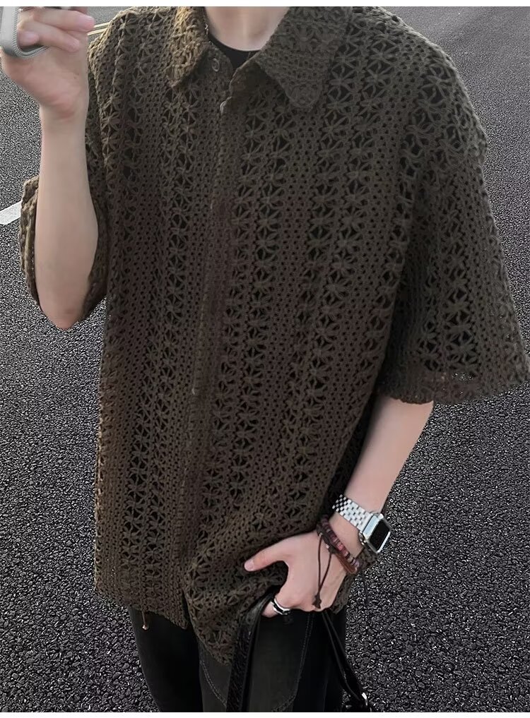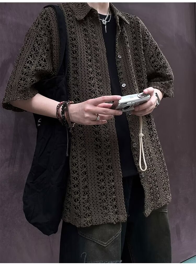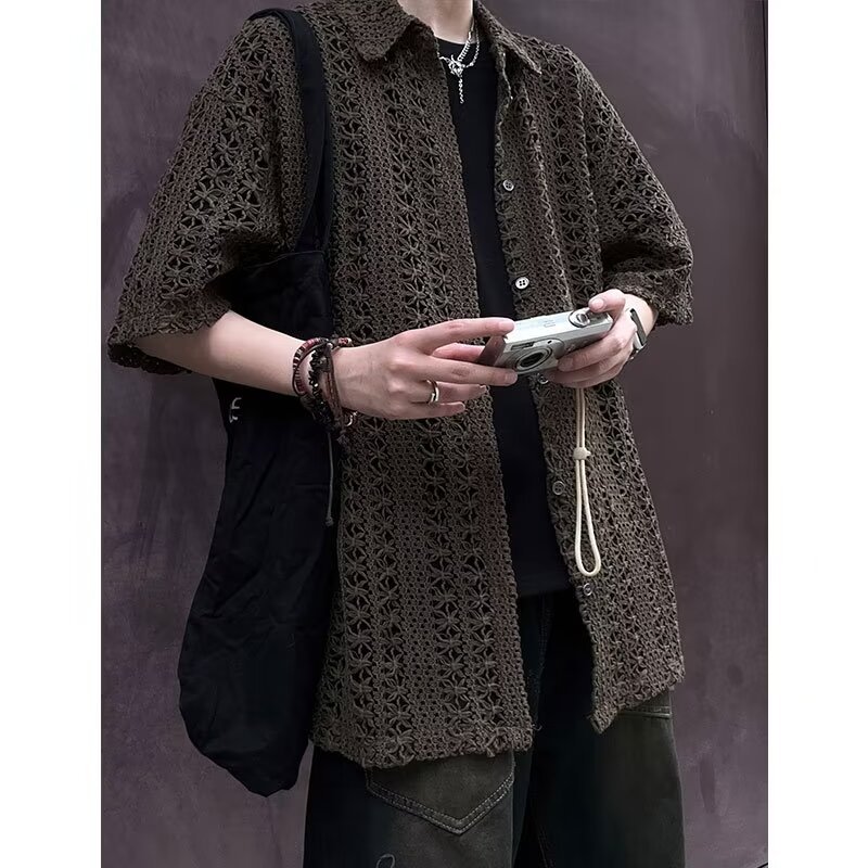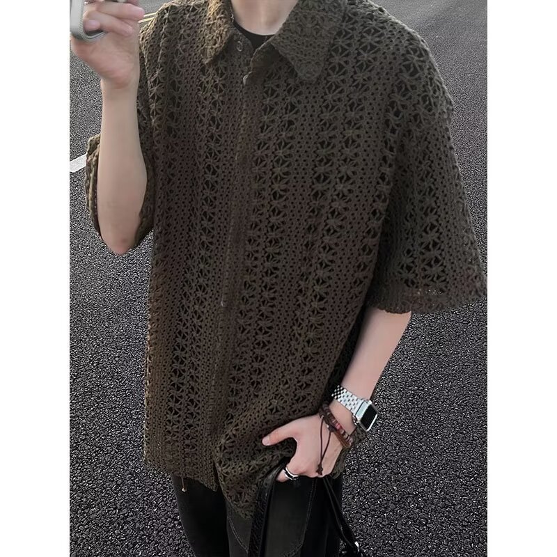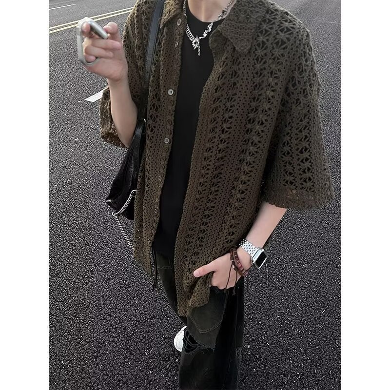 여름 아메리칸 스타일 레트로 앤티크 다목적 카키 앤티크 니트 할로우 통기성 느슨한 휴가 남성용 반팔 셔츠스토어 가기