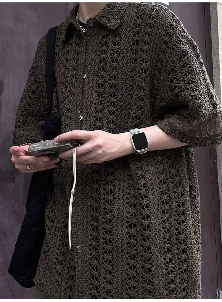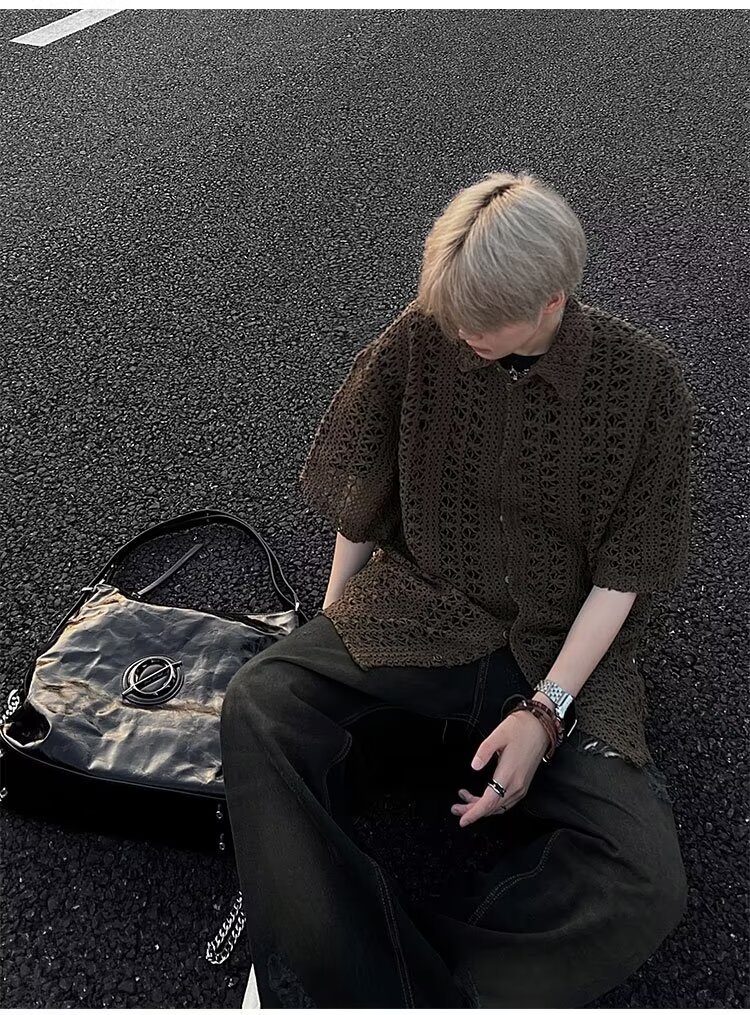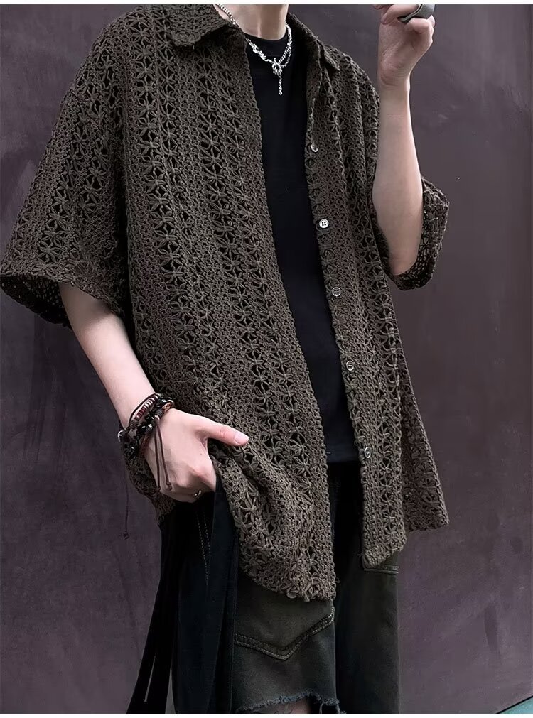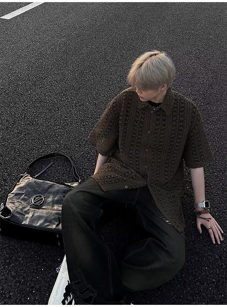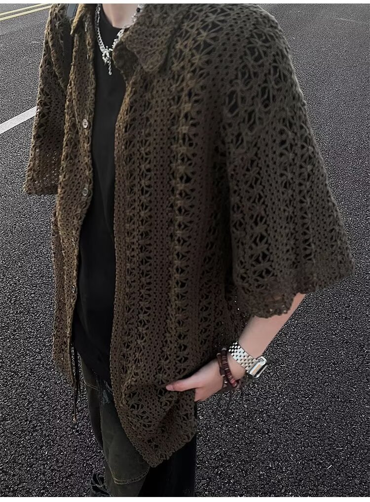 여름 아메리칸 스타일 레트로 앤티크 다목적 카키 앤티크 니트 할로우 통기성 느슨한 휴가 남성용 반팔 셔츠스토어 가기
