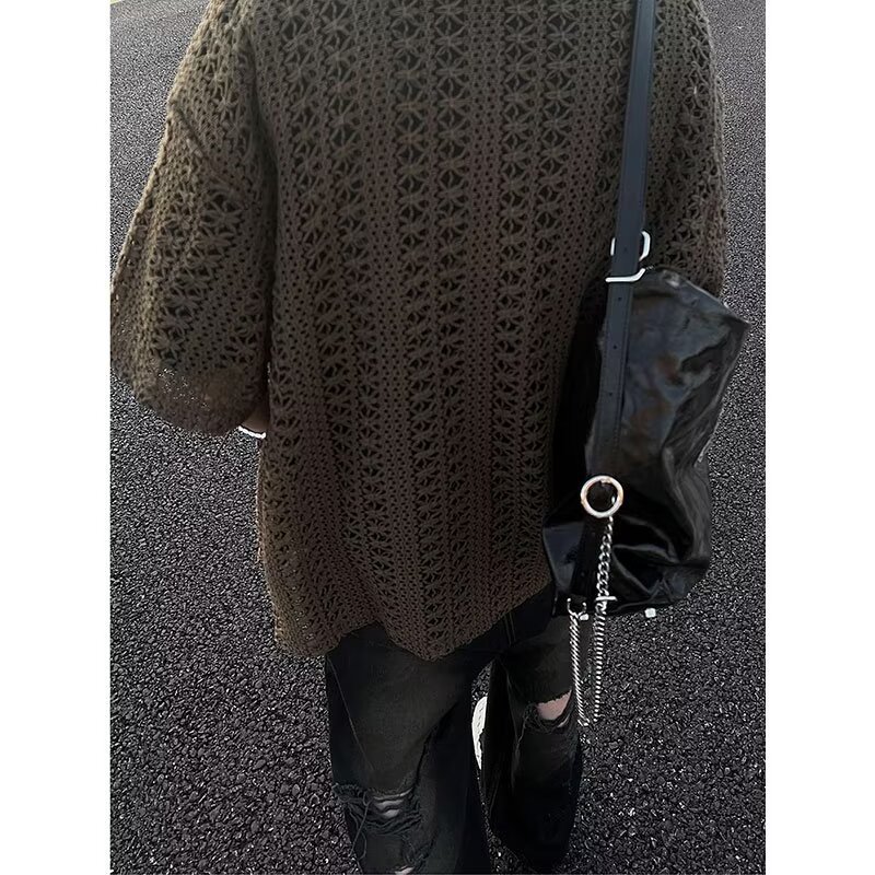 여름 아메리칸 스타일 레트로 앤티크 다목적 카키 앤티크 니트 할로우 통기성 느슨한 휴가 남성용 반팔 셔츠