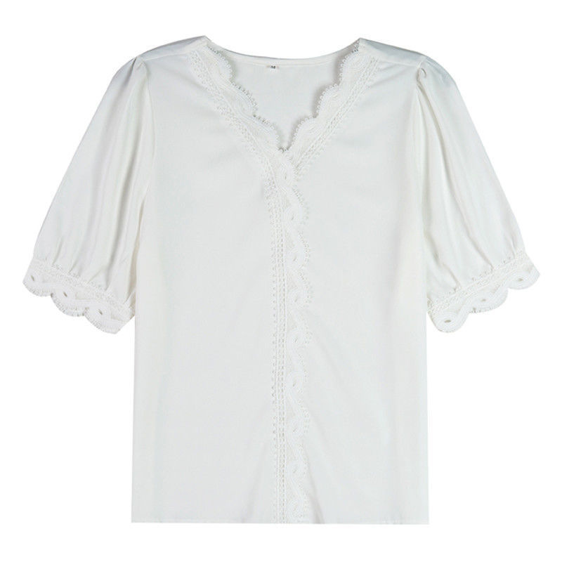 여자 V 넥 레이스 바느질 느슨한 반팔 티셔츠 여름 레이디 우아한 하이 엔드베이스 셔츠 올매치 탑스토어 가기