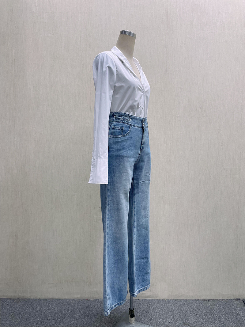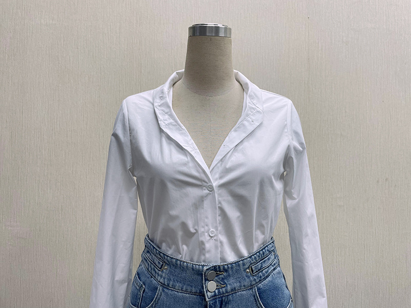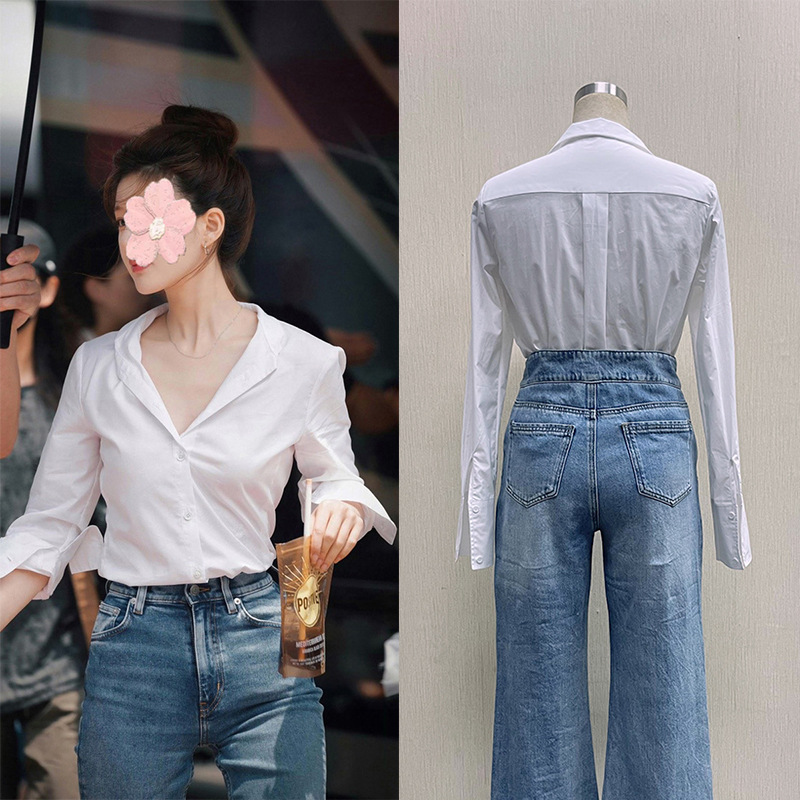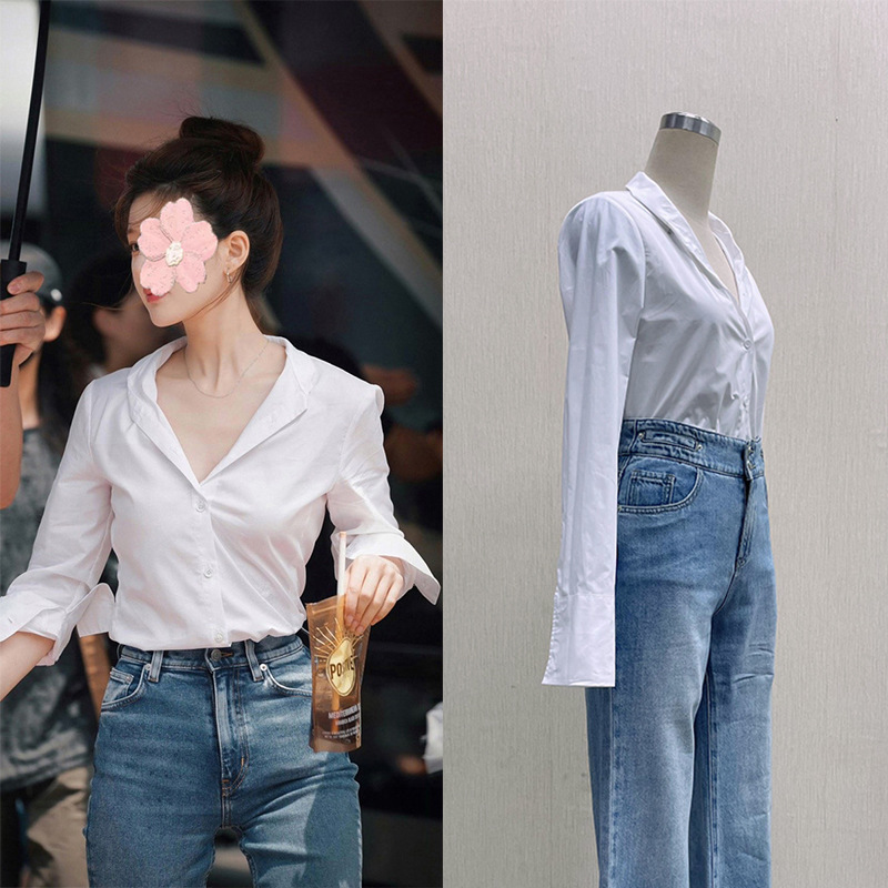 조루시, 서옌과 같은 스타일의 흰색 셔츠, 여성용 흰색 상의, 프렌치 스타일 셔츠, 브이넥, 고급스러운 느낌, 슬림핏, 허리라인 강조