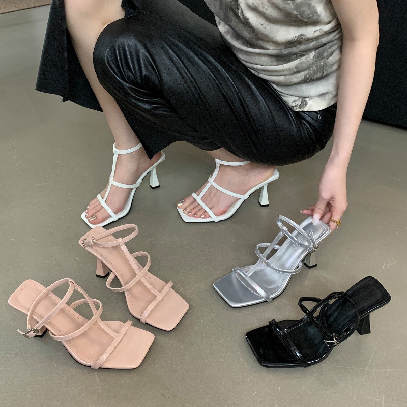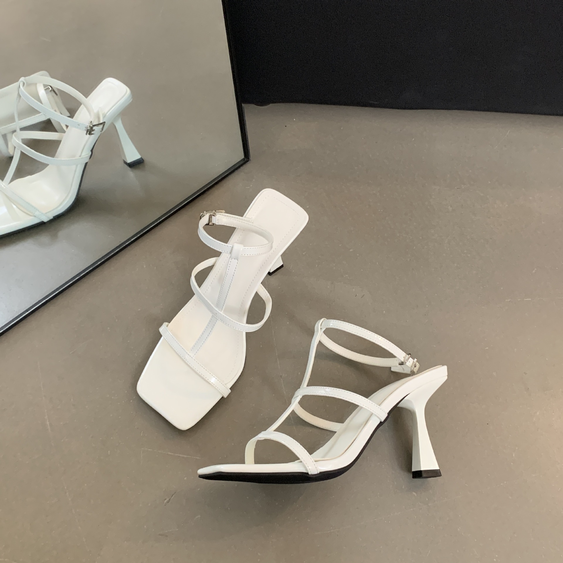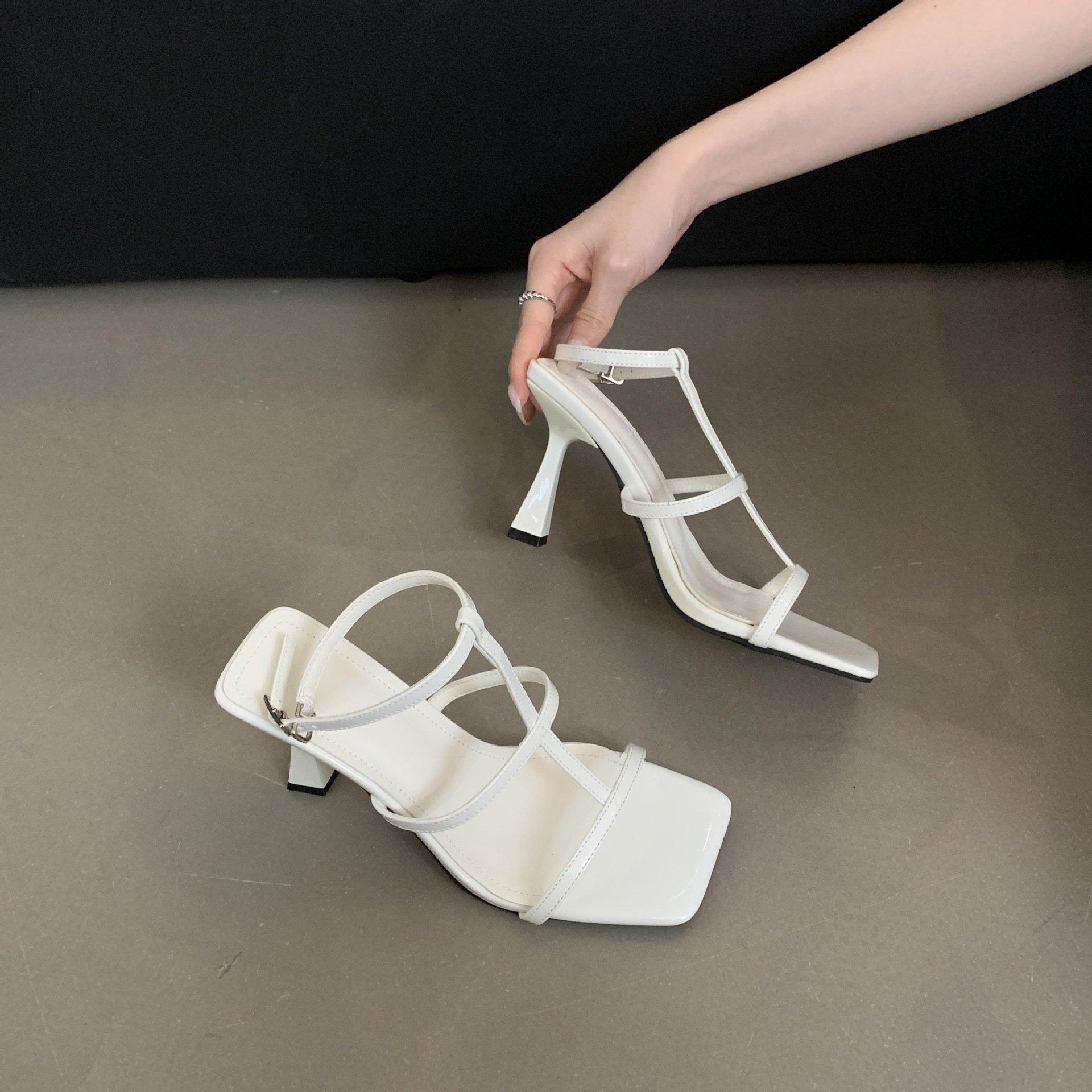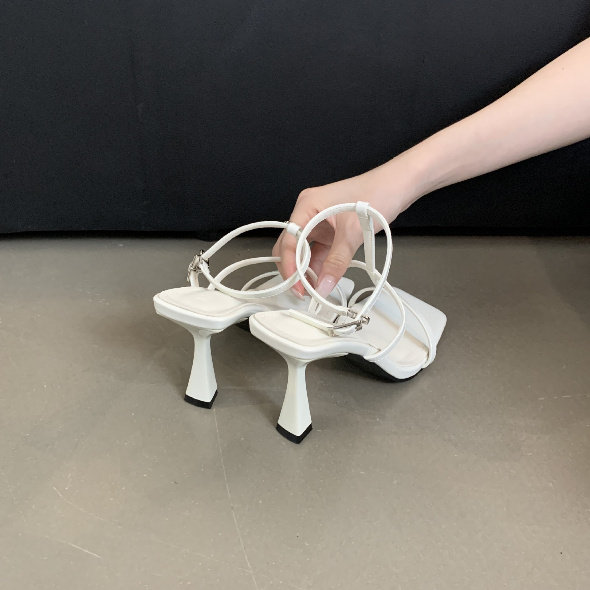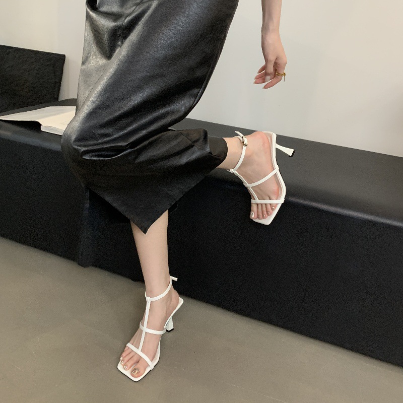【세금 미포함】2024년 신상 프렌치 스타일 화이트 스트랩 샌들, 스퀘어 토, 얇은 굽, 하이힐, 여성스러운 분위기