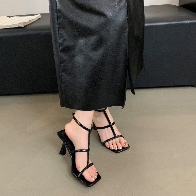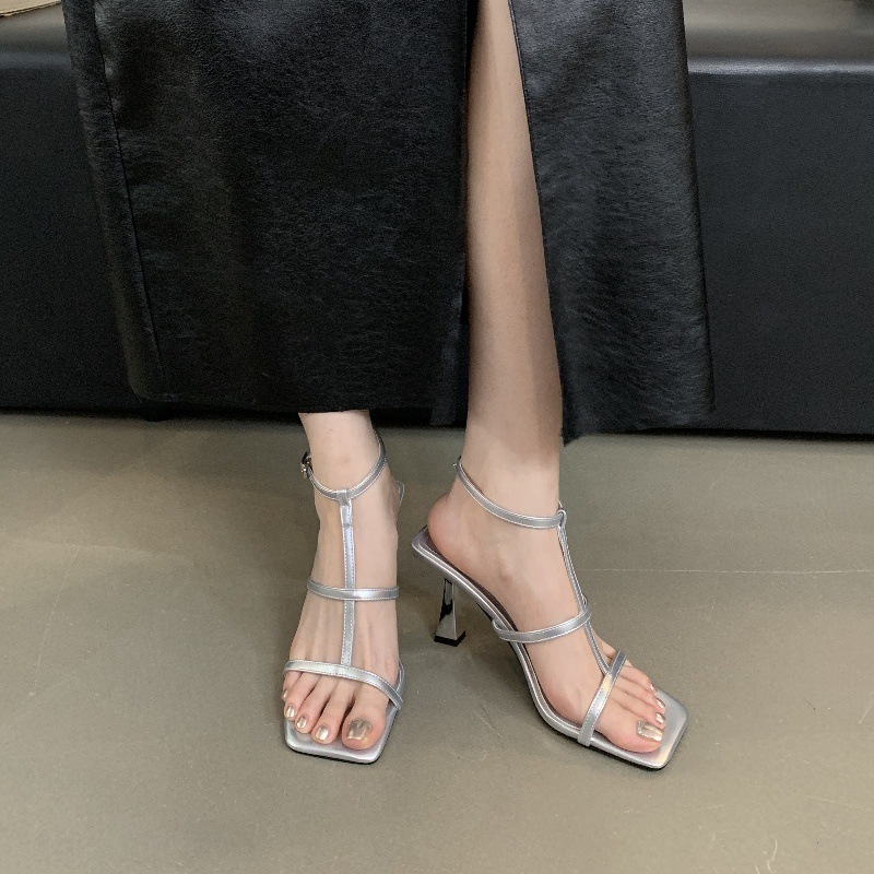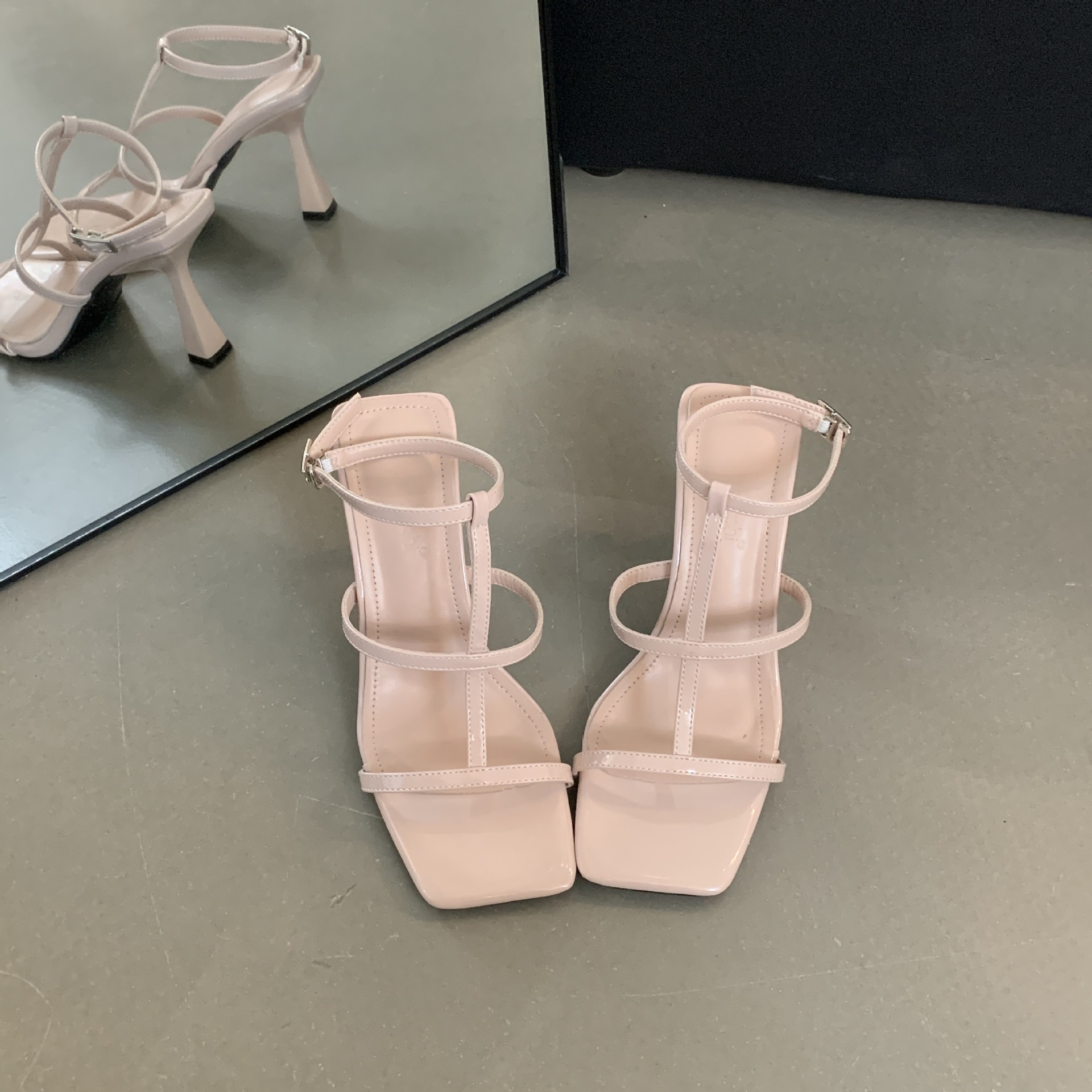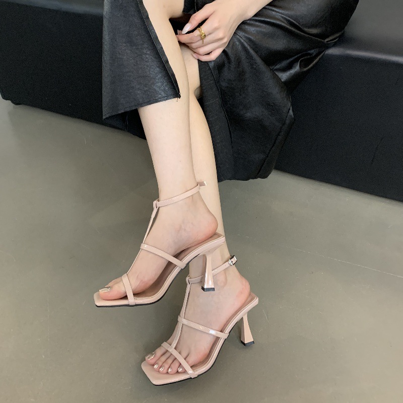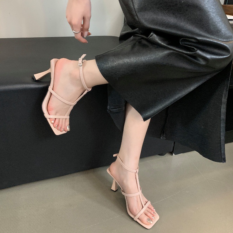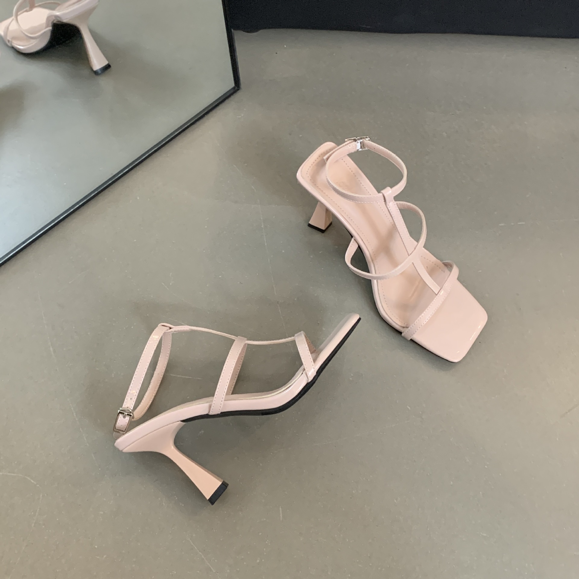 【세금 미포함】2024년 신상 프렌치 스타일 화이트 스트랩 샌들, 스퀘어 토, 얇은 굽, 하이힐, 여성스러운 분위기
