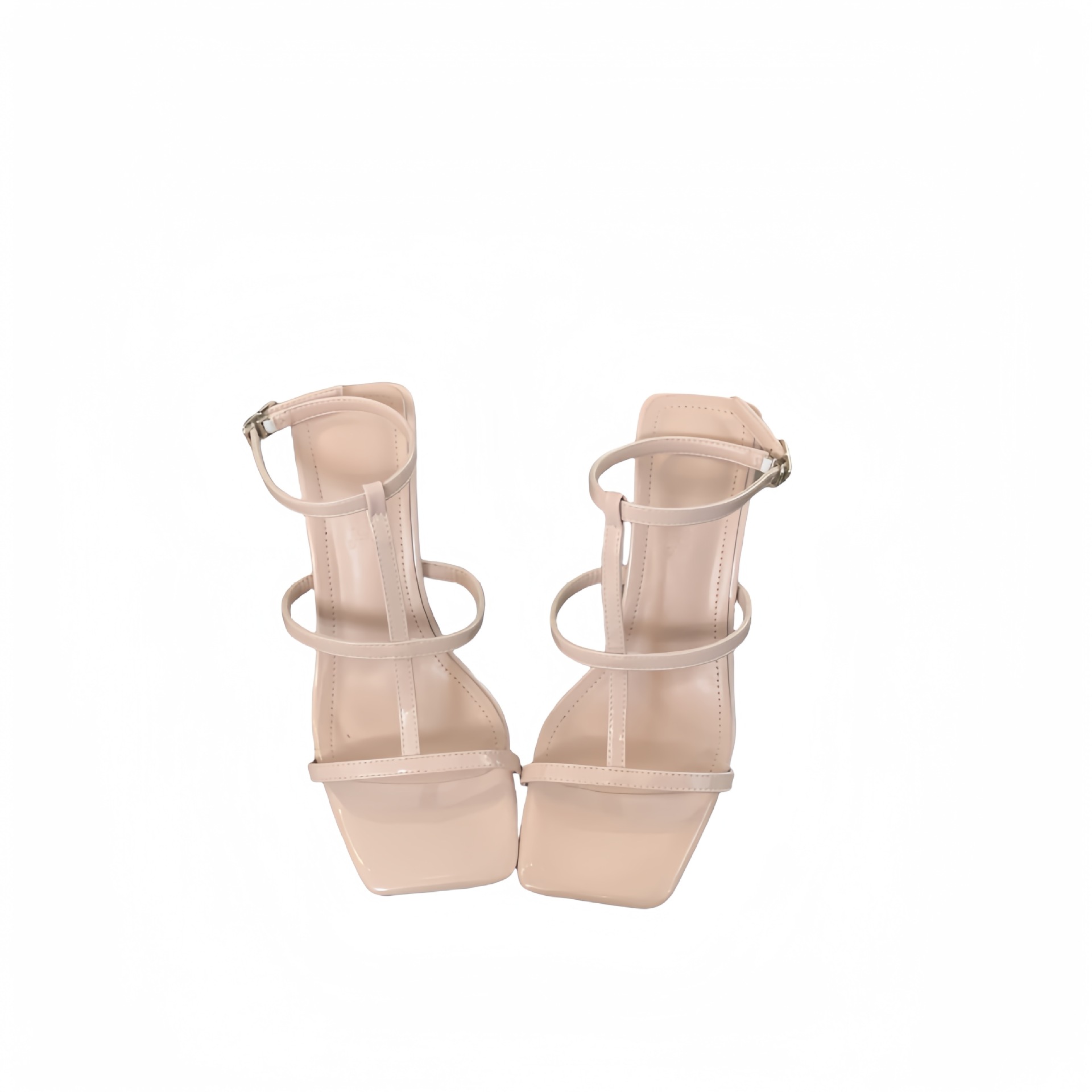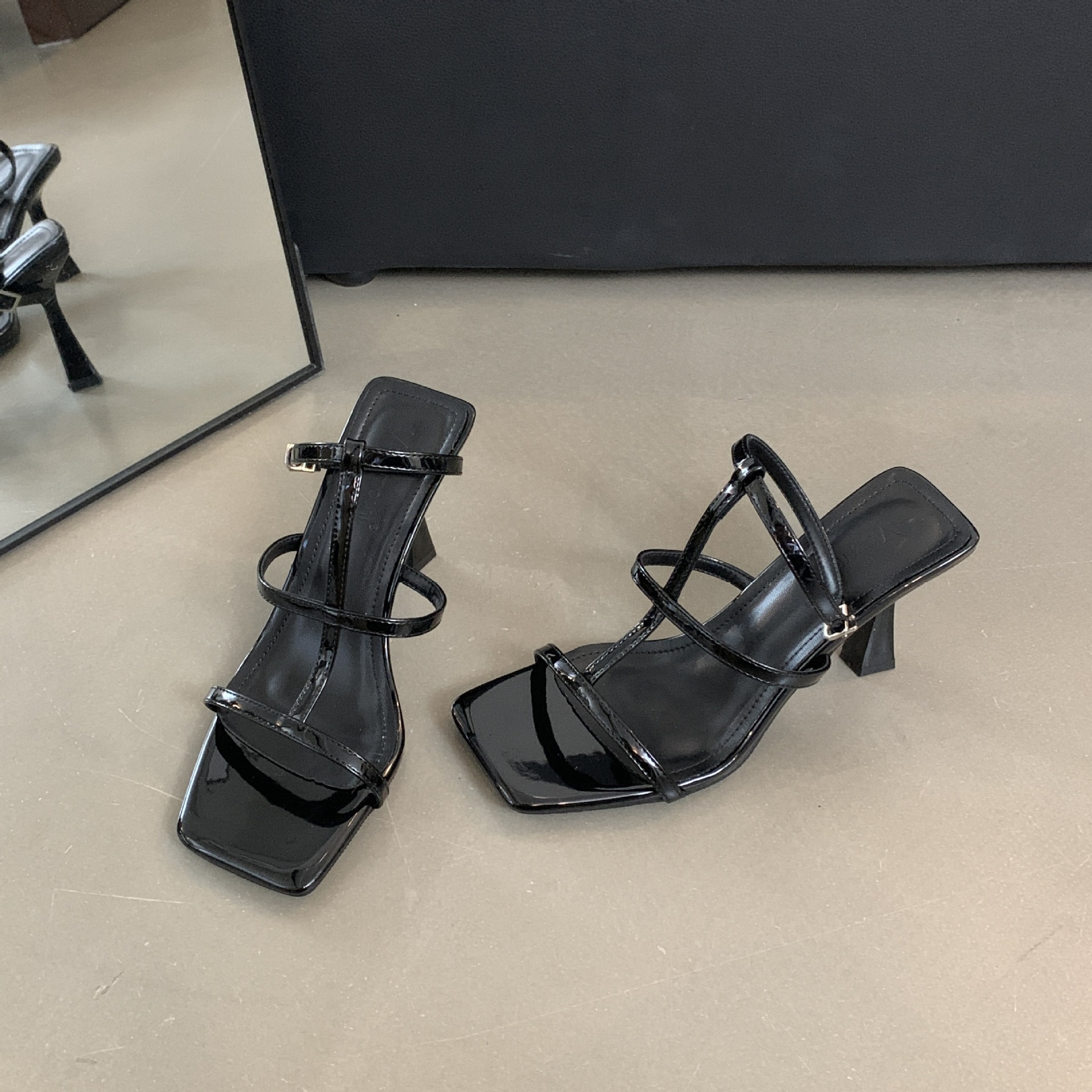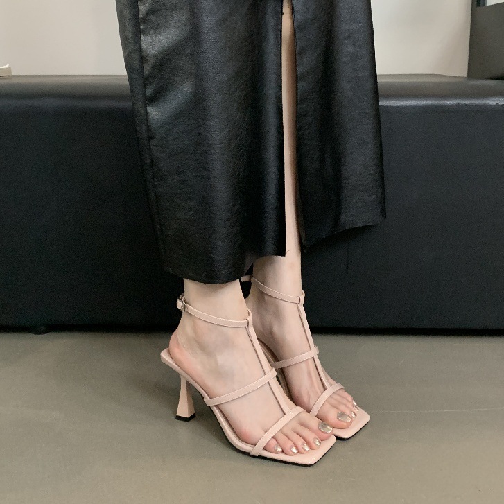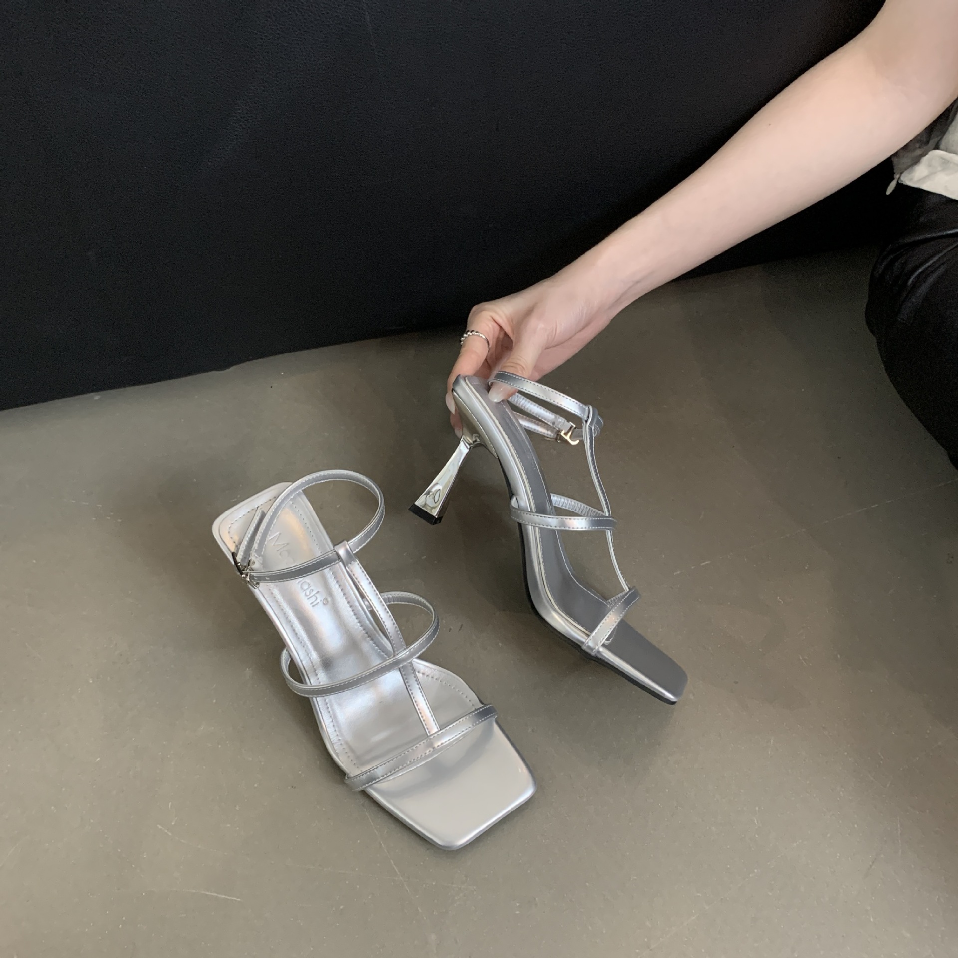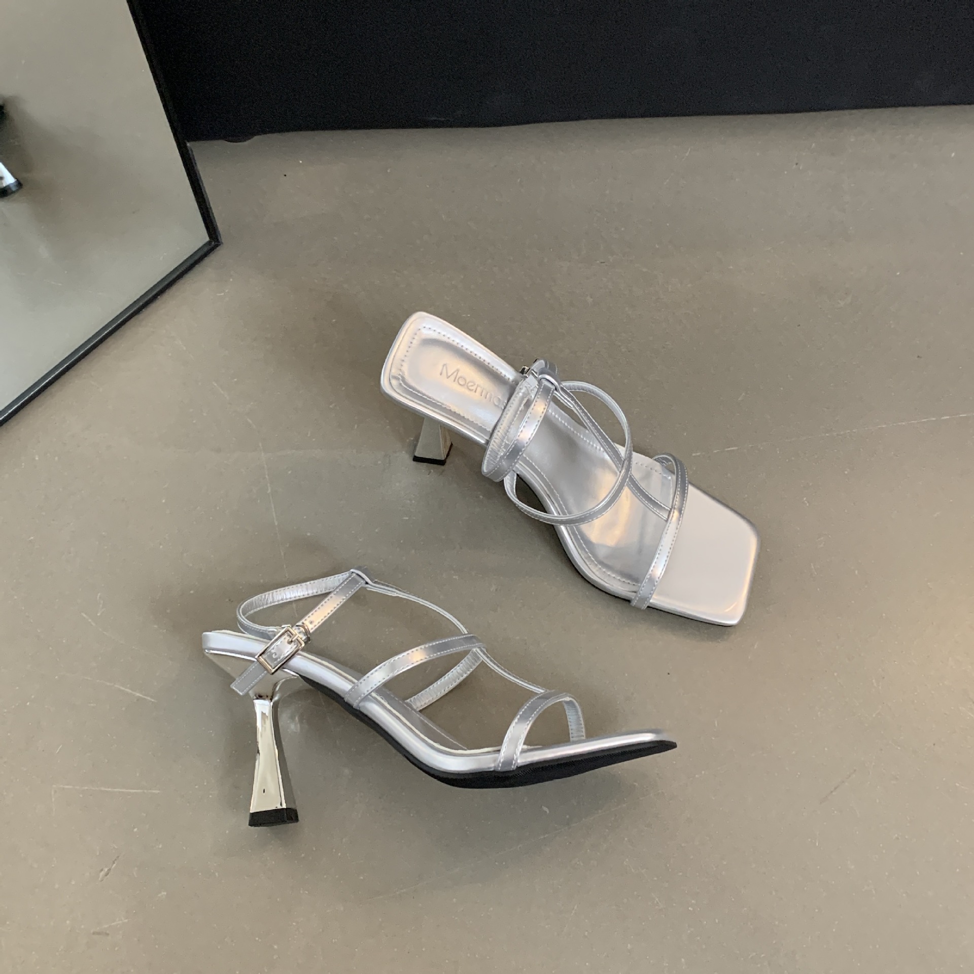 【세금 미포함】2024년 신상 프렌치 스타일 화이트 스트랩 샌들, 스퀘어 토, 얇은 굽, 하이힐, 여성스러운 분위기