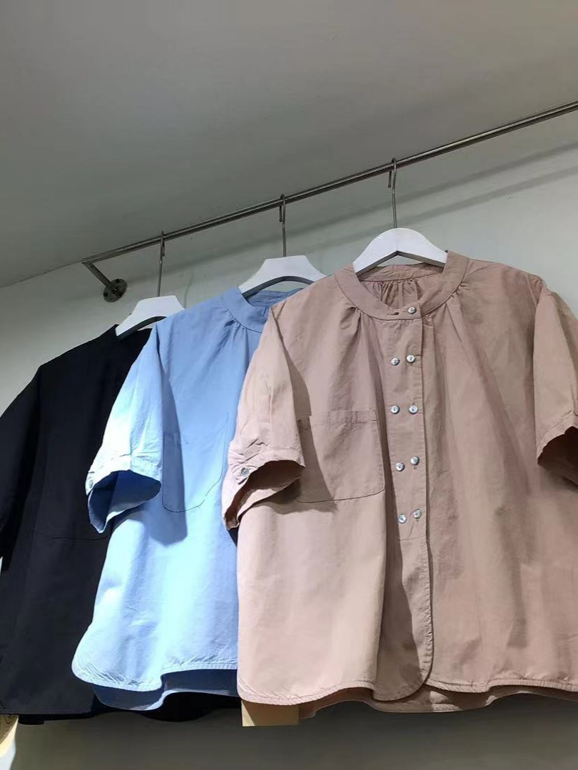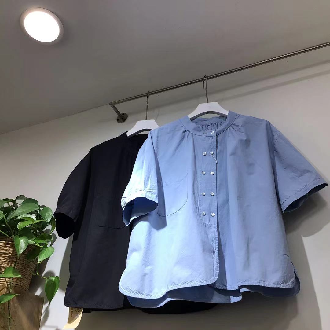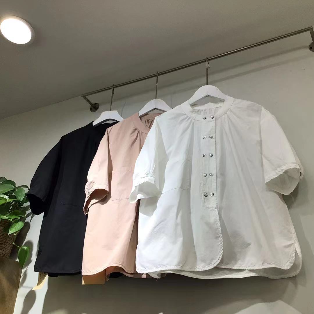 2024 년 여름 새로운 반팔 셔츠 통근 우아한 수직 칼라 솔리드 컬러 여성을위한 올 매치 더블 브레스트 탑