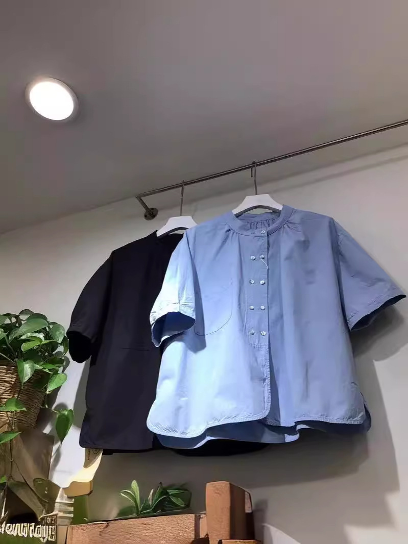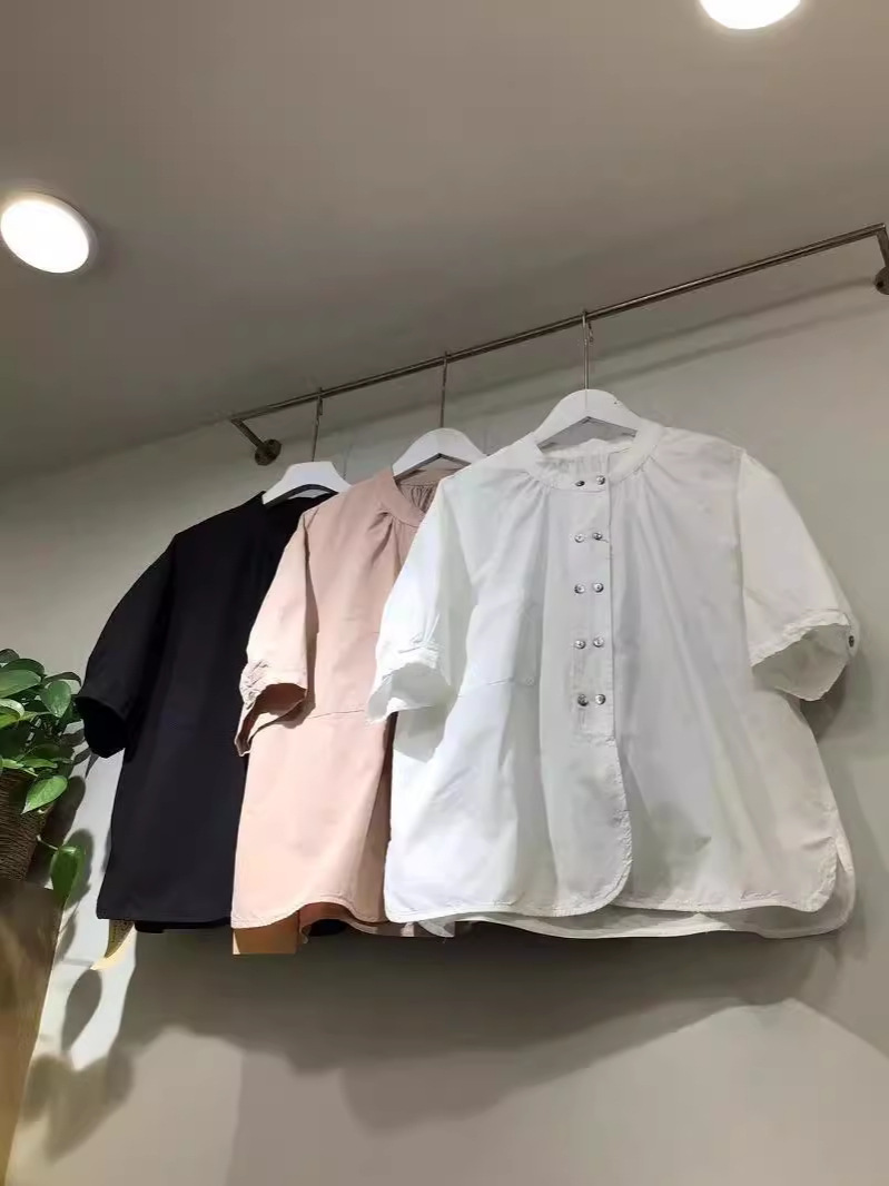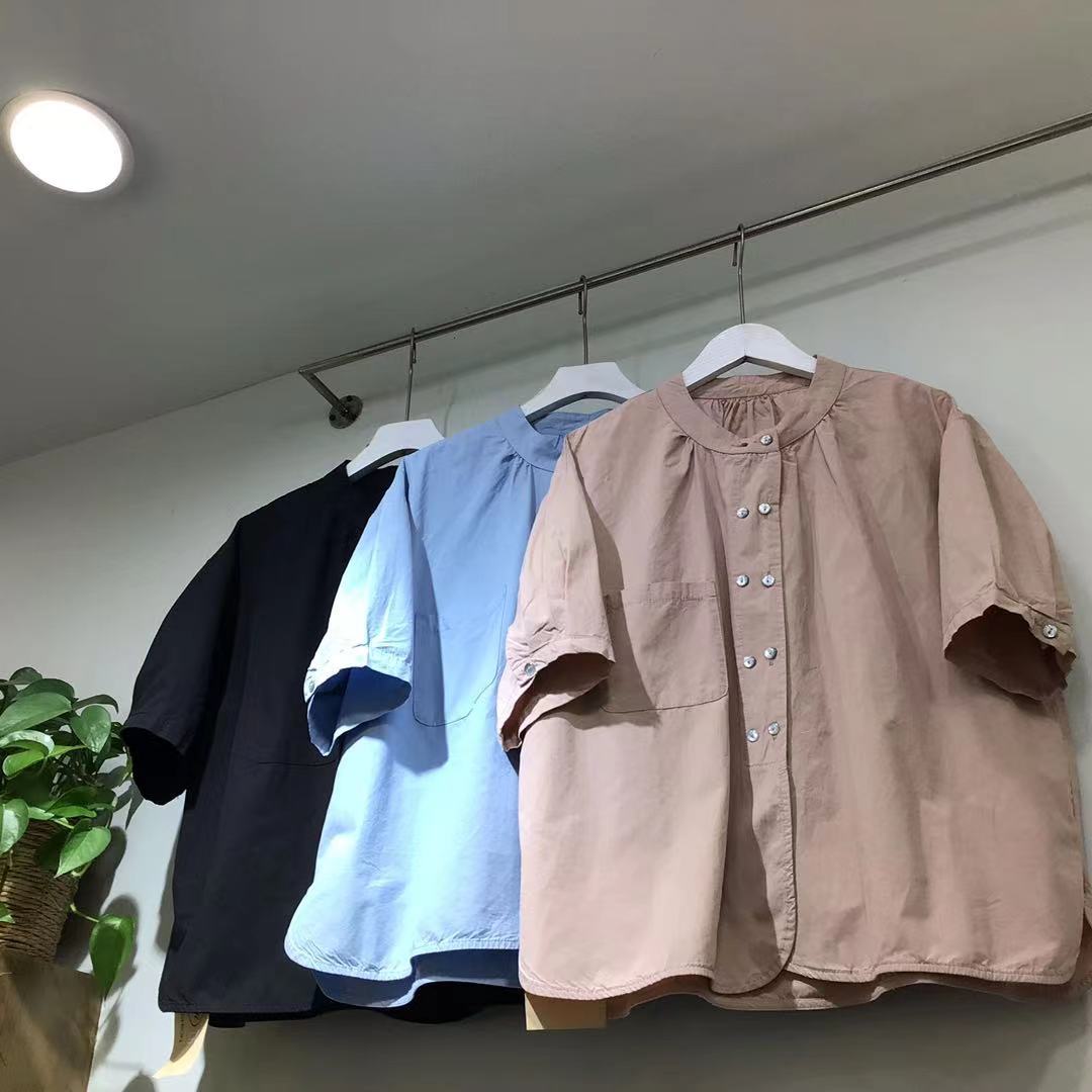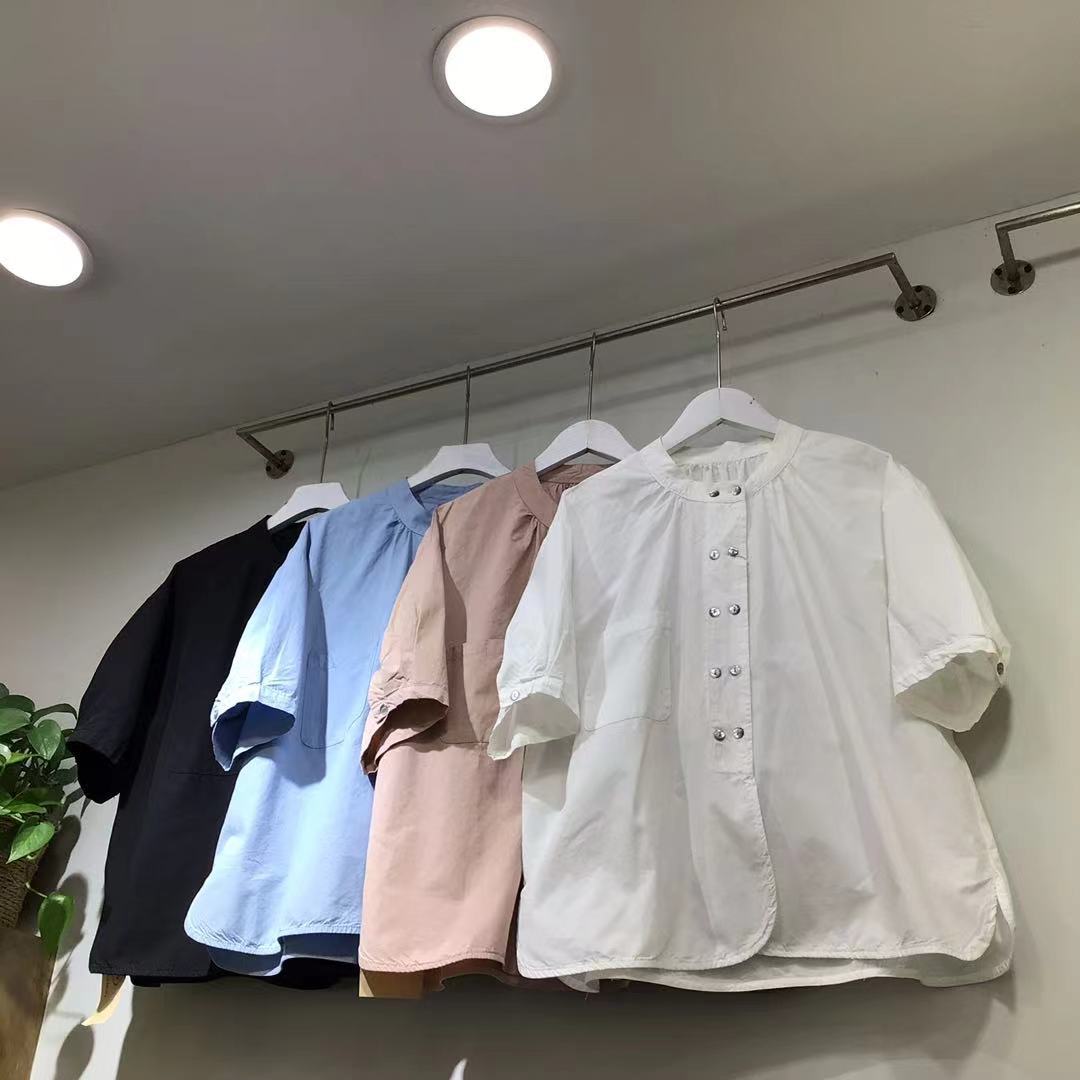2024 년 여름 새로운 반팔 셔츠 통근 우아한 수직 칼라 솔리드 컬러 여성을위한 올 매치 더블 브레스트 탑