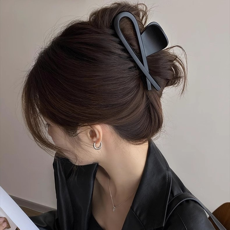 高级感缎面大号黑色蝴蝶结鲨鱼夹头饰方形钻后脑勺发夹抓夹女发卡