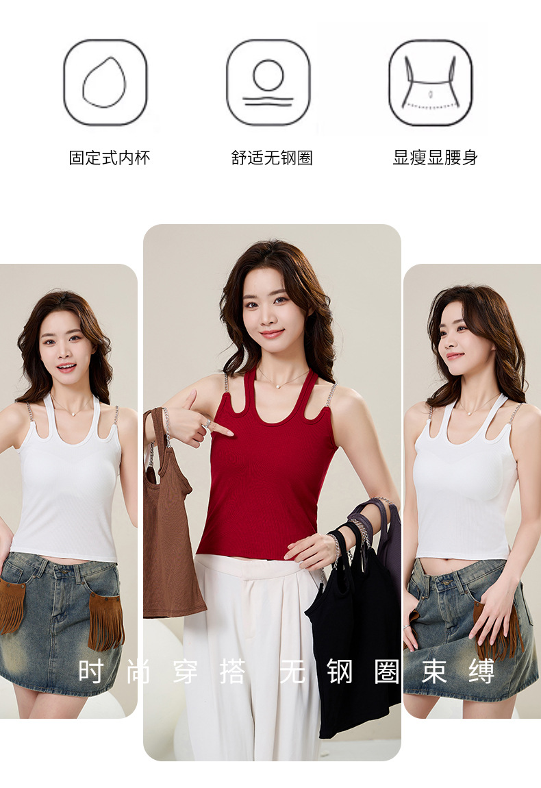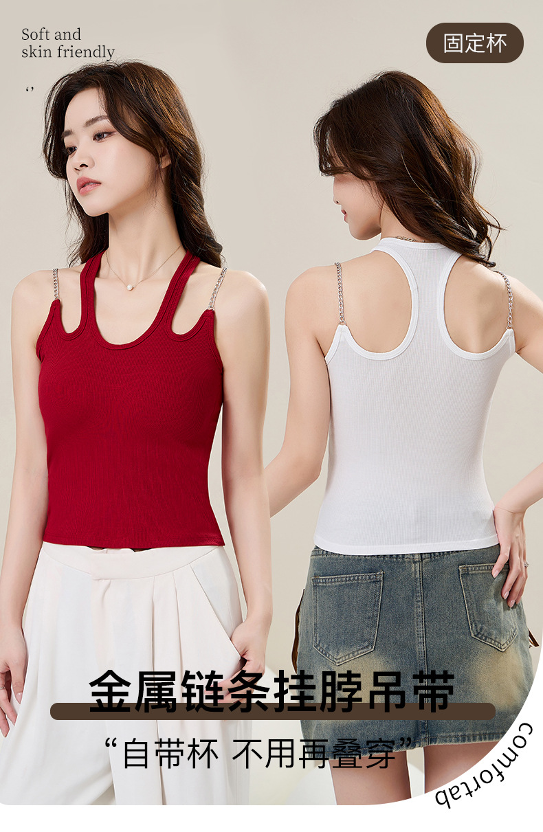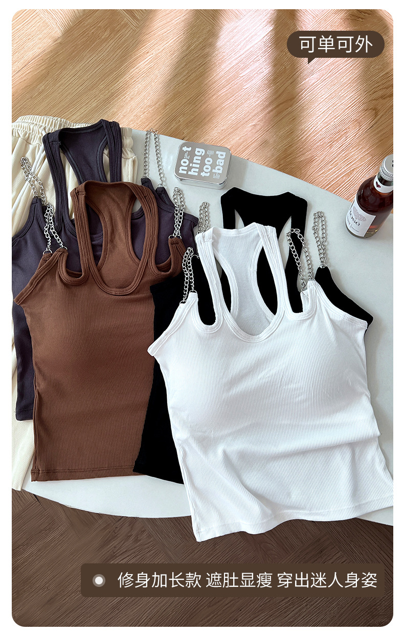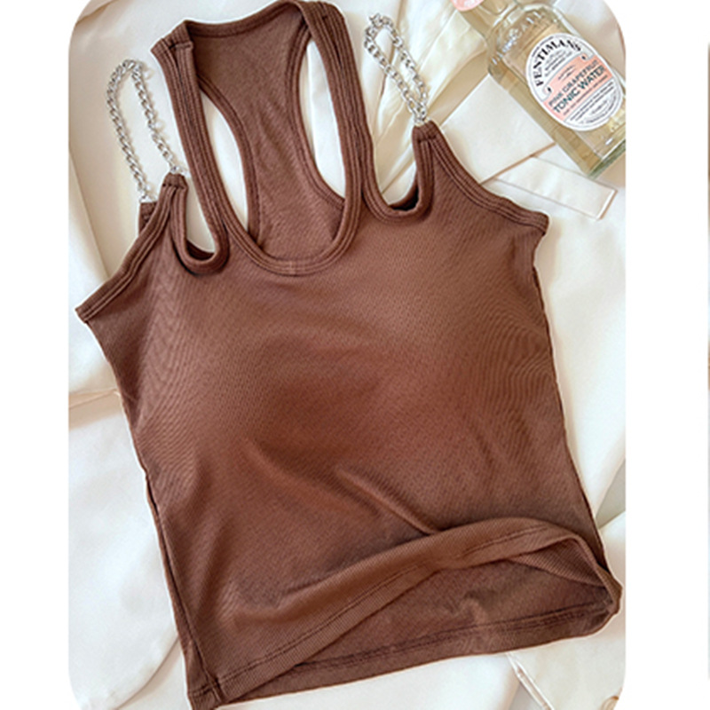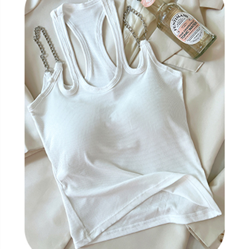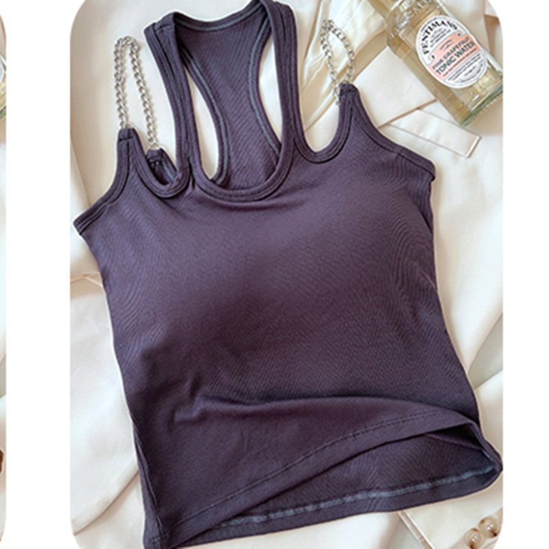 여름 새로운 스파이스 걸스 카미 솔 여성 아우터 웨어 체인 섹시한 벨트 가슴 패드 아름다운 백 독특한 기본 탑 착용스토어 가기