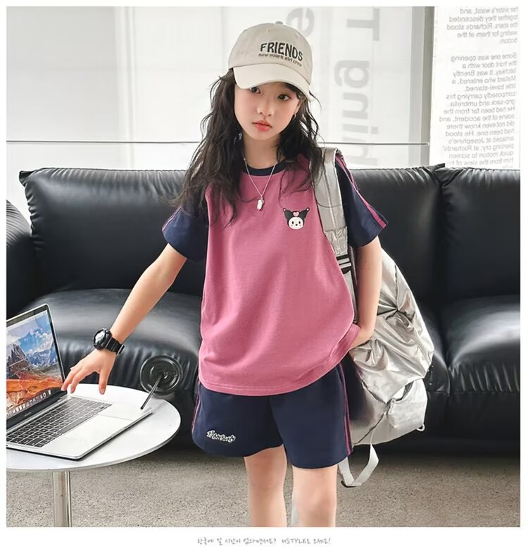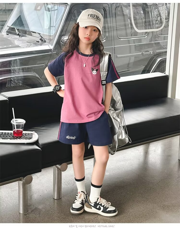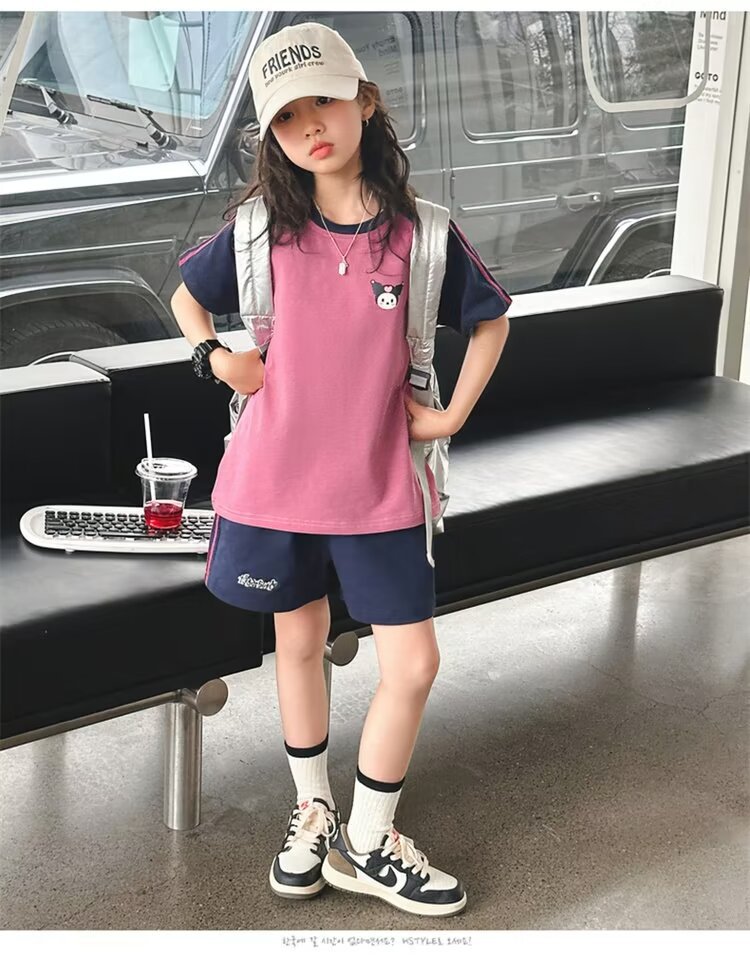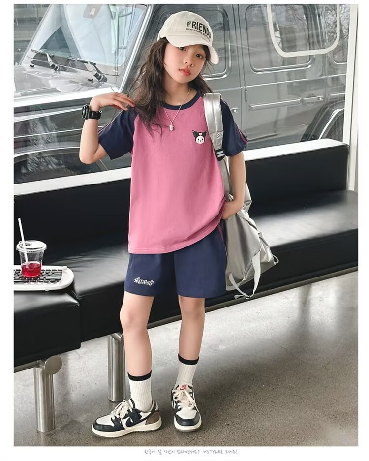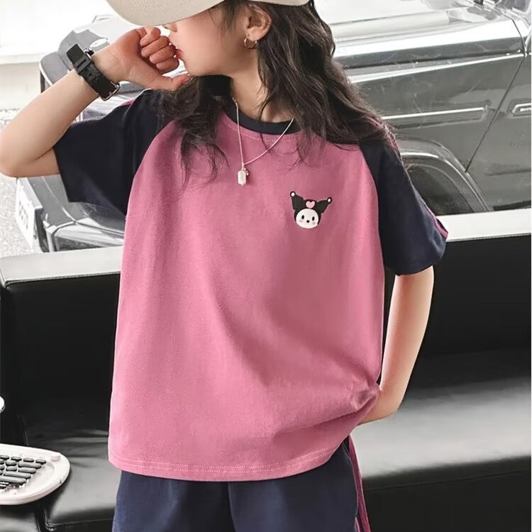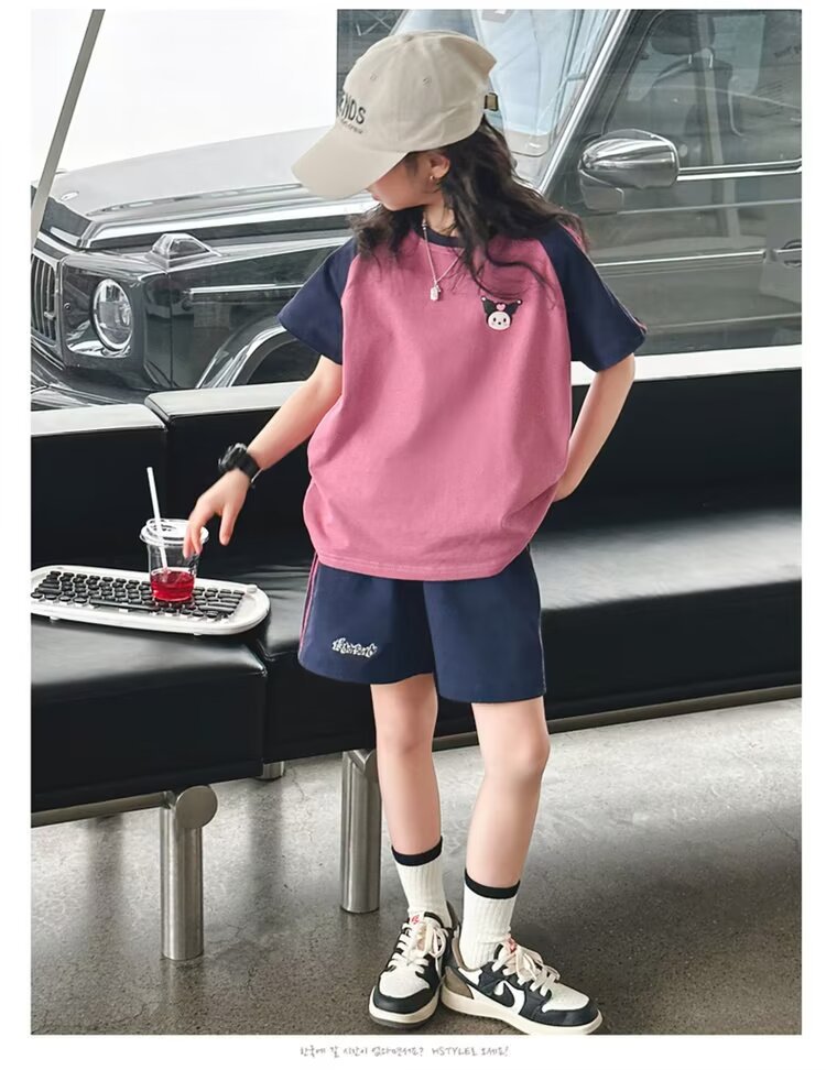 2024 년 여름 새 색상 대비 라스 어깨 둥근 목 반팔 티셔츠 어린이 세트 느슨한 캐주얼 탑스토어 가기