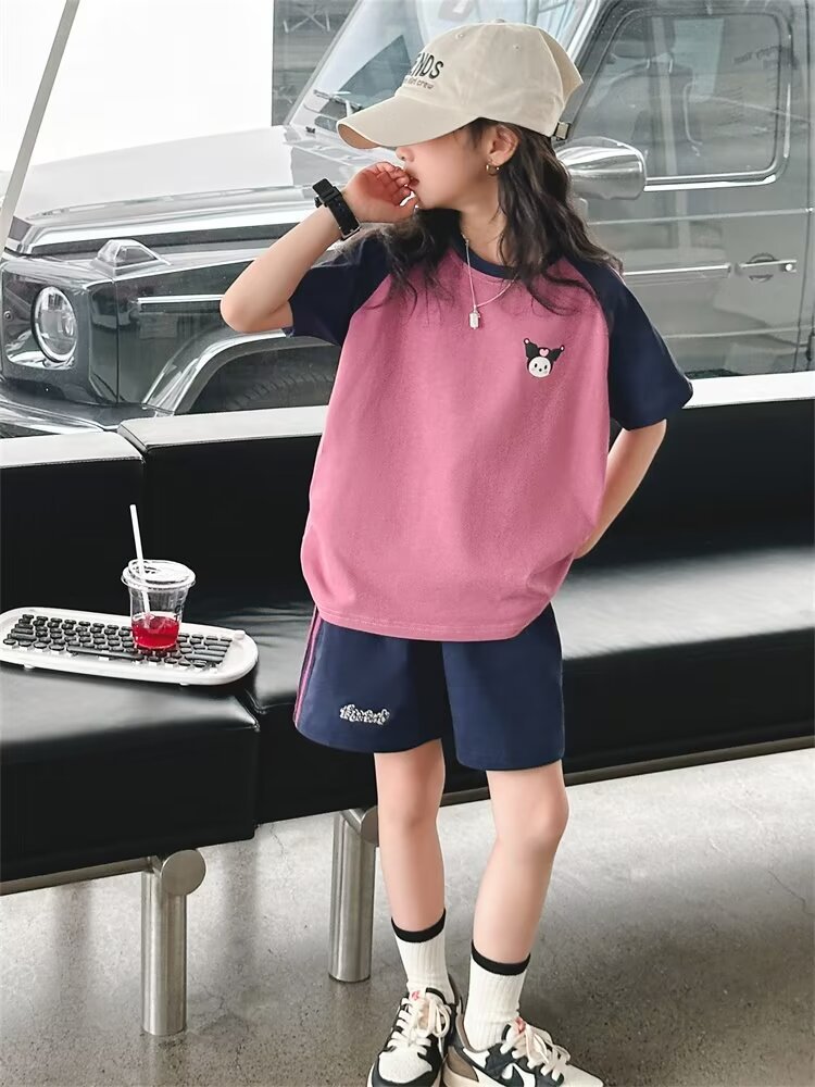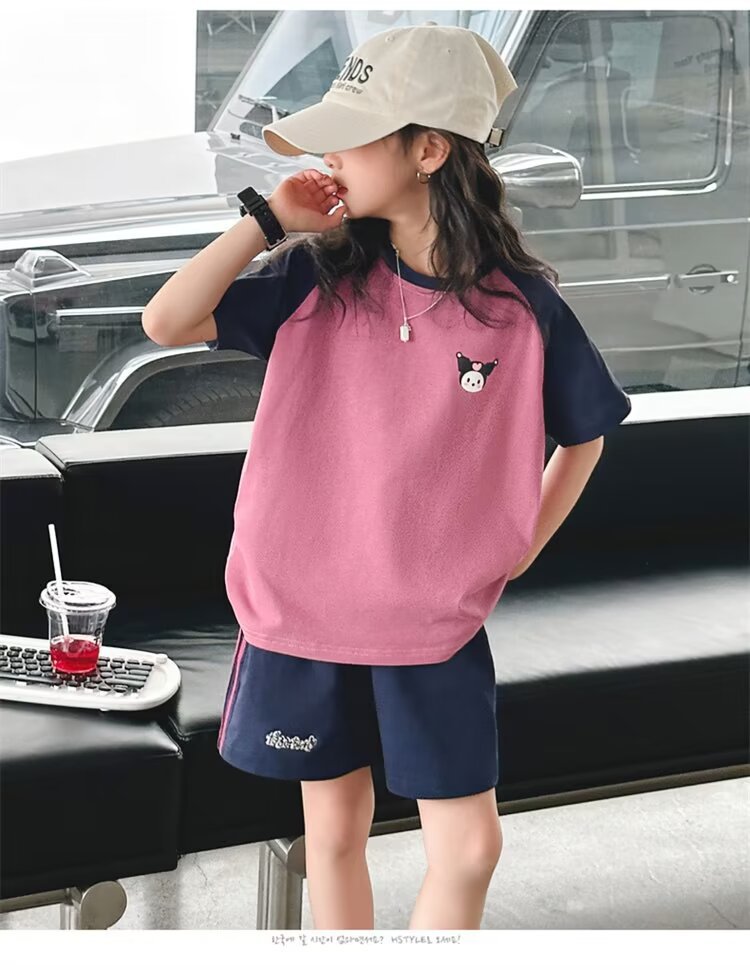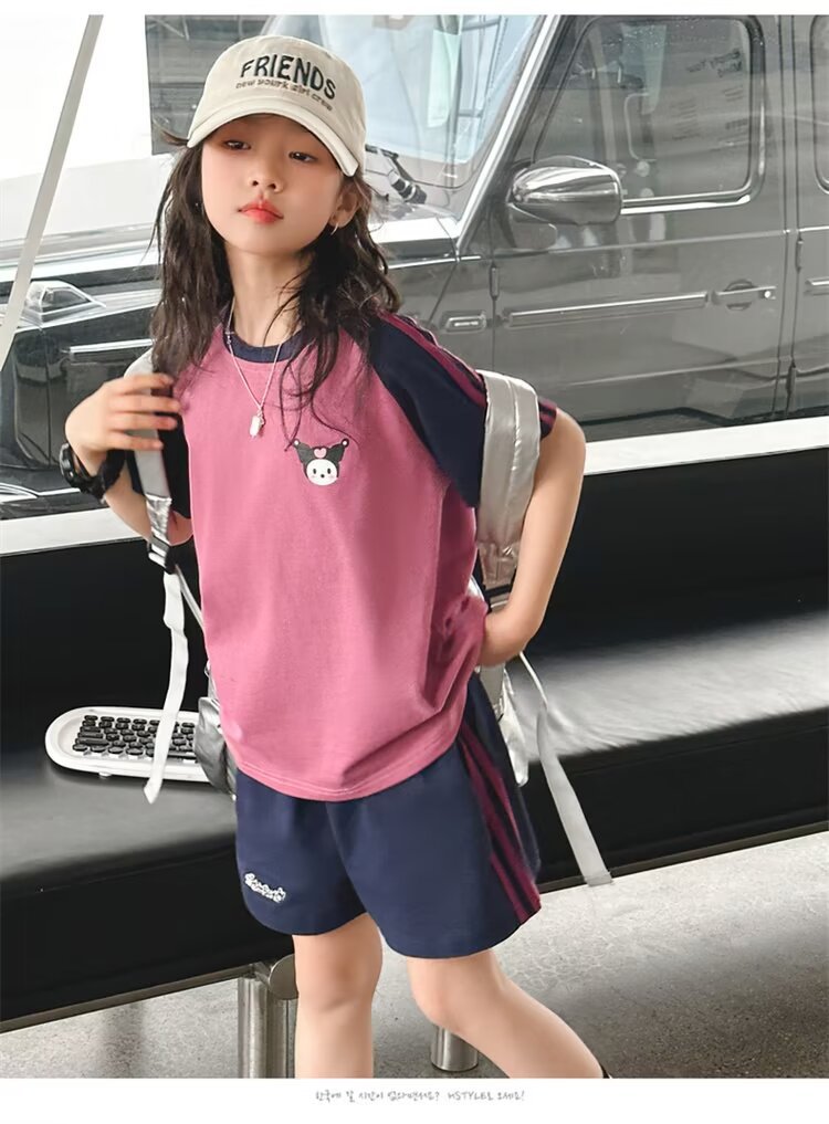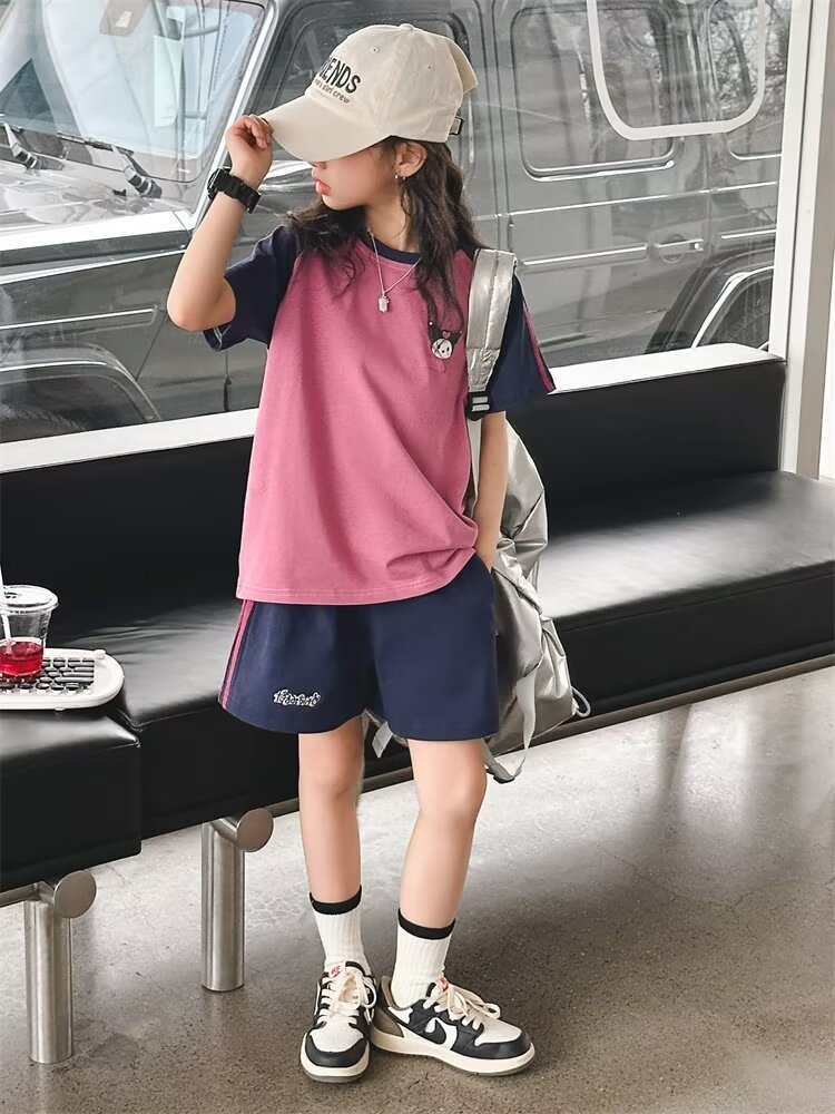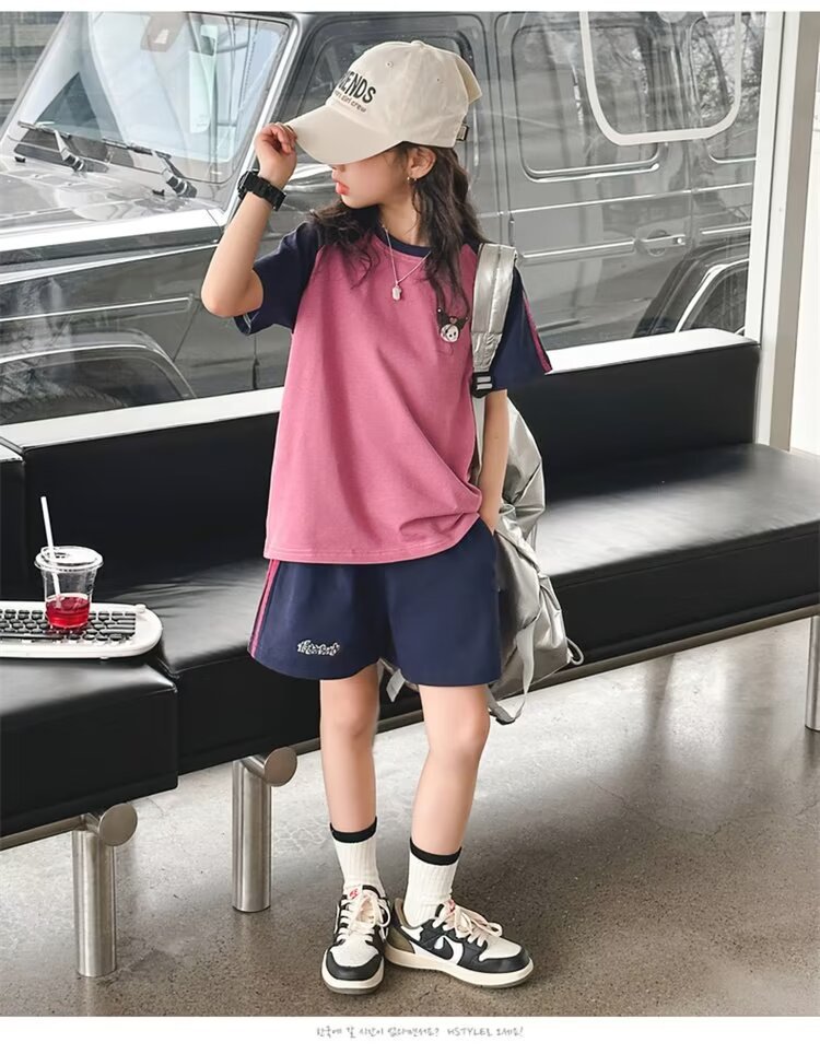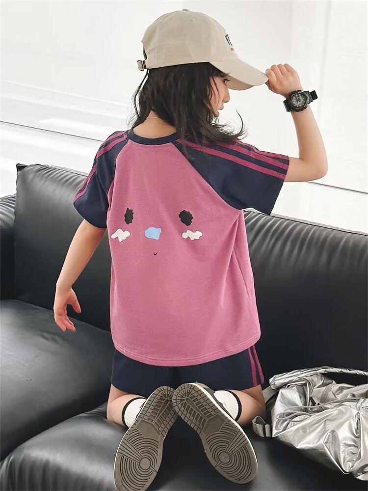2024 년 여름 새 색상 대비 라스 어깨 둥근 목 반팔 티셔츠 어린이 세트 느슨한 캐주얼 탑