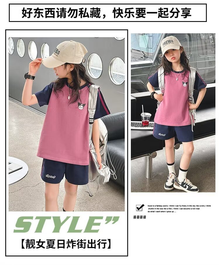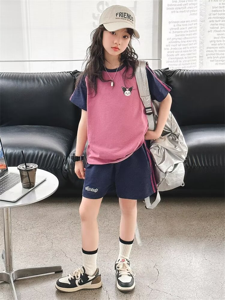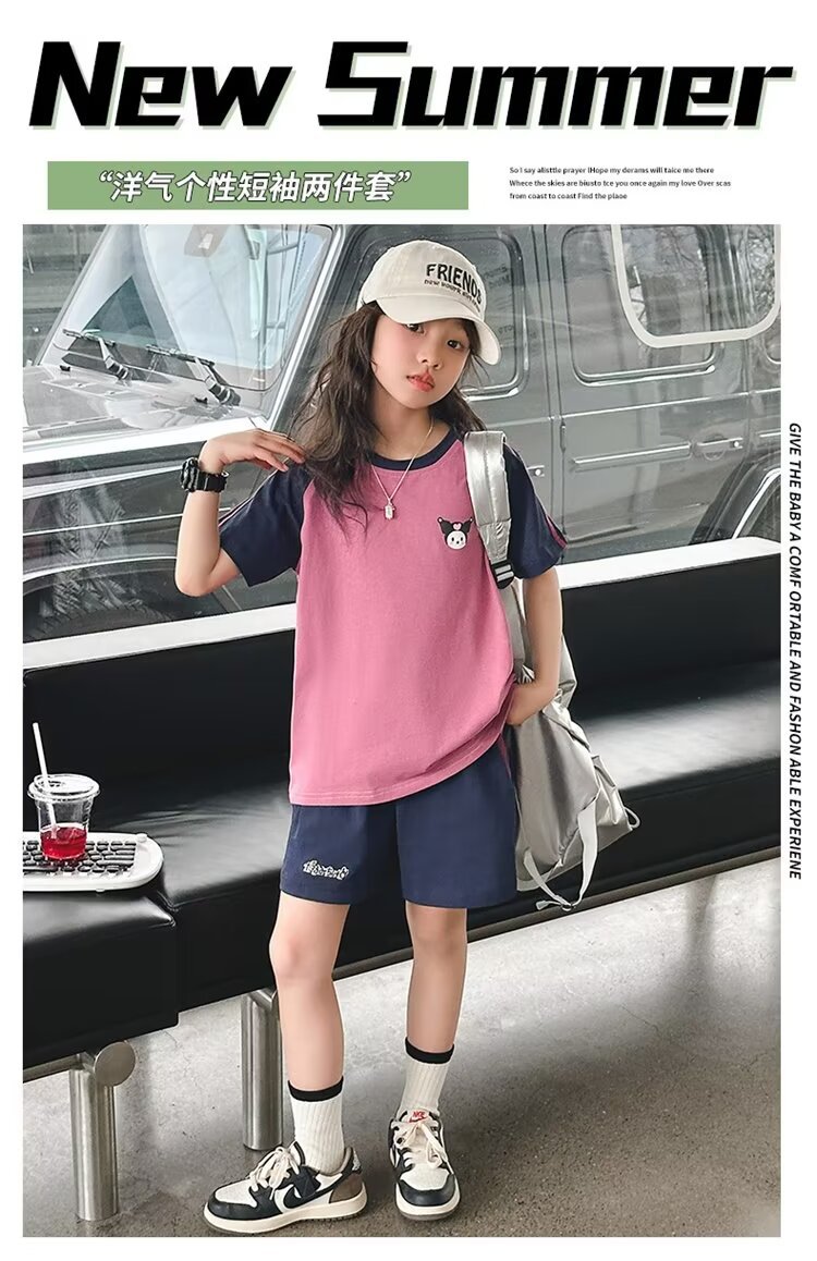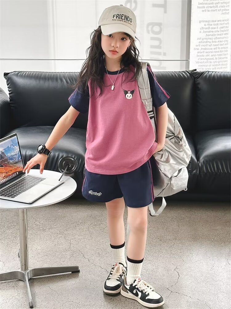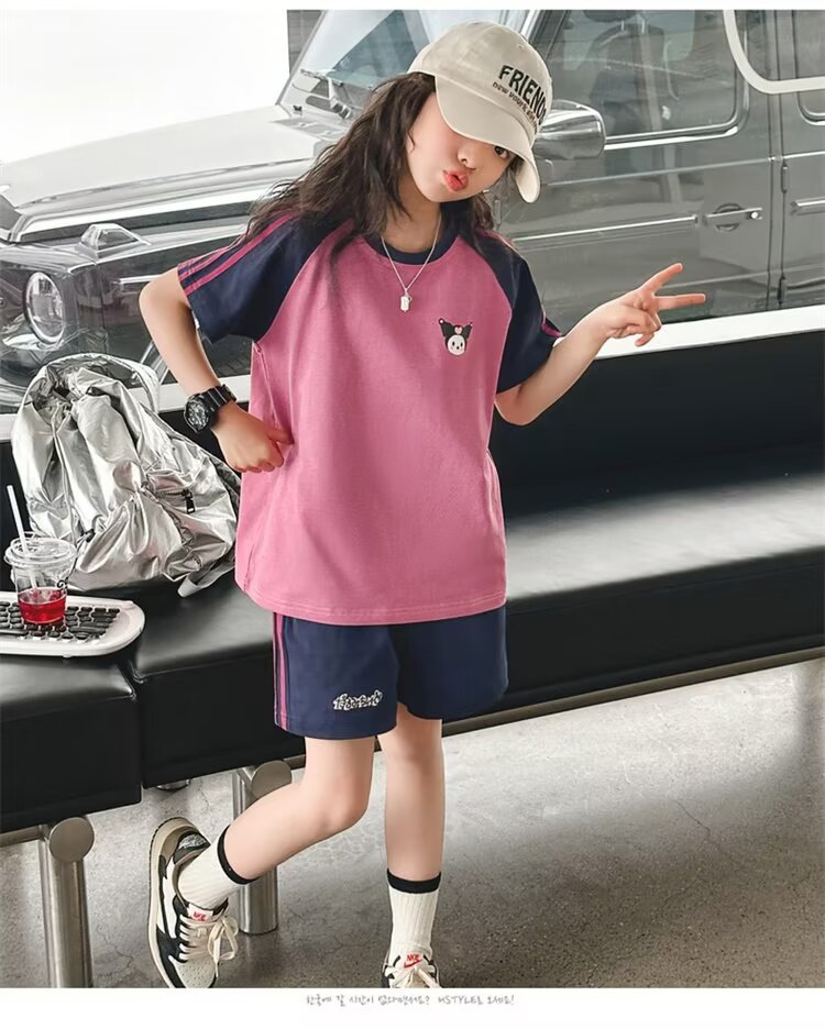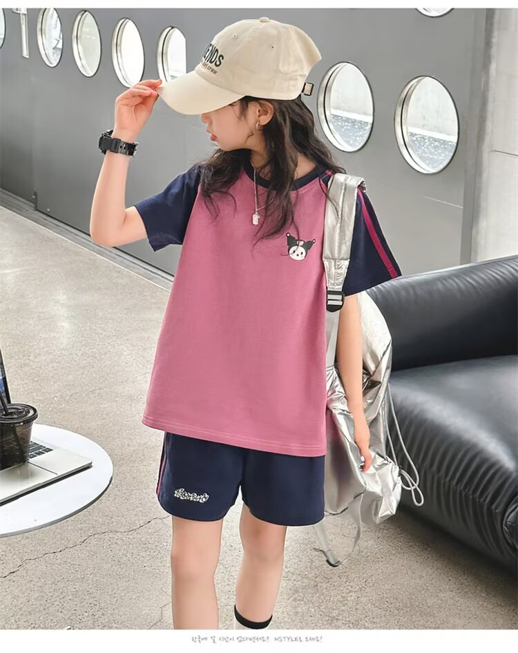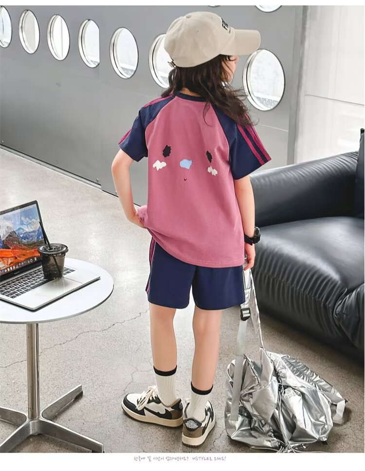 2024 년 여름 새 색상 대비 라스 어깨 둥근 목 반팔 티셔츠 어린이 세트 느슨한 캐주얼 탑