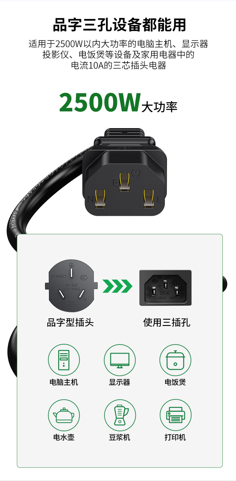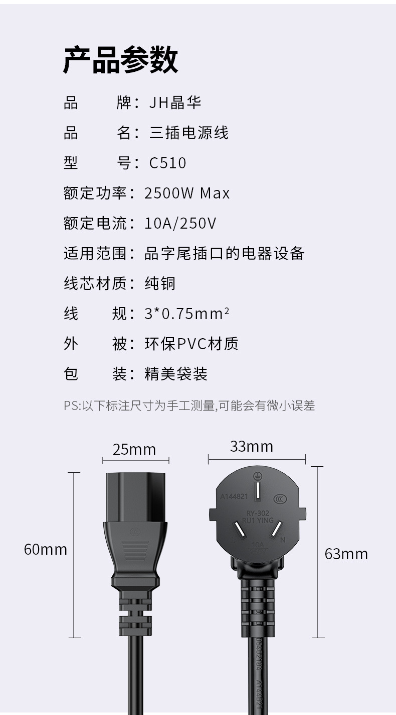 Jinghua 컴퓨터 호스트 전원 코드 3 홀 컴퓨터 모니터 밥솥 전기 주전자 프린터 워드 전원 코드