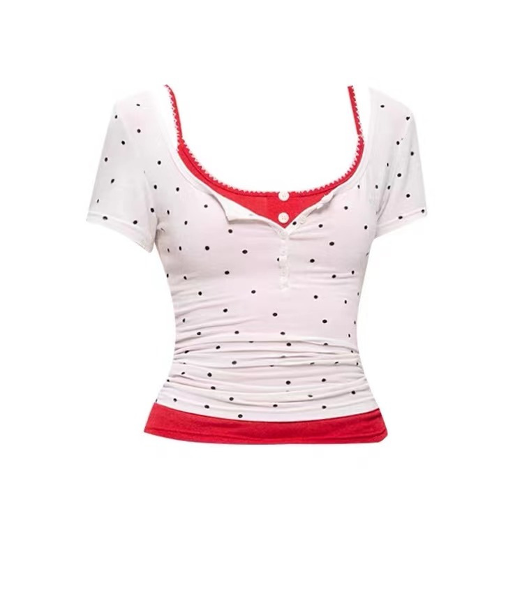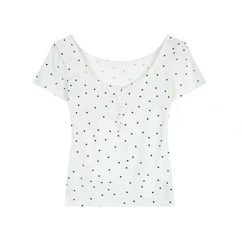 퓨어 화이트 웨이브 닷 하프 오픈 칼라 반소매 숄더 티셔츠 여성용 여름 슬림 슬리밍 스파이스 걸 탑 투피스 세트스토어 가기