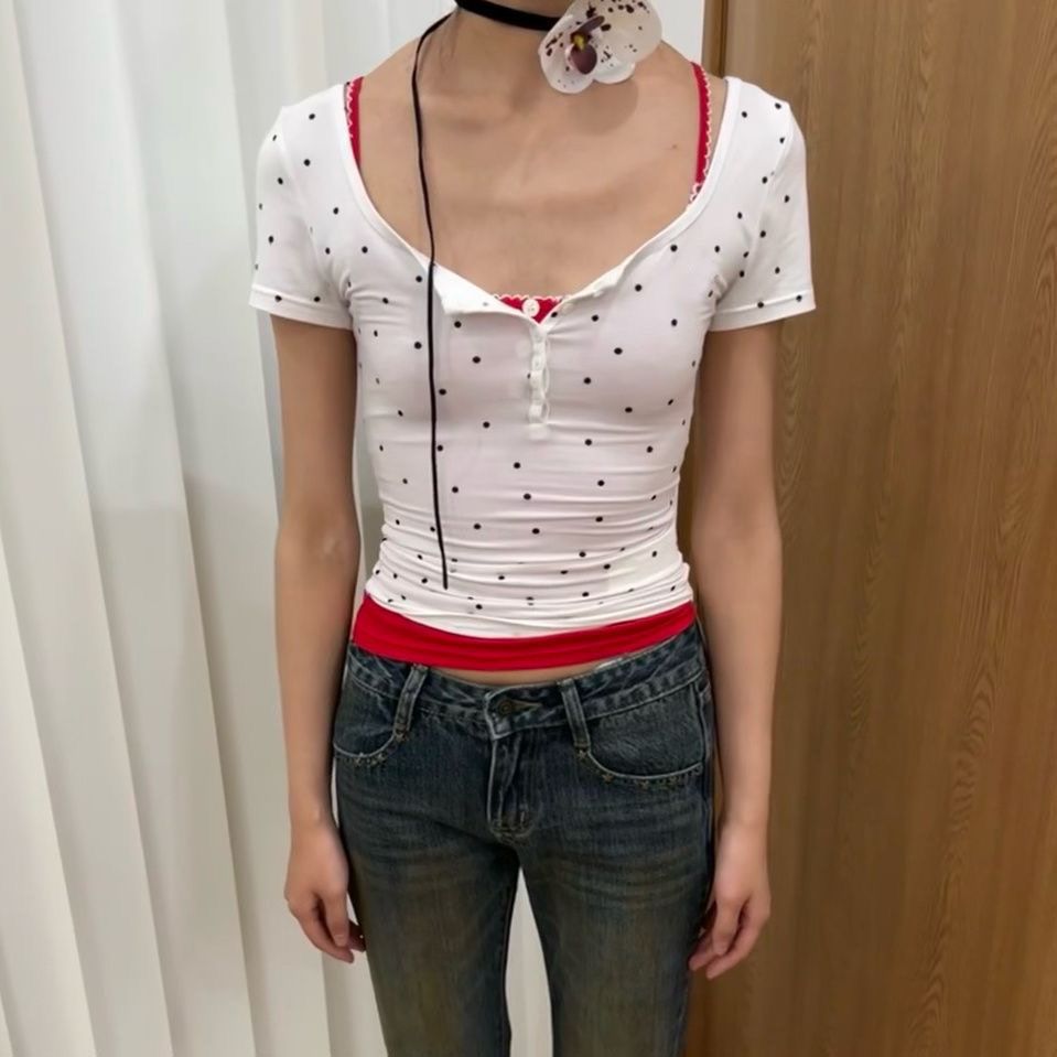 퓨어 화이트 웨이브 닷 하프 오픈 칼라 반소매 숄더 티셔츠 여성용 여름 슬림 슬리밍 스파이스 걸 탑 투피스 세트