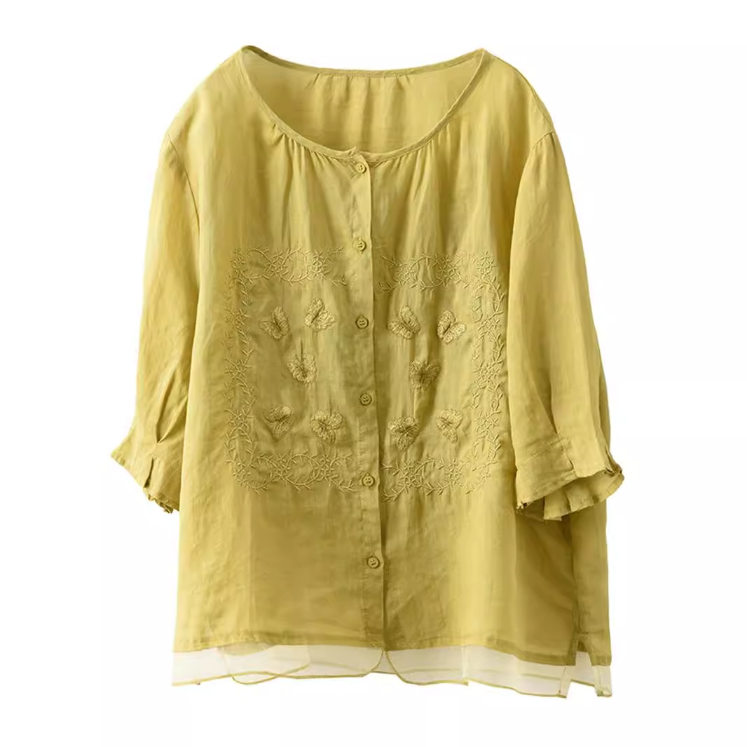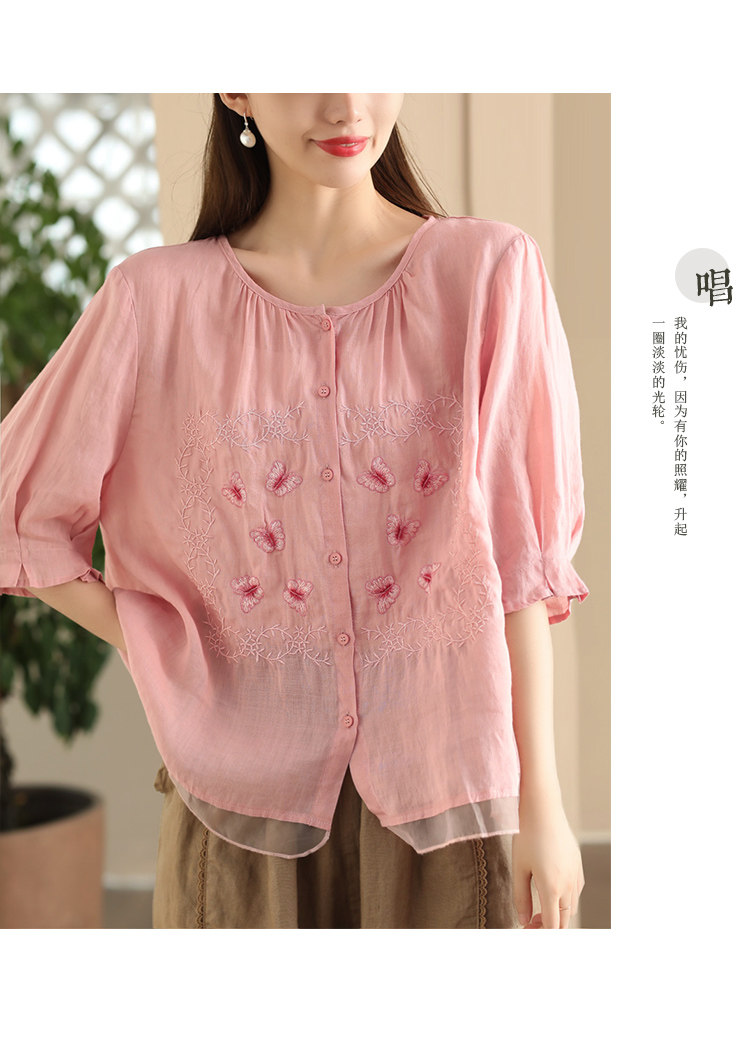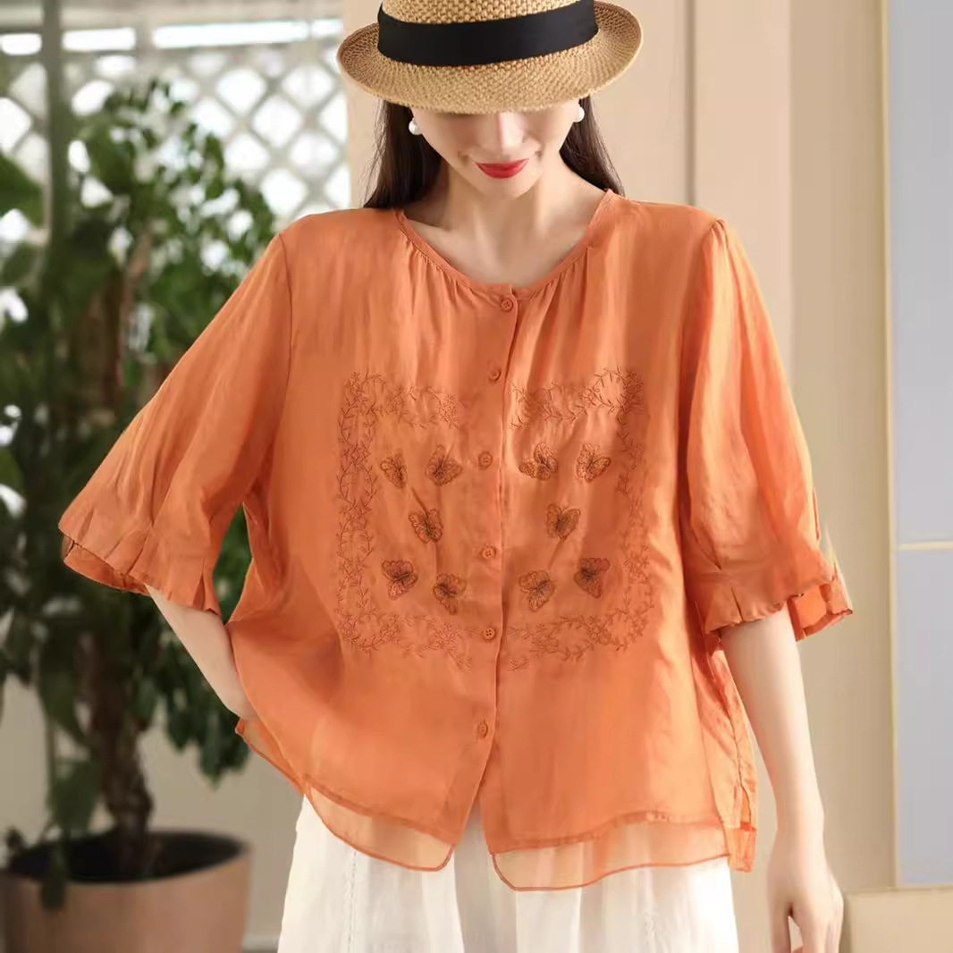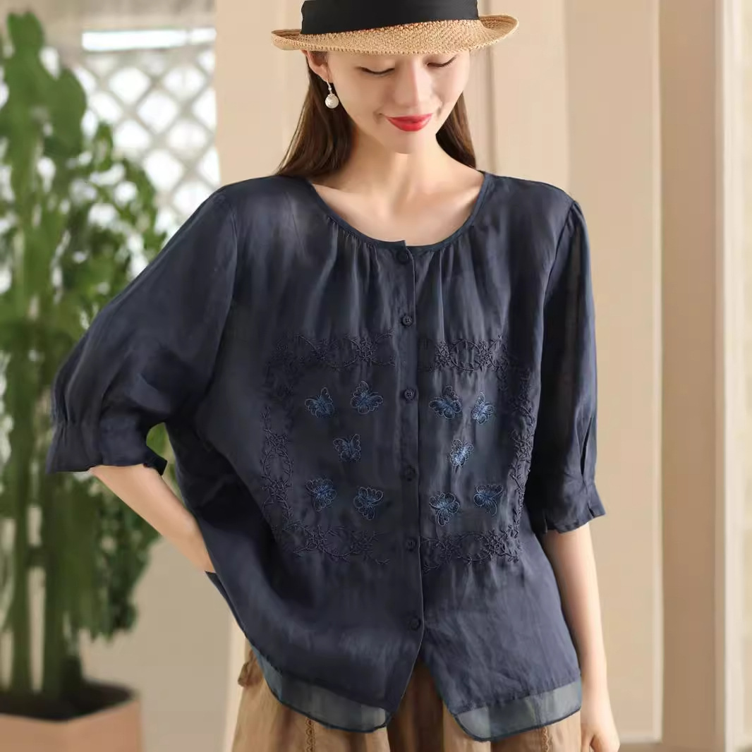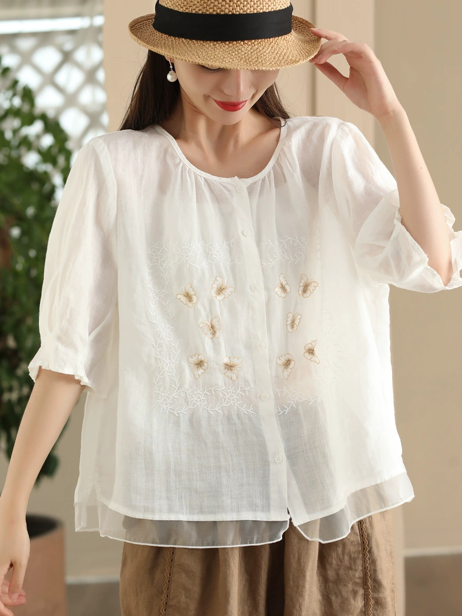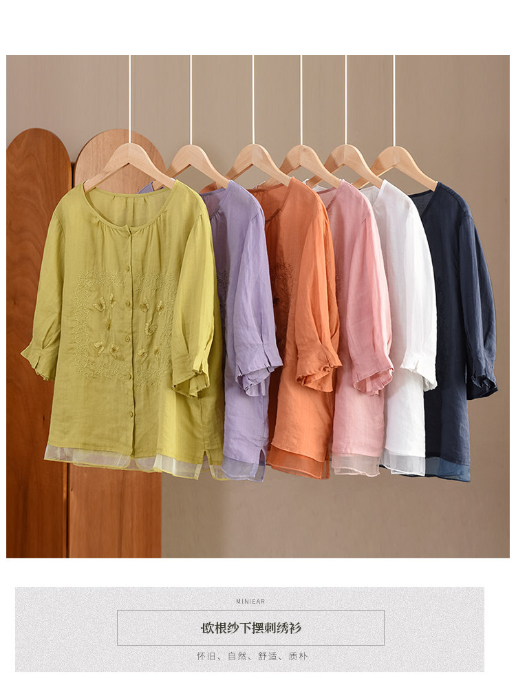 빈티지 3 차원 자수 라미 셔츠 바느질 Organza 손으로 반죽 주름 셔츠 우아한 탑