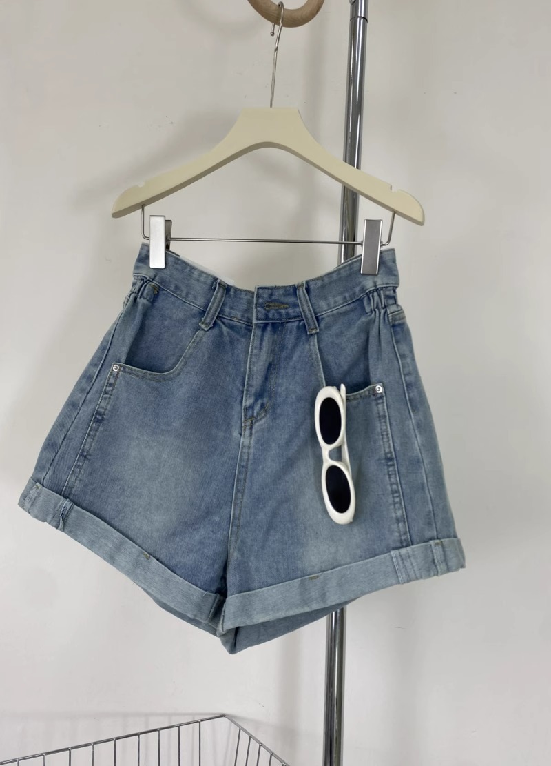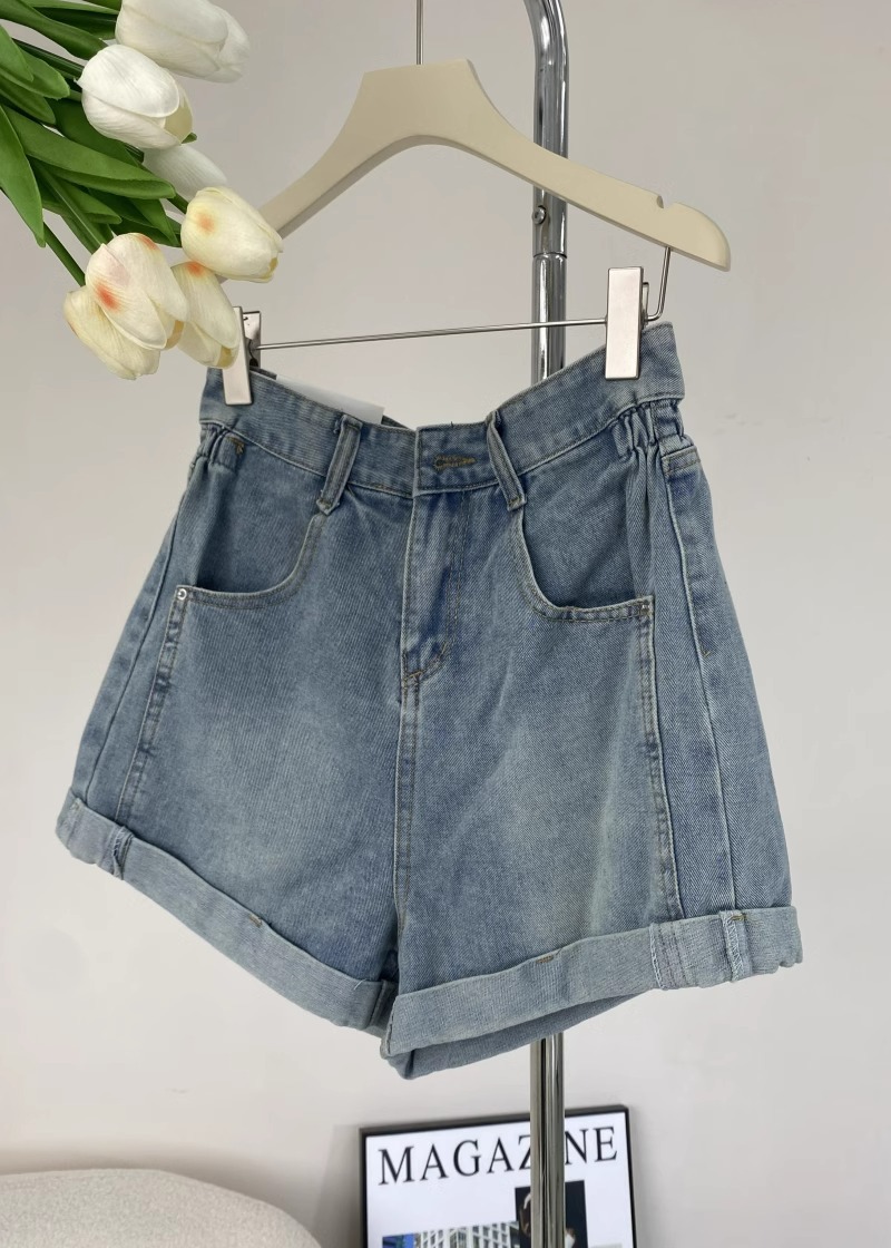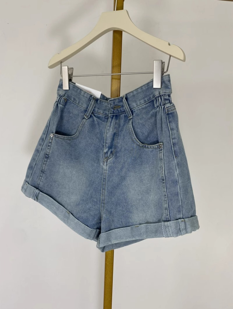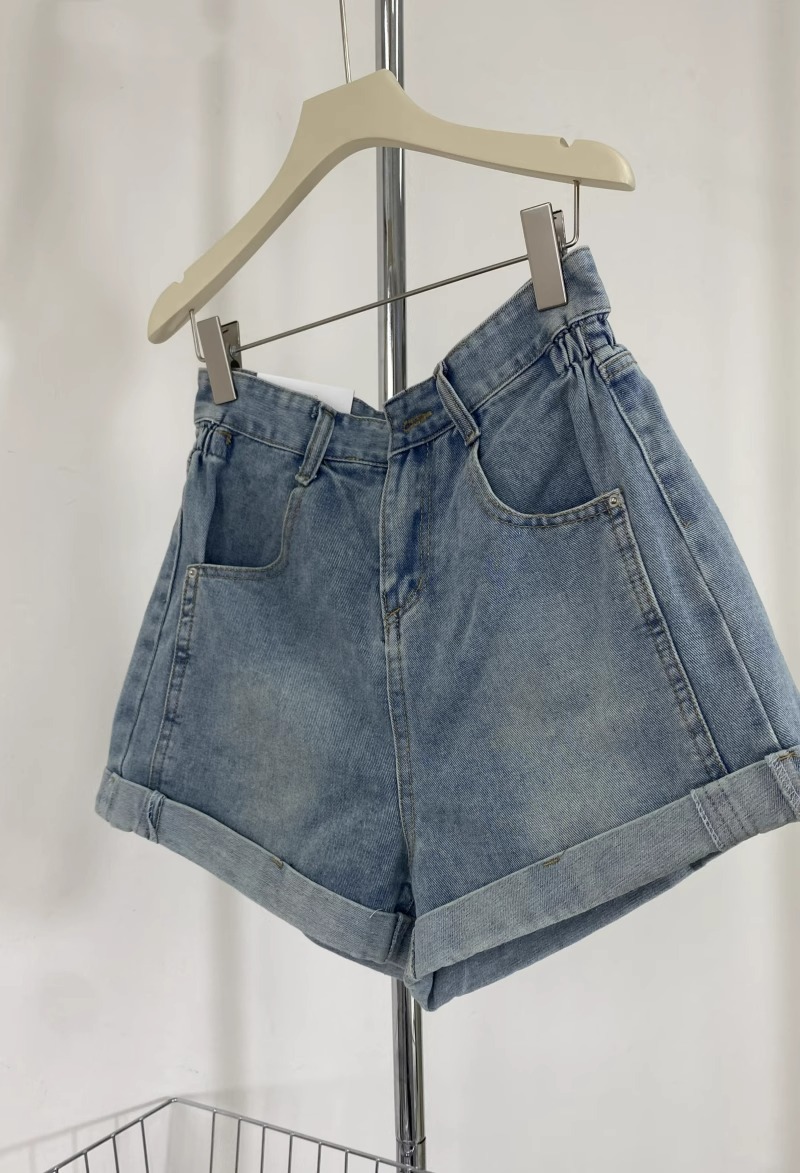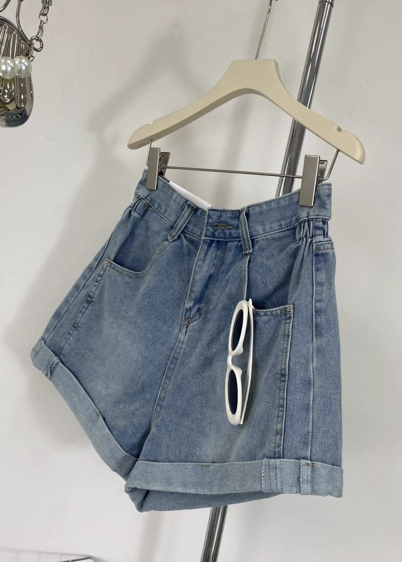 2024 느슨한 컬 데님 반바지 여성 여름 새로운 틈새 디자인 센스 높은 허리 A 라인 바지 넓은 다리 핫 바지스토어 가기