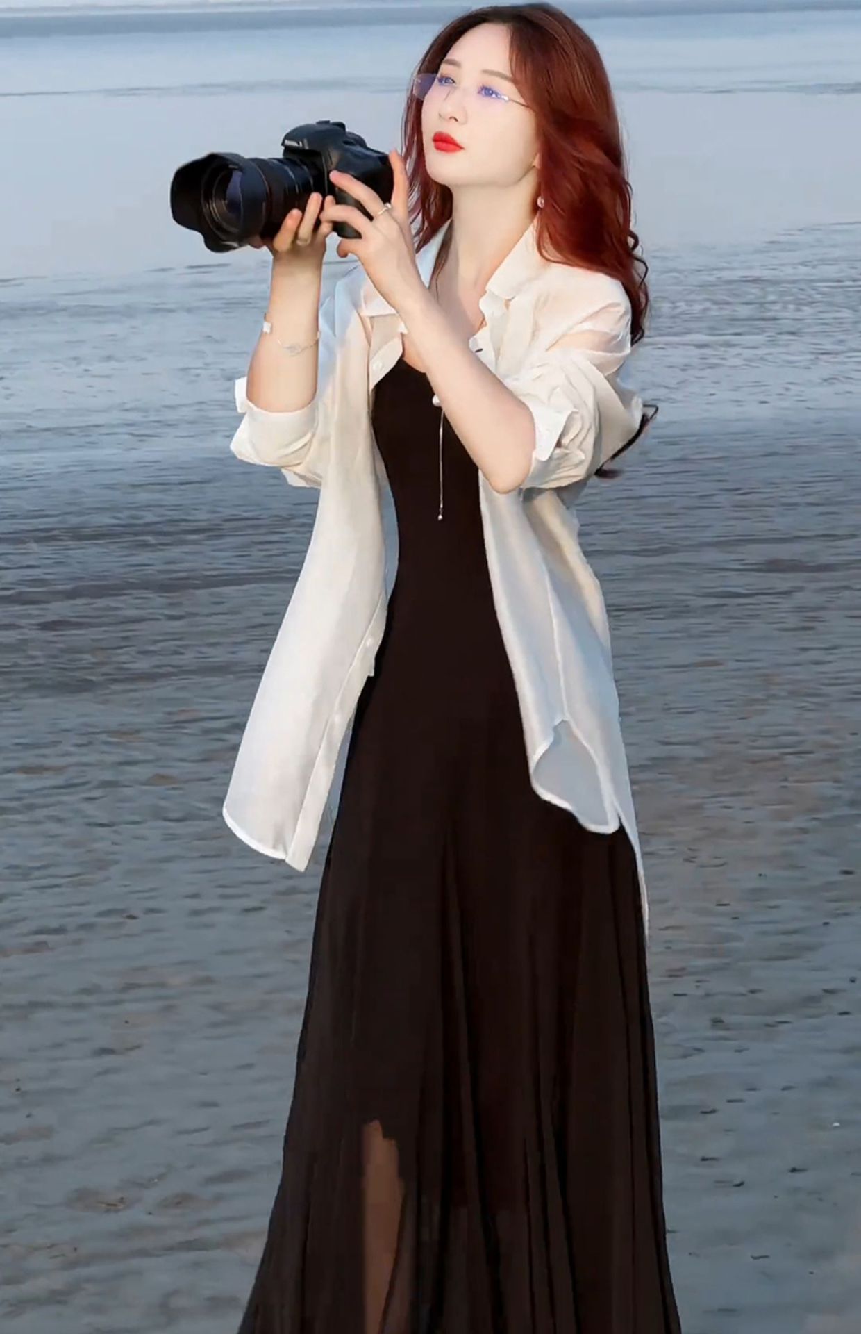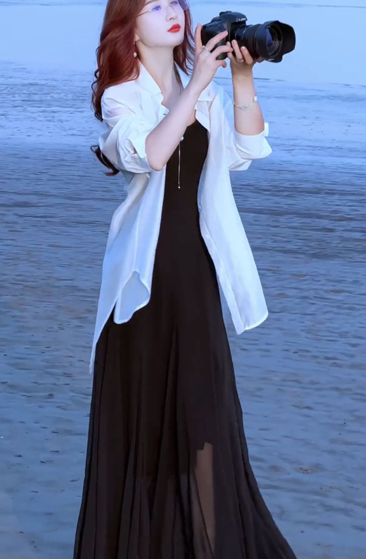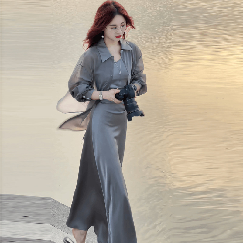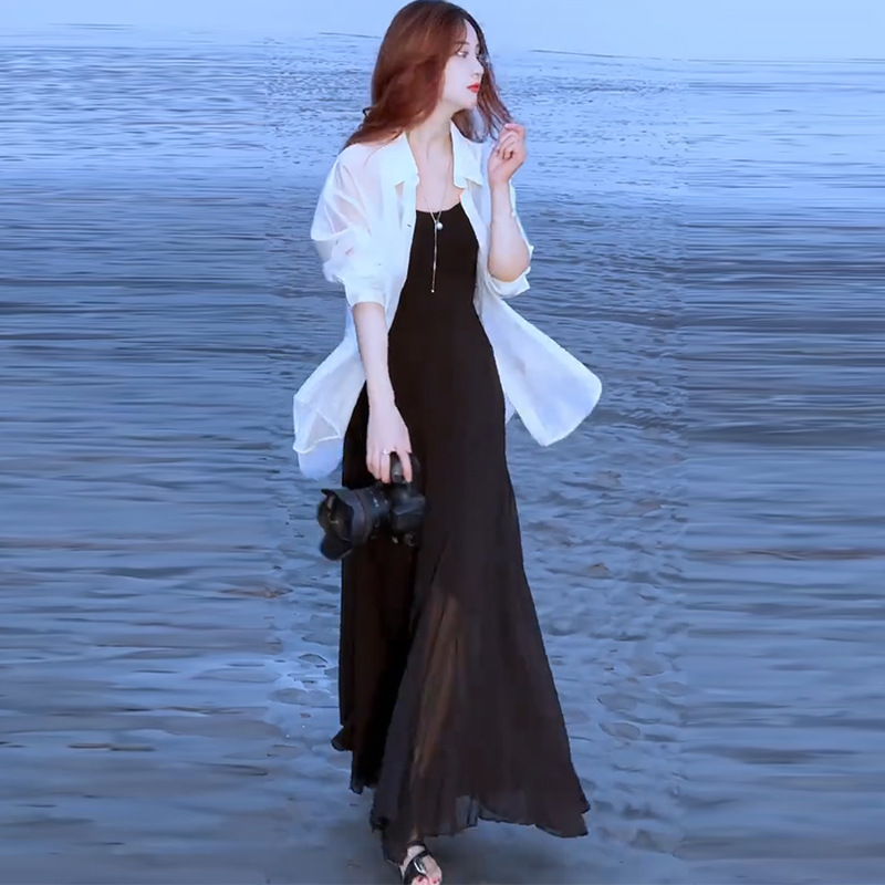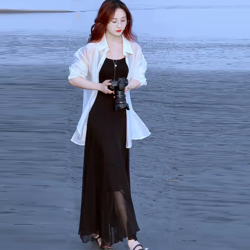 세련된 원피스 세트 여성용 여름 새 서양식 선스크린 셔츠 슬립 스커트 롱 스커트 투피스 유행 세트
