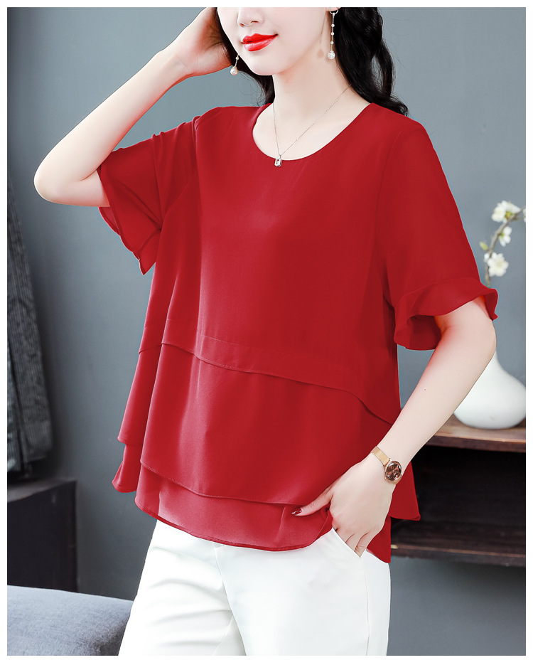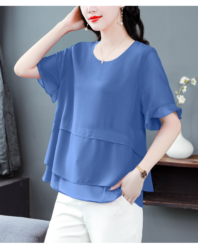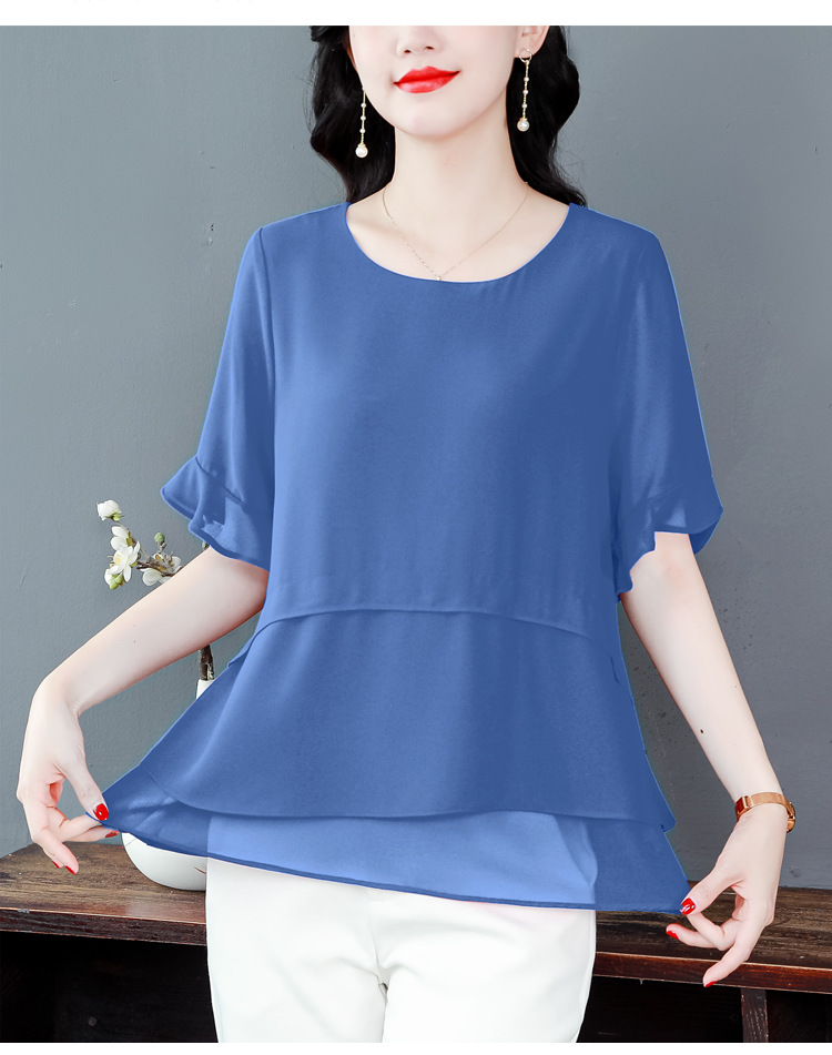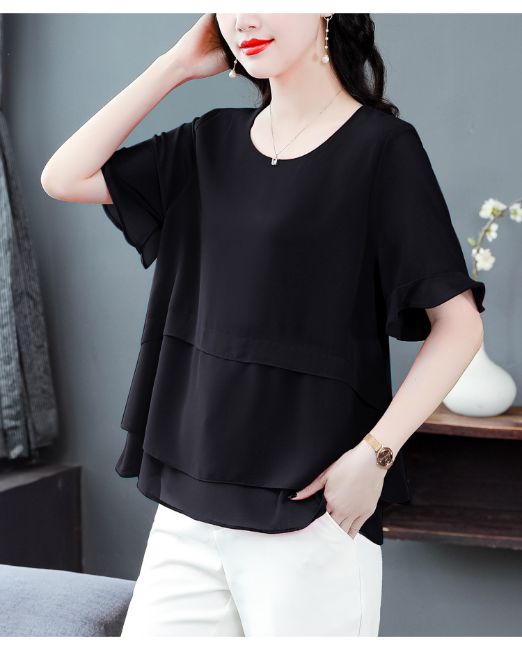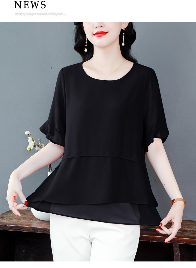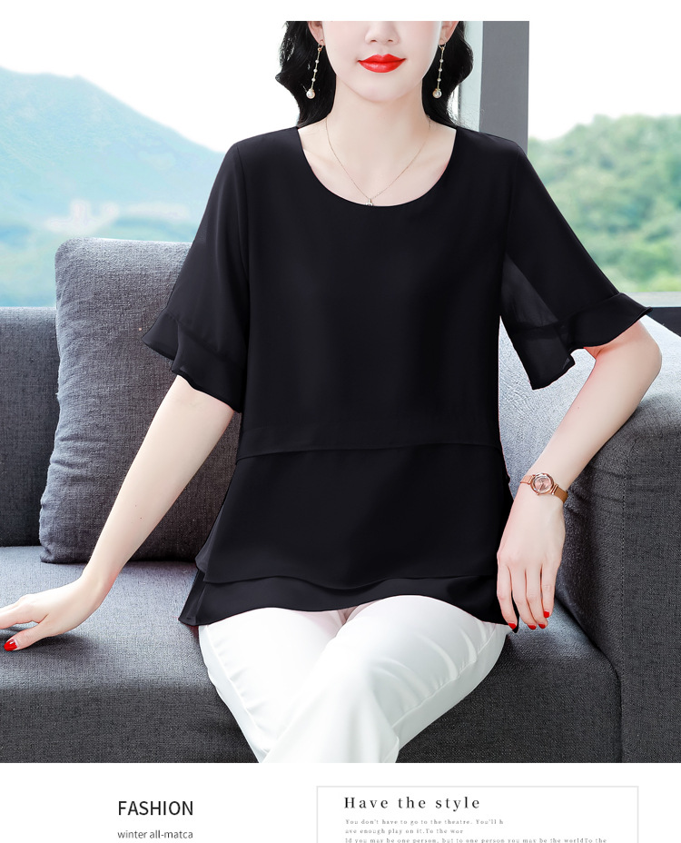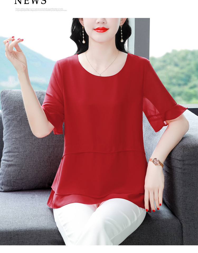 통통녀 반팔 쉬폰 셔츠 여성 디자인 센스 리어 스플릿 탑 여름 중년 어머니의 느슨한 배 덮개 셔츠
