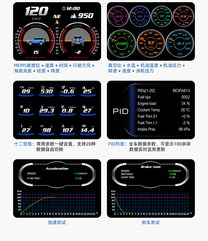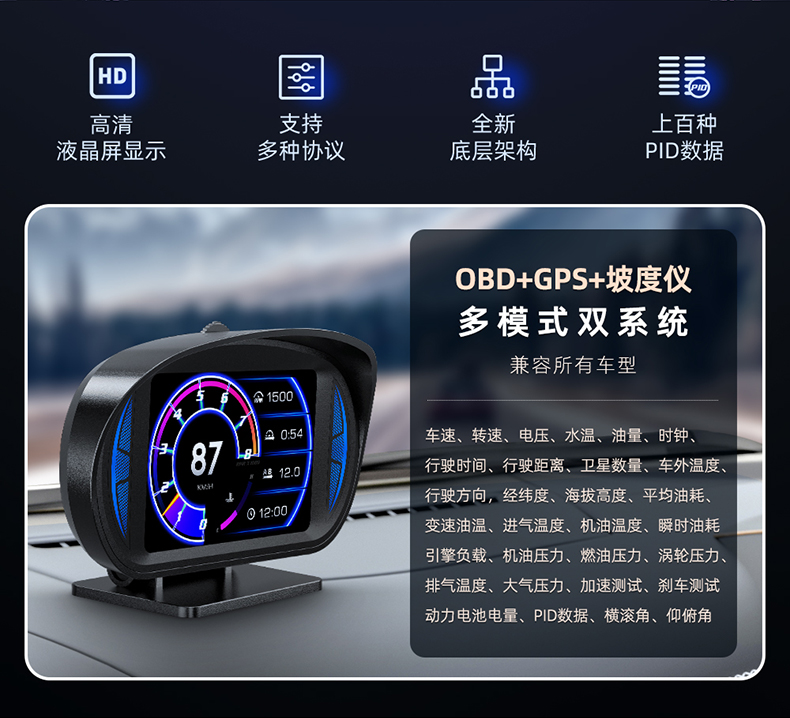 자동차 HUD 헤드 업 디스플레이 자동차 범용 OBD LCD 미터 경사 미터 차량 속도 다기능 고화질 헤드 업