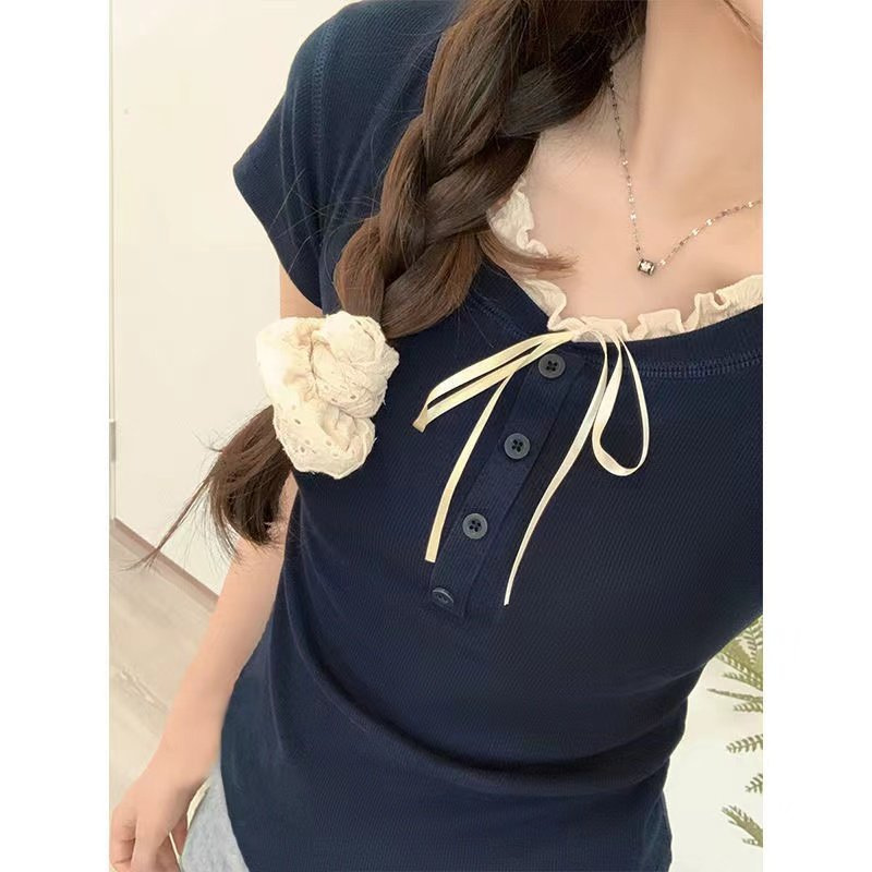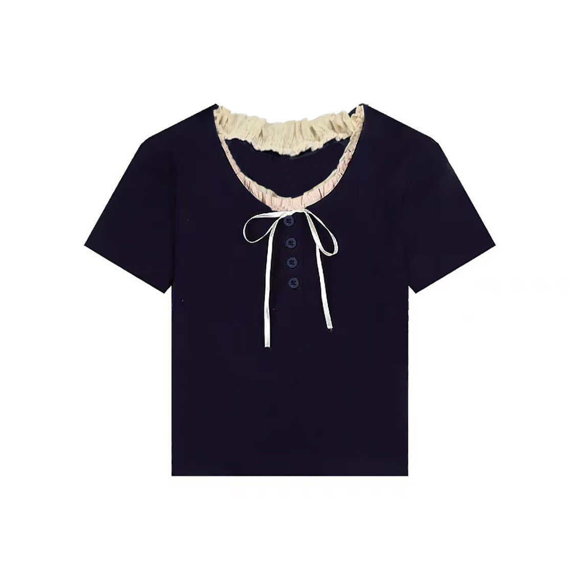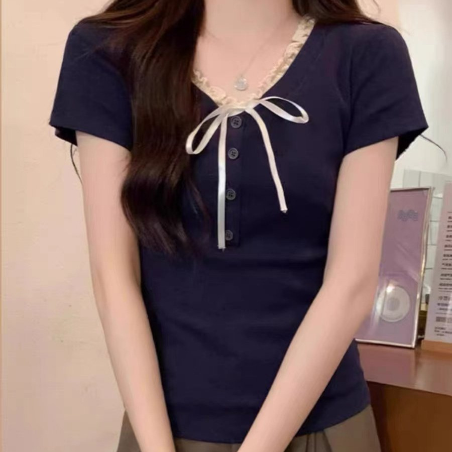 재고 디자인 센스 니쉬 이어 하프 오픈 칼라 버튼 어깨 반팔 티셔츠 여성용 봄과 여름 슬리밍 스파이스 걸 탑