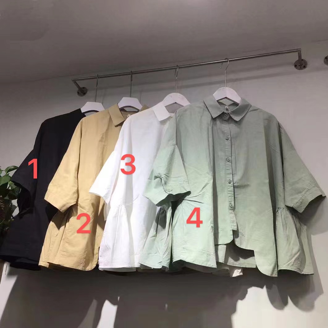 여름 반팔 새 옷깃 단일 가슴 주름 디자인 셔츠 여성의 불규칙한 헴 솔리드 컬러 루즈 탑스토어 가기