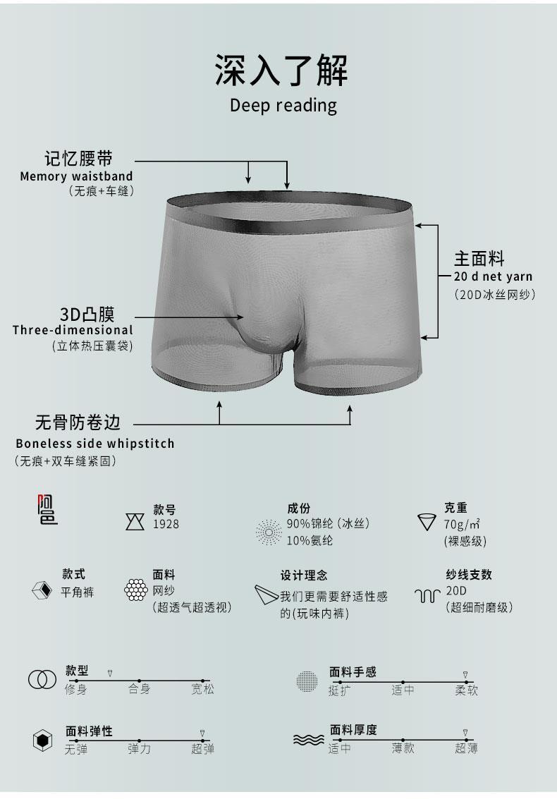 남성 속옷 아이스 실크 원활한 편안한 통기성 박스 투명 중공 맞춤형 4 코너 빠른 건조 패션 반바지 머리