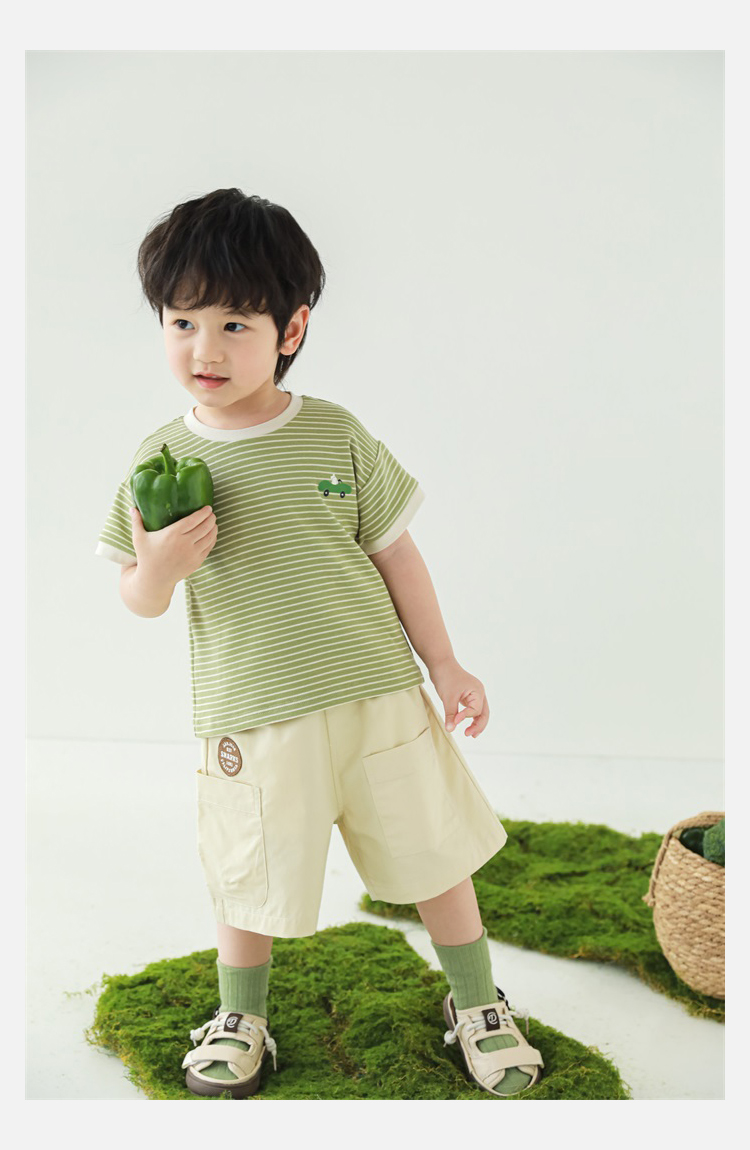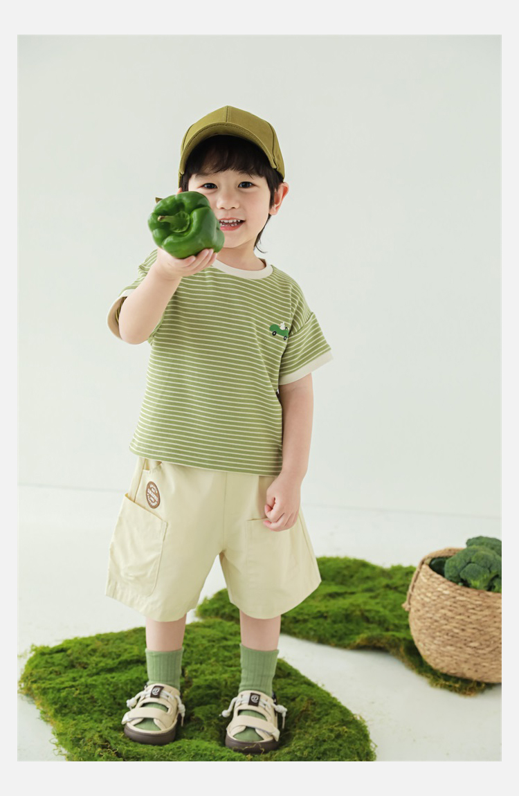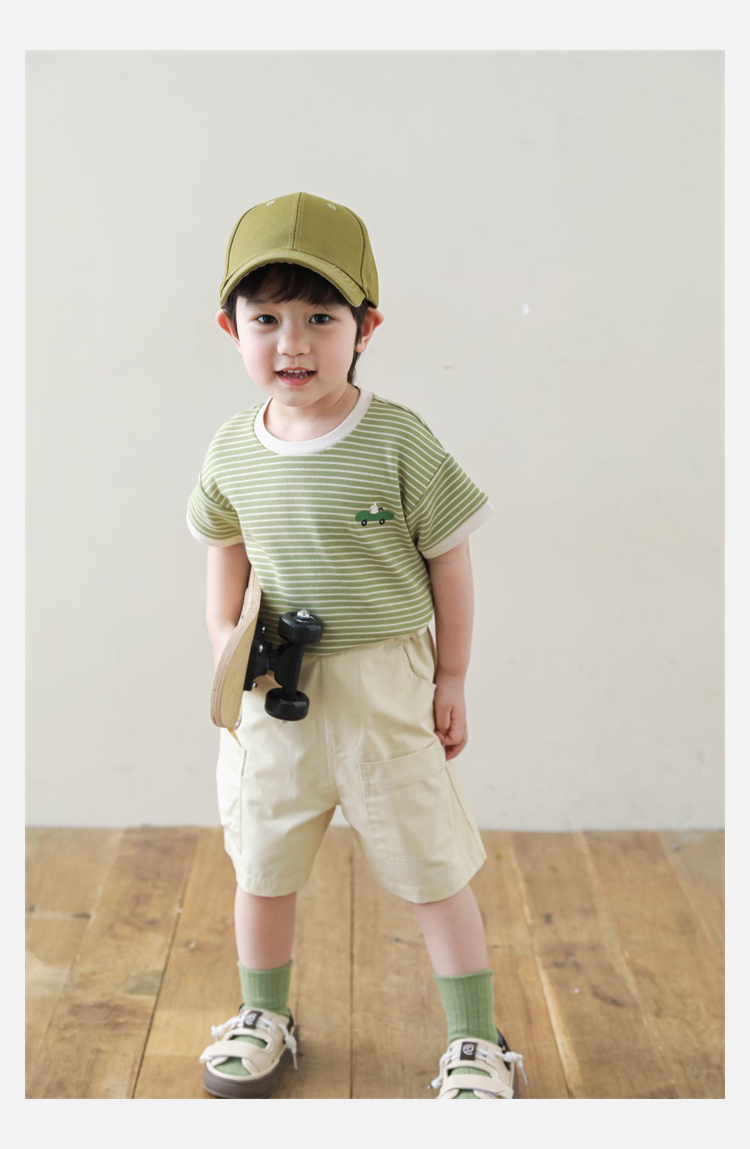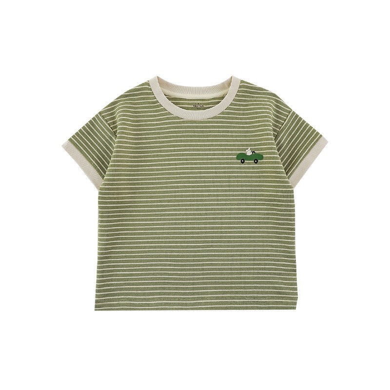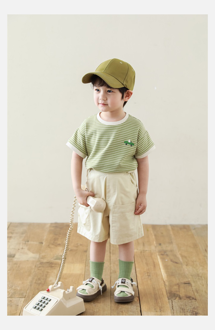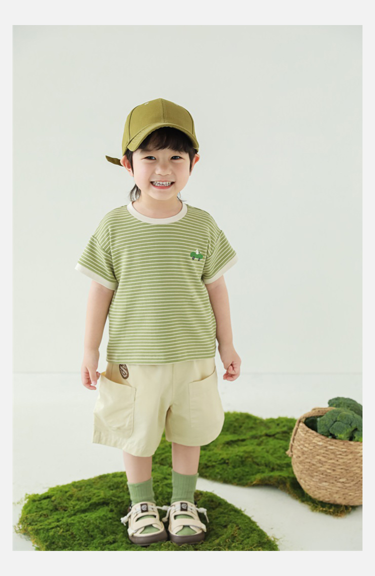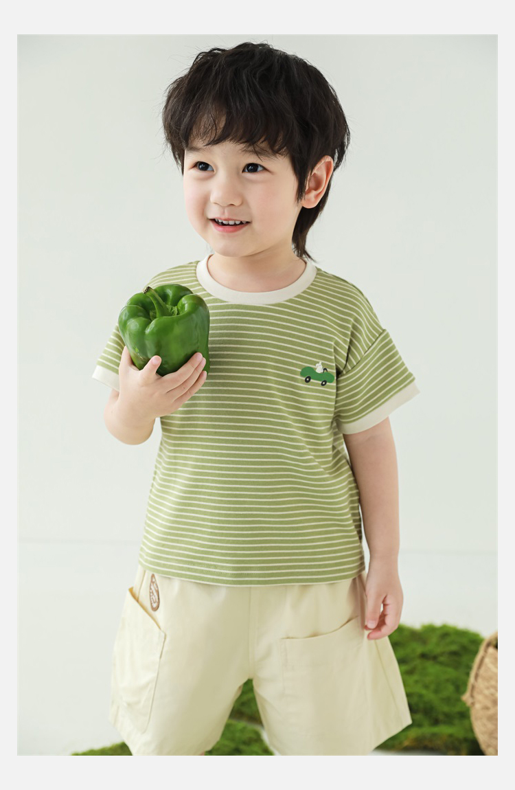 Wuri Boys의 2025 년 여름 새 빛 줄무늬 반팔 티셔츠 느슨한 어린이 유행 작업복스토어 가기