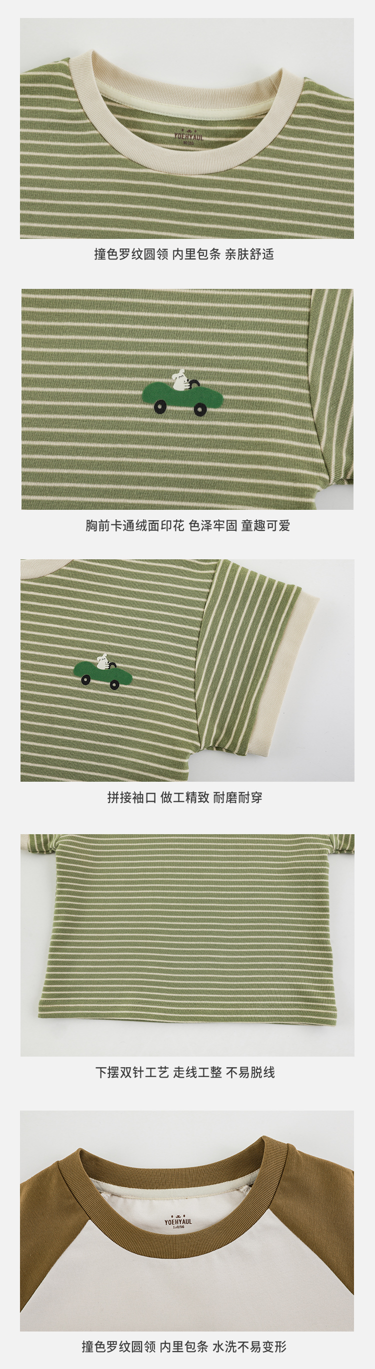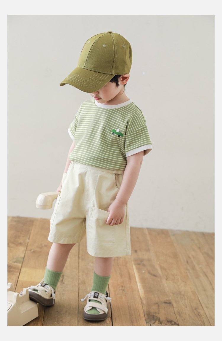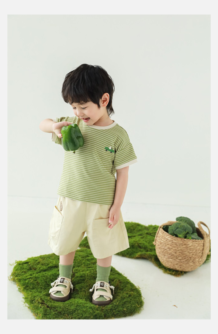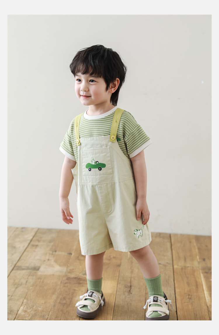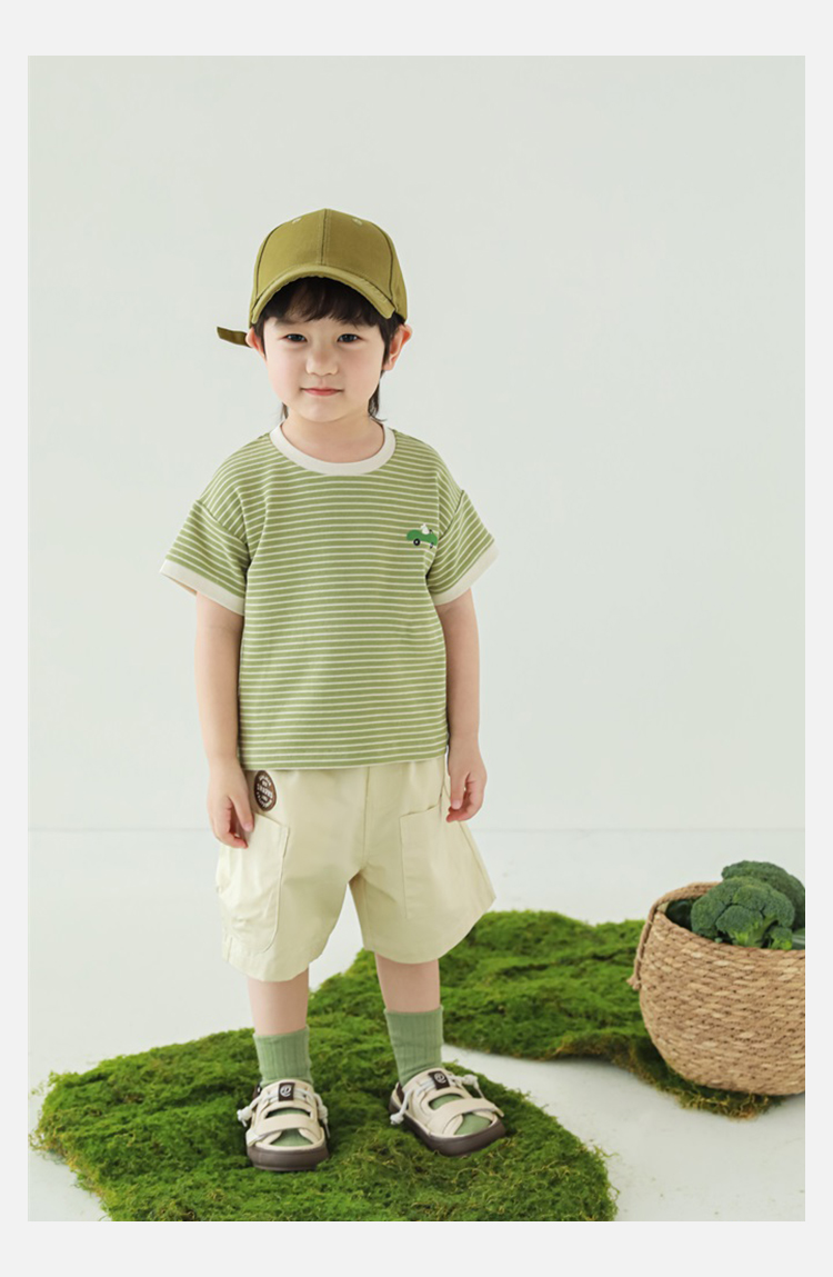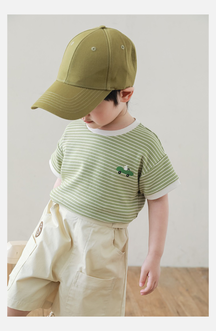 Wuri Boys의 2025 년 여름 새 빛 줄무늬 반팔 티셔츠 느슨한 어린이 유행 작업복스토어 가기