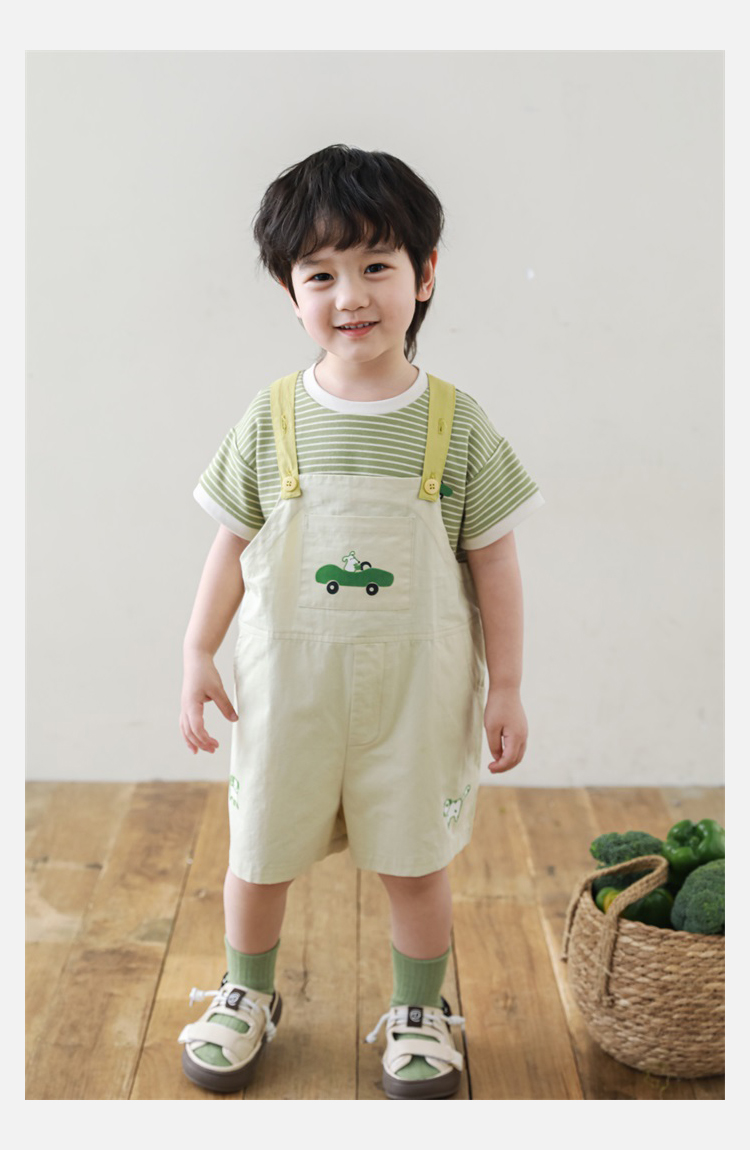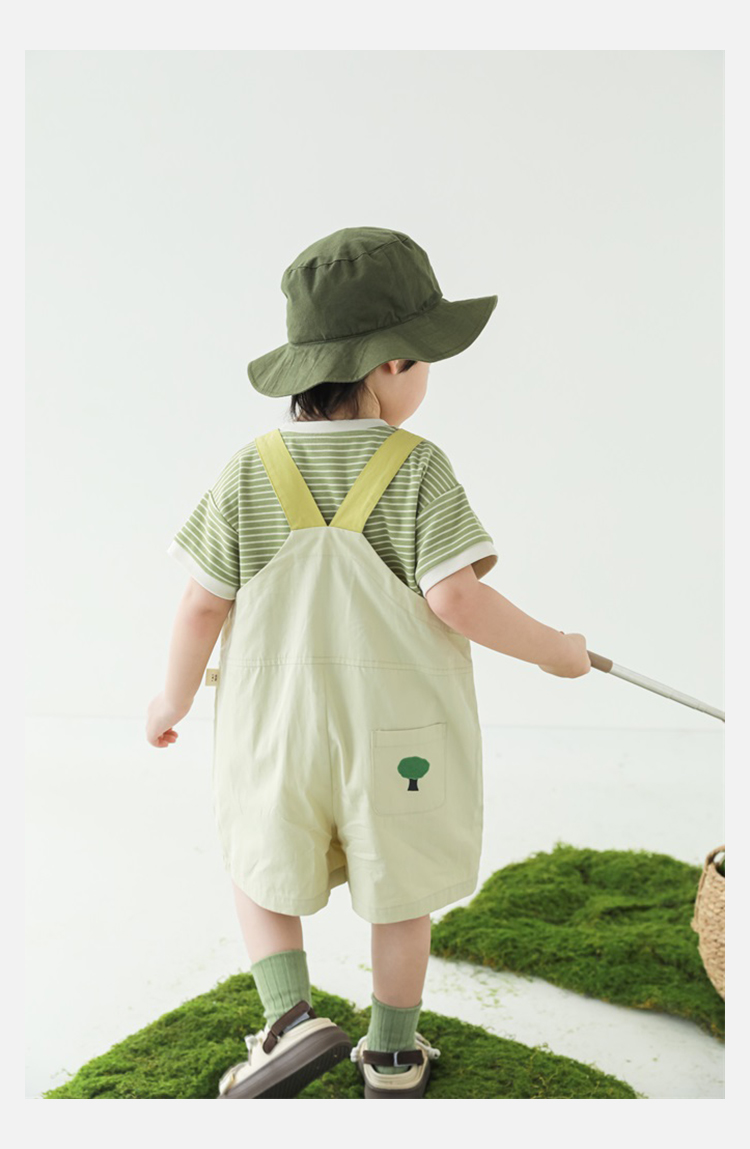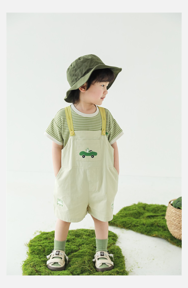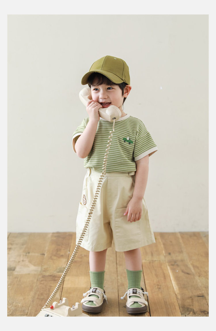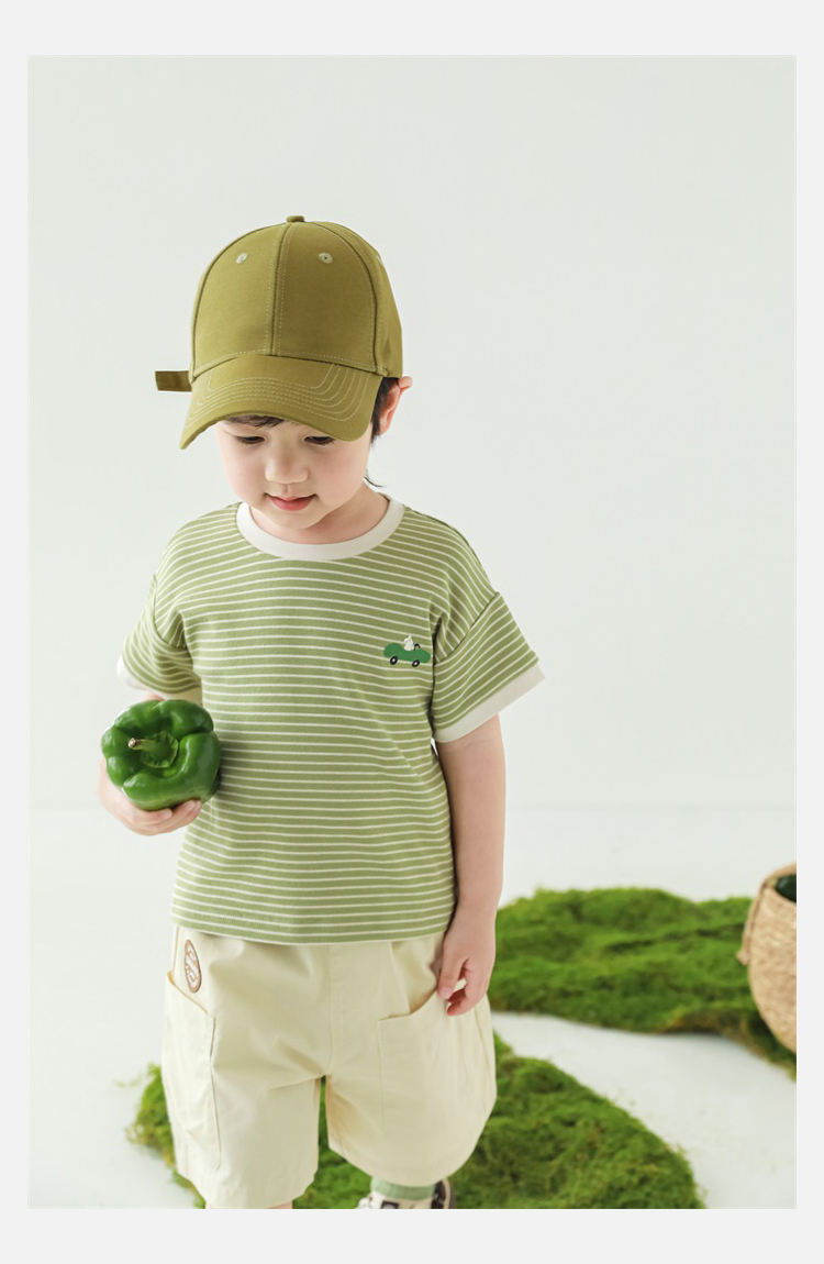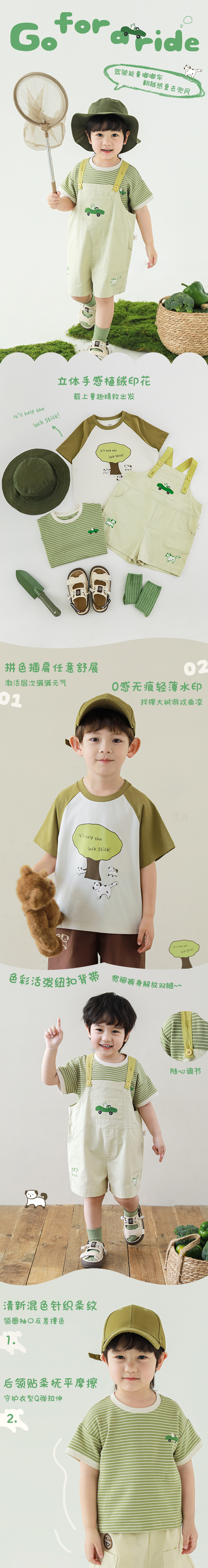 Wuri Boys의 2025 년 여름 새 빛 줄무늬 반팔 티셔츠 느슨한 어린이 유행 작업복스토어 가기