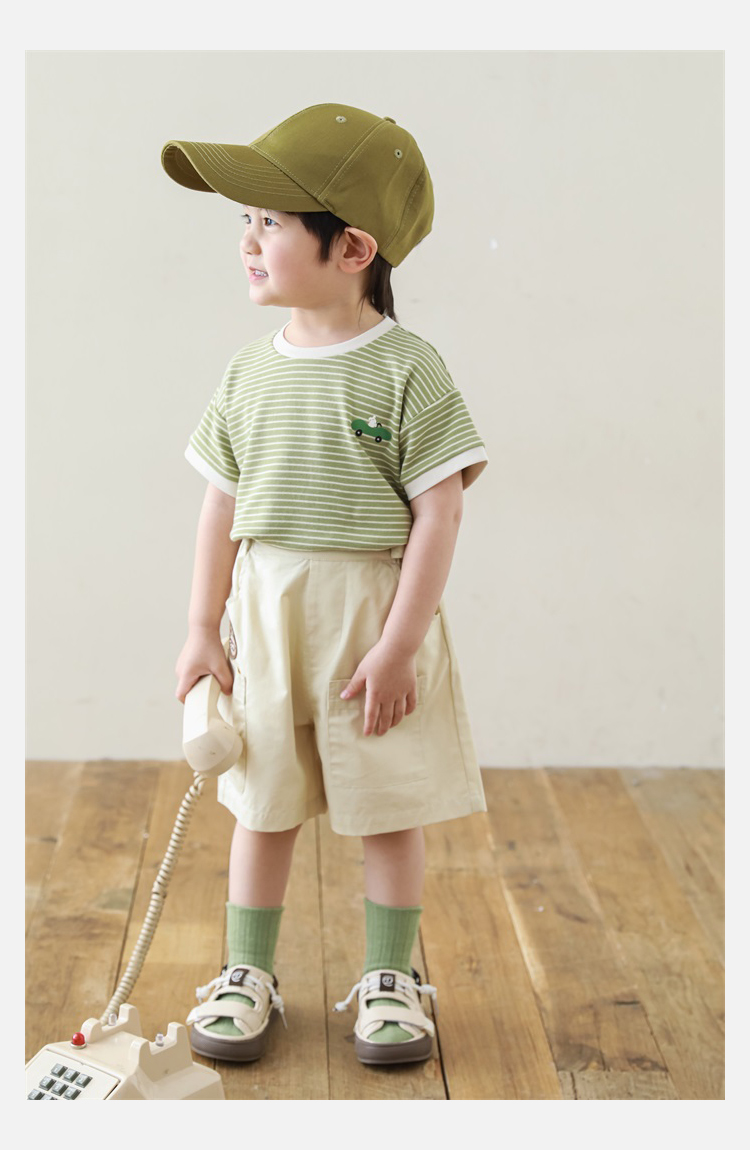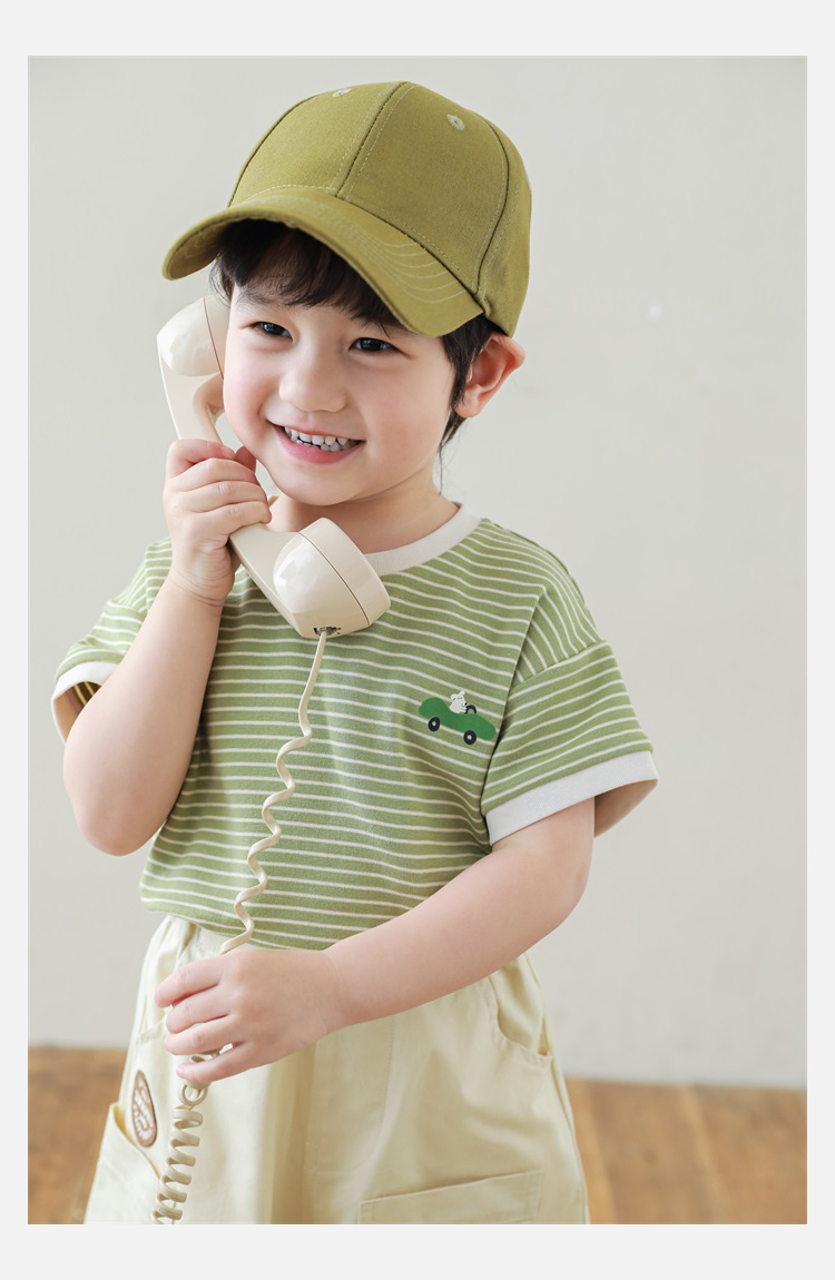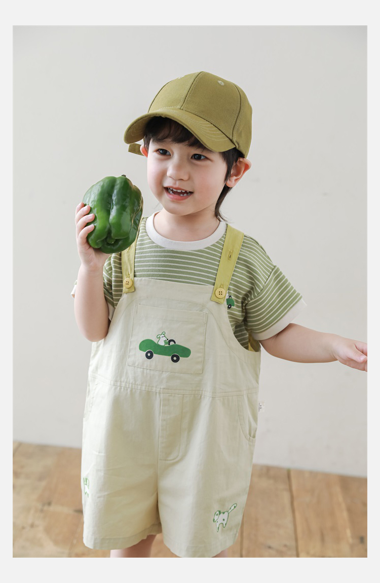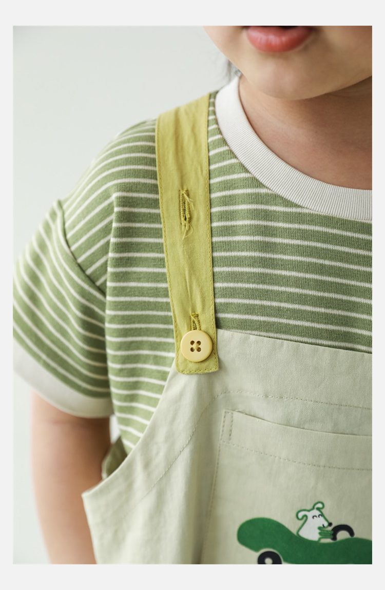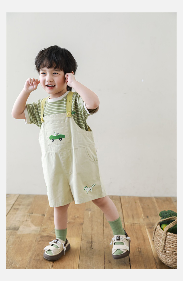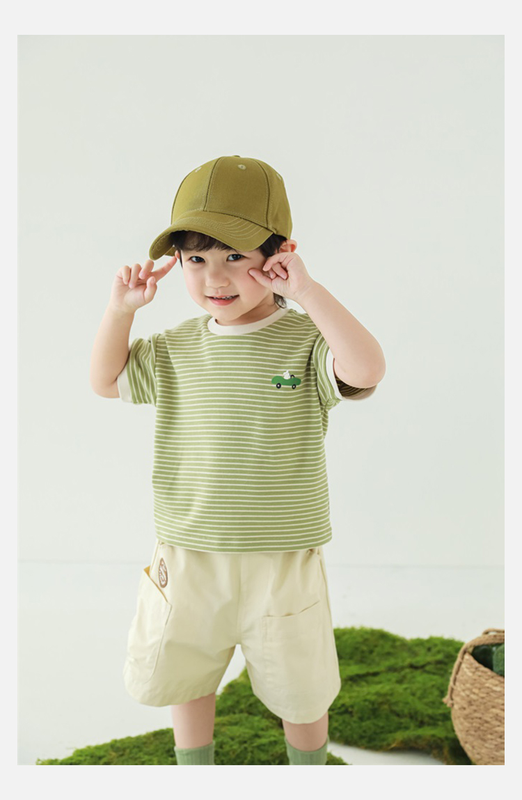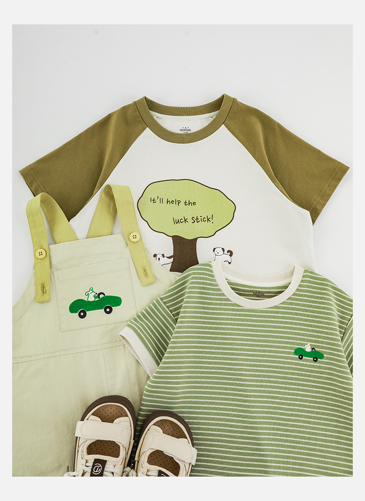 Wuri Boys의 2025 년 여름 새 빛 줄무늬 반팔 티셔츠 느슨한 어린이 유행 작업복스토어 가기