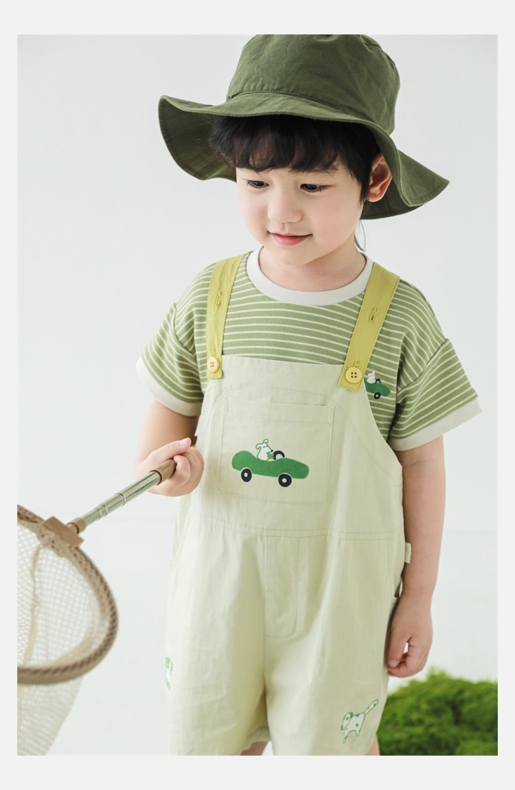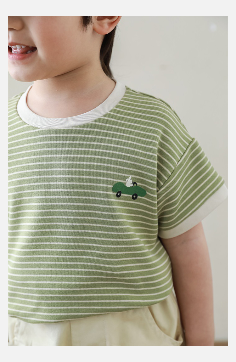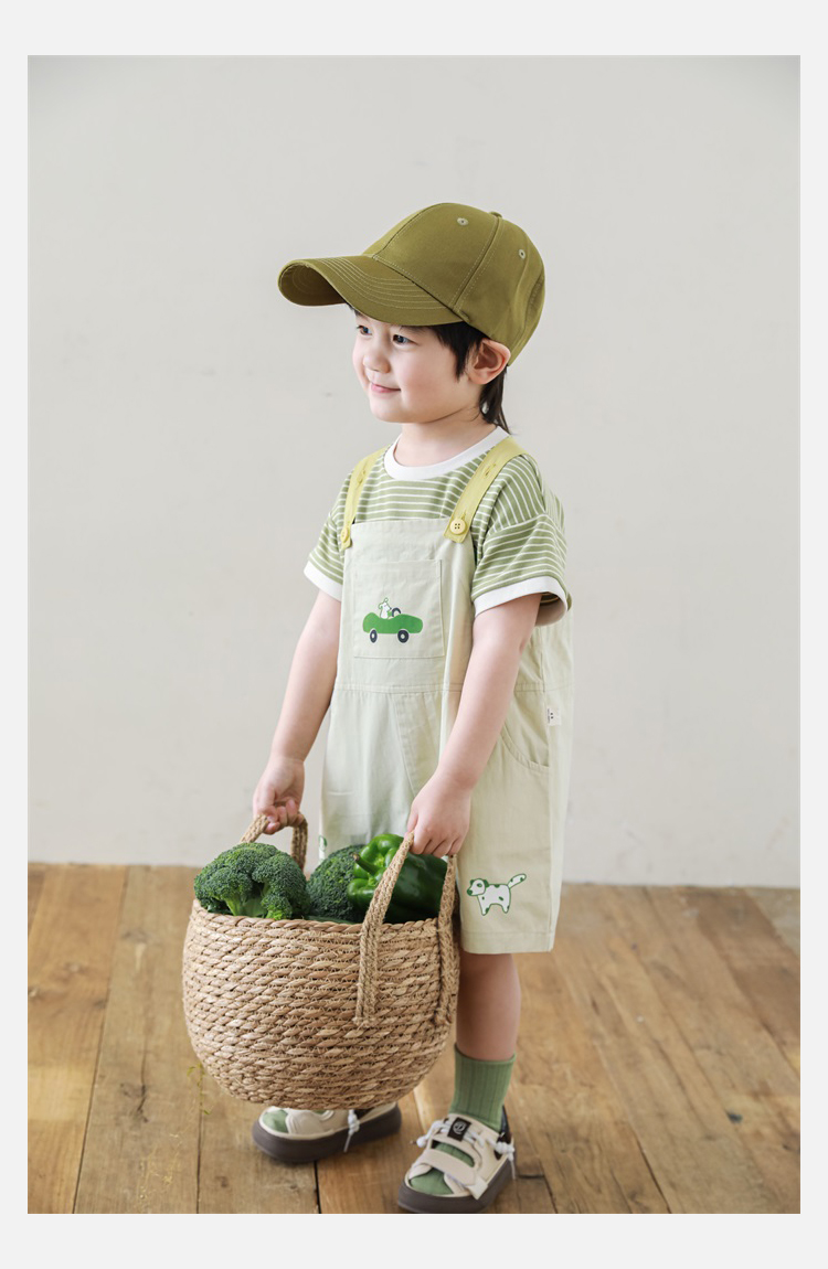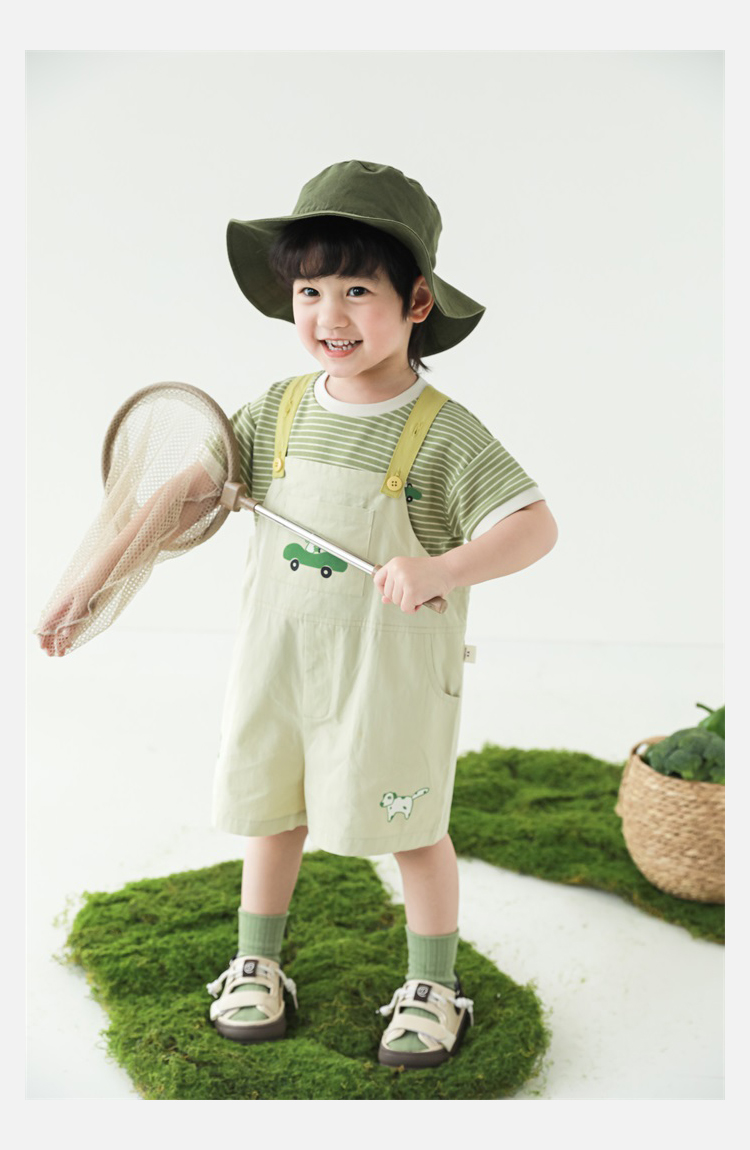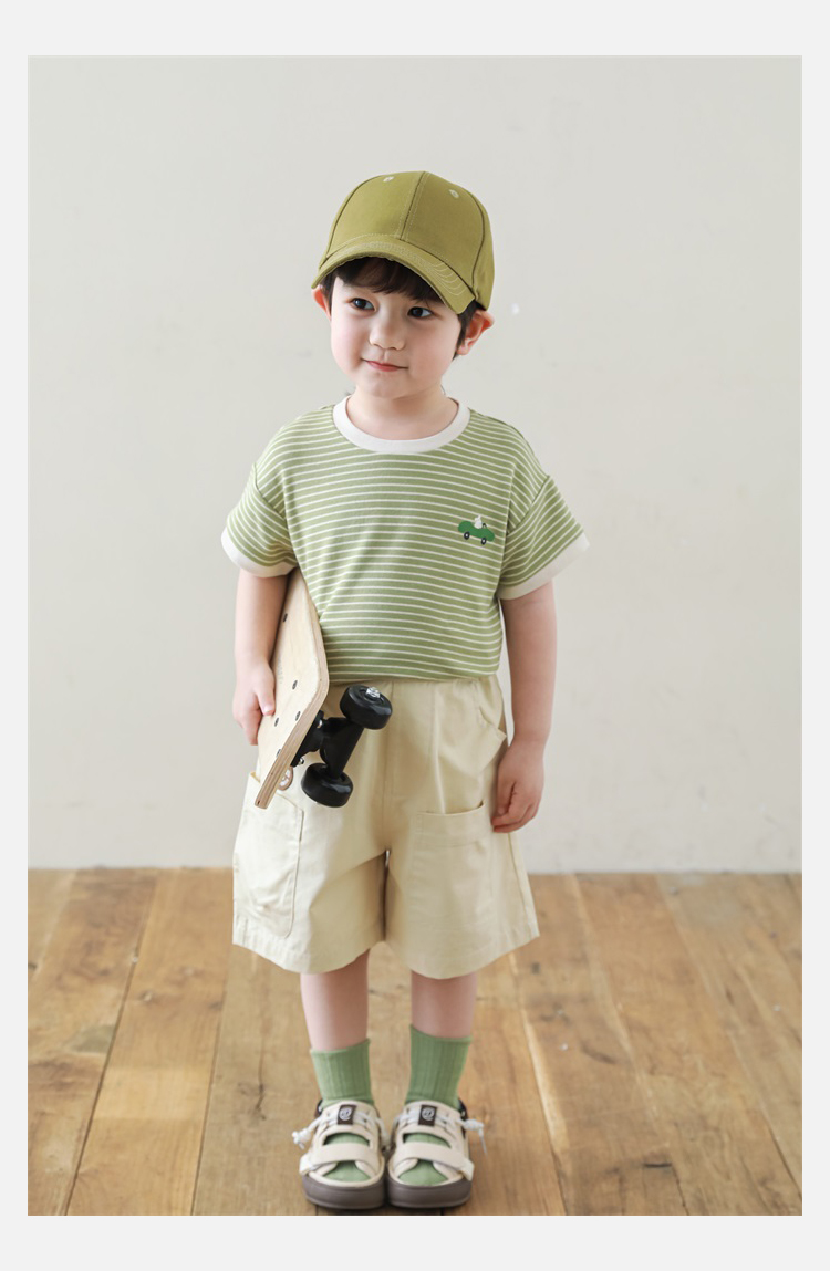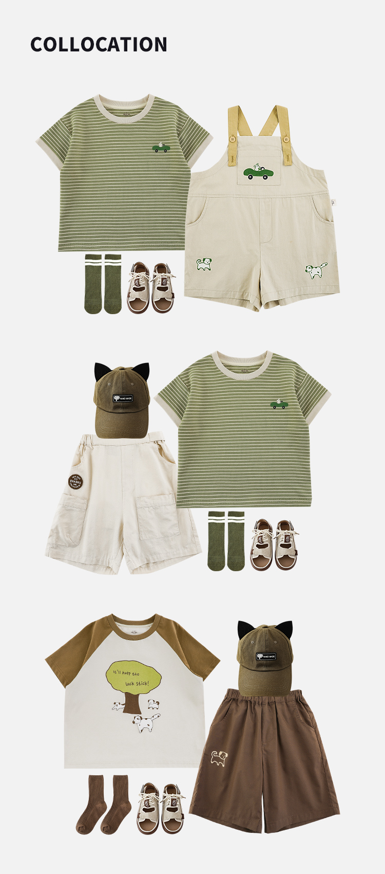Wuri Boys의 2025 년 여름 새 빛 줄무늬 반팔 티셔츠 느슨한 어린이 유행 작업복스토어 가기