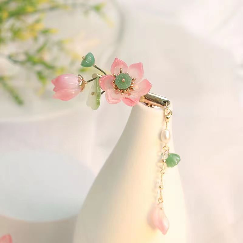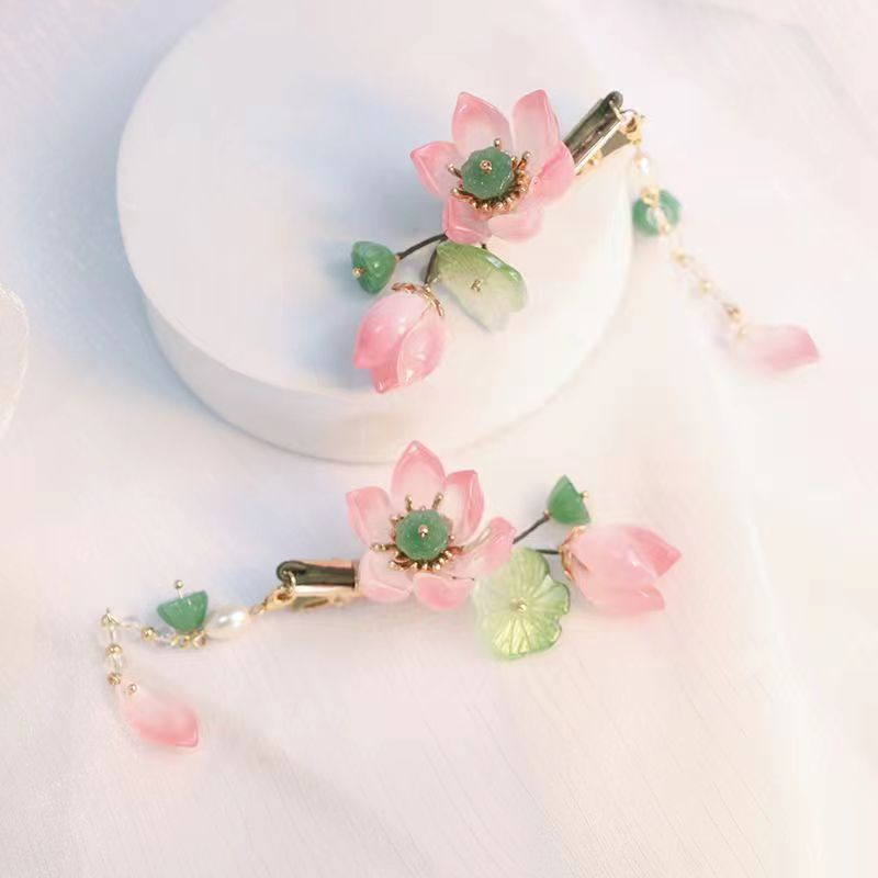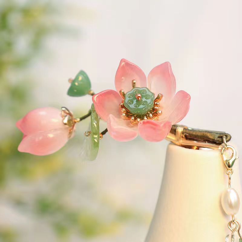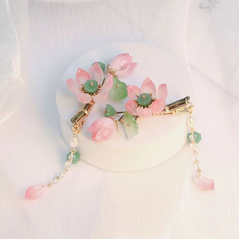 원래 12 꽃 신 6 월 연꽃 유약 헤어핀 연꽃 골동품 한푸 액세서리 신선한 머리핀 술 헤어 액세서리
