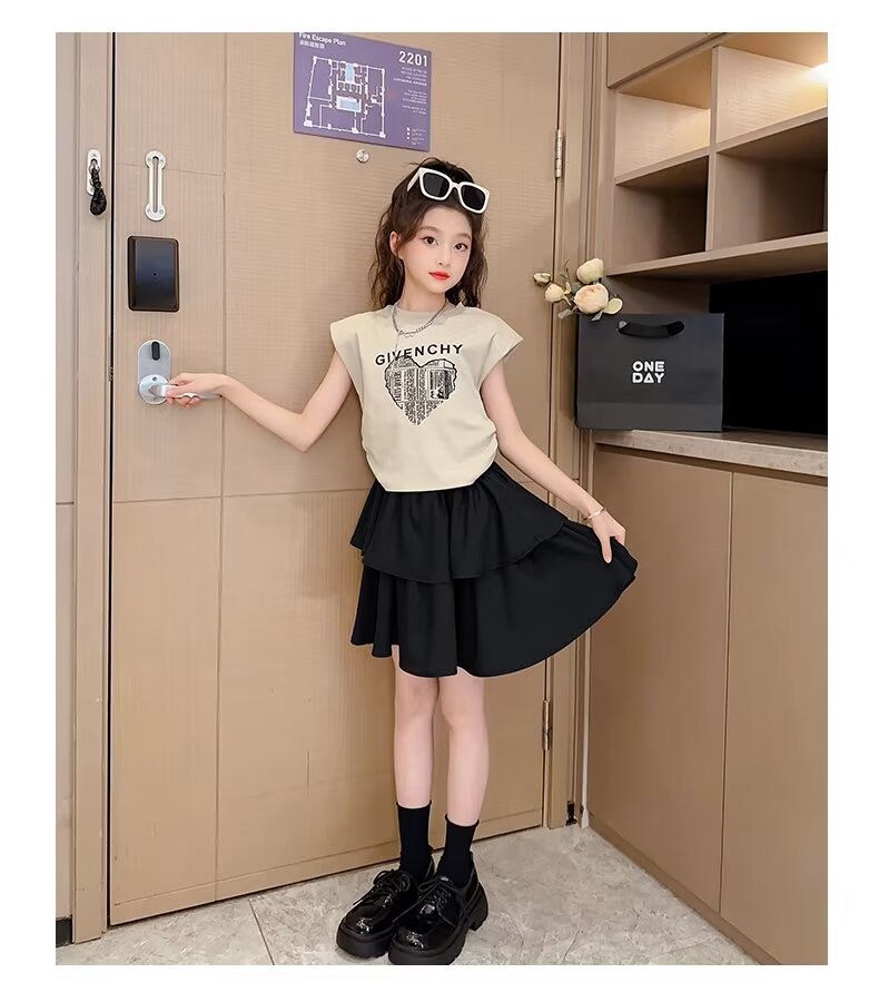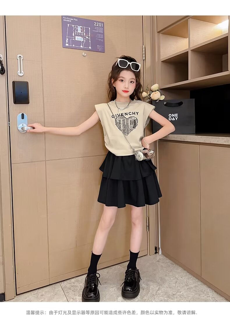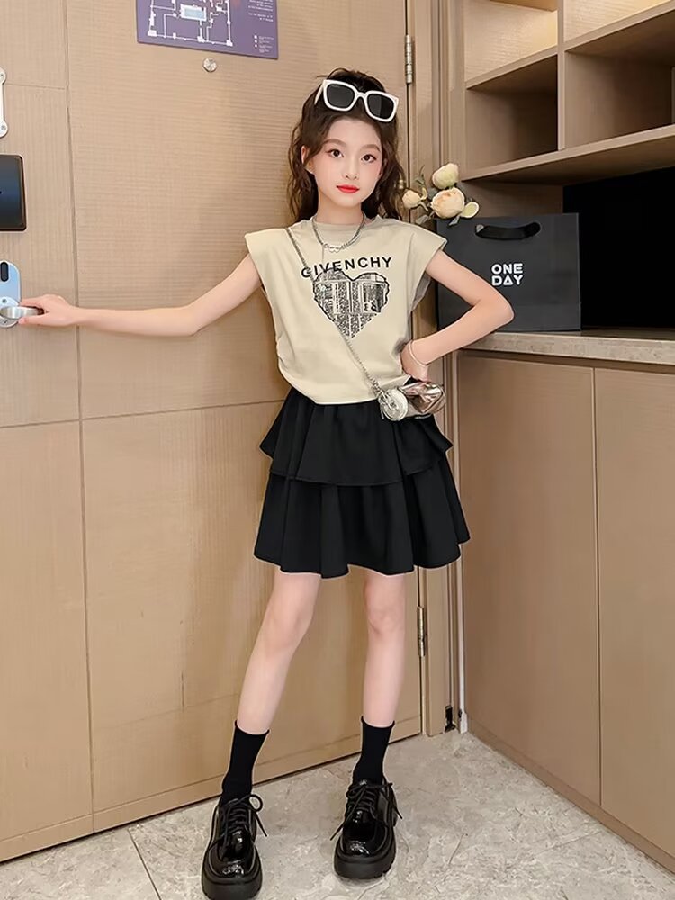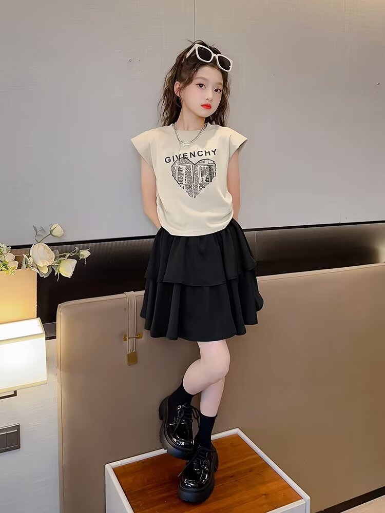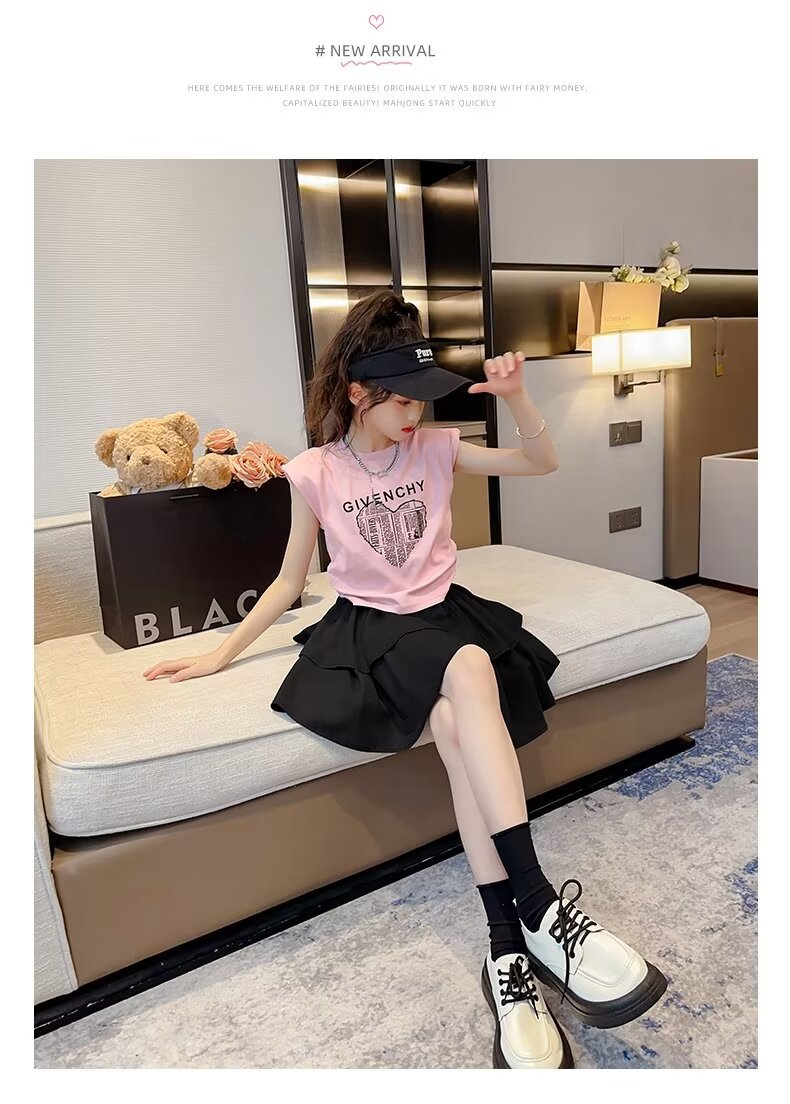 한 팬걸스 세트 2024 새로운 어린이 유행 반팔 서양식 소녀 여름 스커트 투피스 여름 원피스
