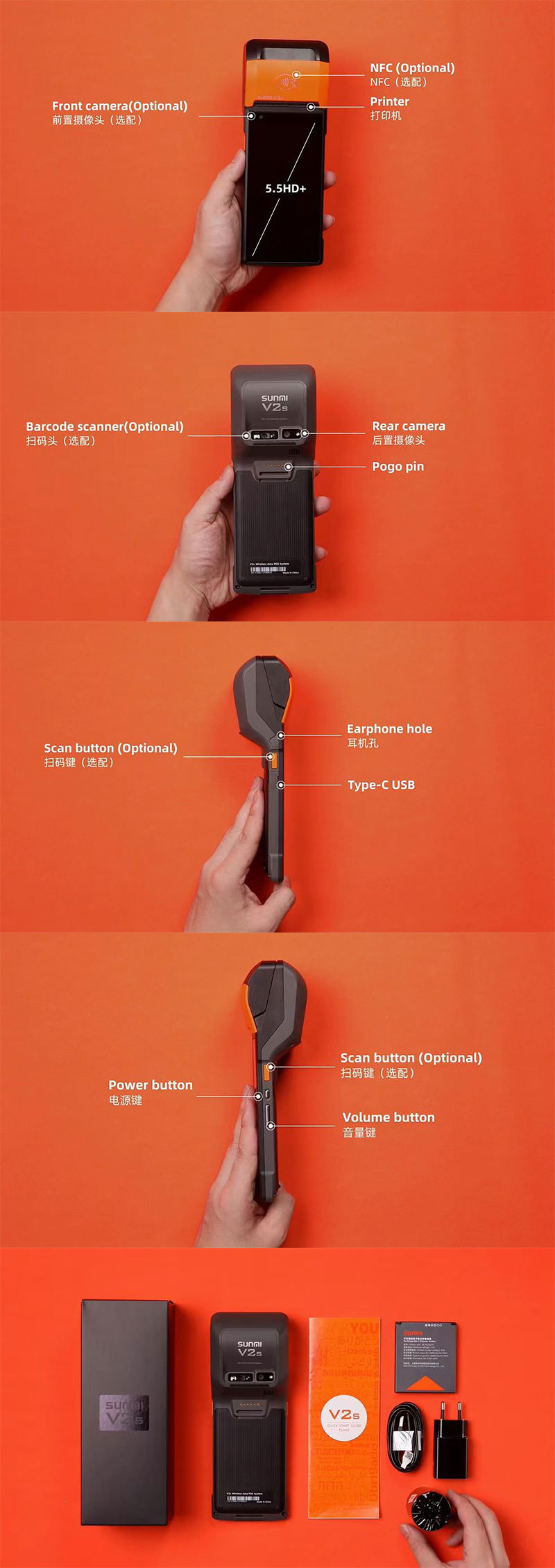 SUNMI 상인 Mi V2 모바일 핸드셋 V2S 현금 등록 테이크 아웃 프린터 다국어 영어 대외 무역 수출 에디션