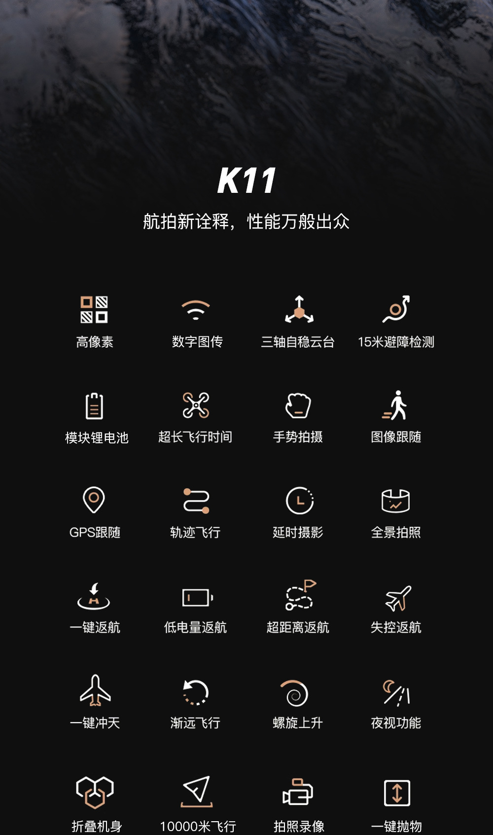 【产品配置】:飞行器*1、遥控器*1、机身电池*1、备用风叶*4、螺丝刀*1、图传连接线*3、 USB充电线*1、说明书*1