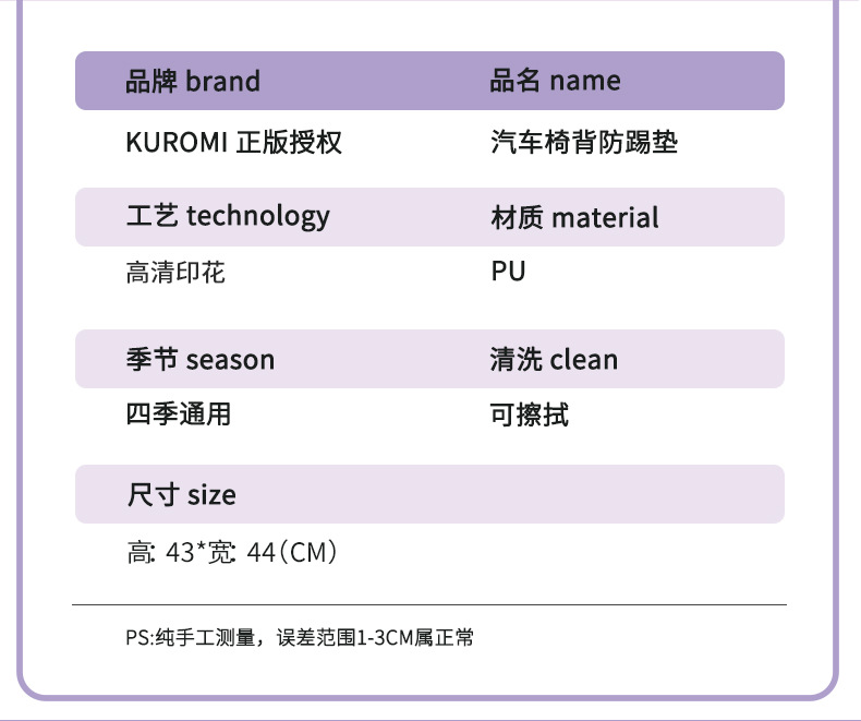 Kuromi 자동차 후면 안티 킥 패드 어린이 좌석 안티 킥 스티커 후면 더러운 보호 패드 범용 다기능스토어 가기