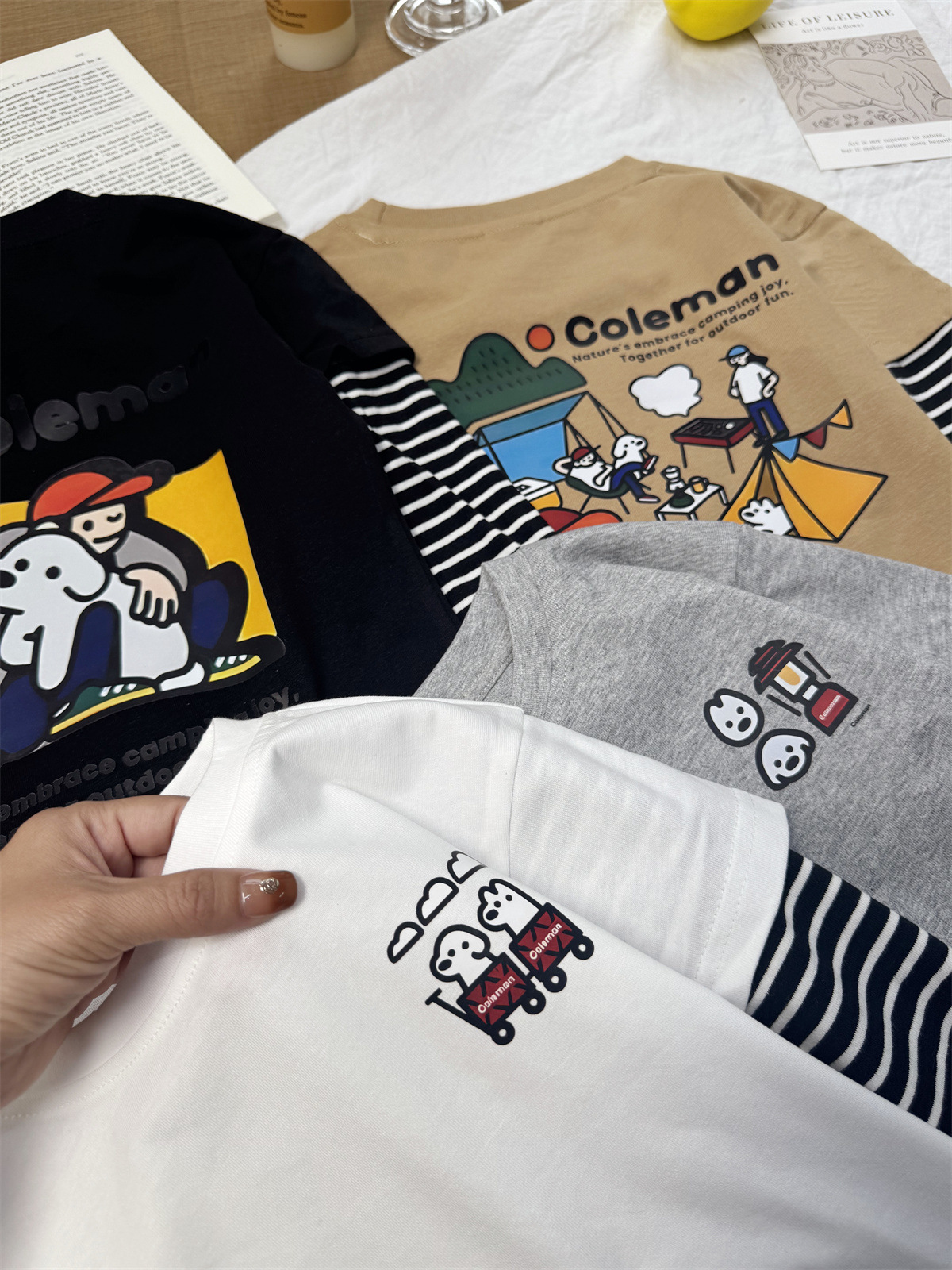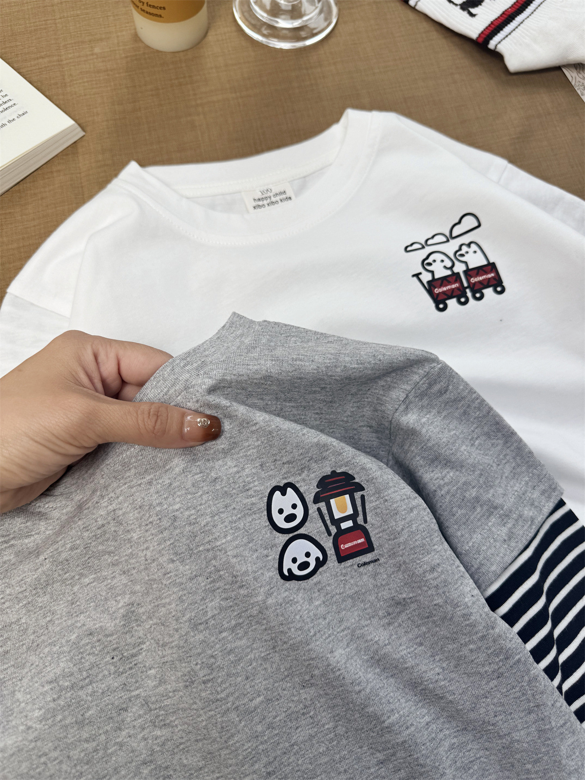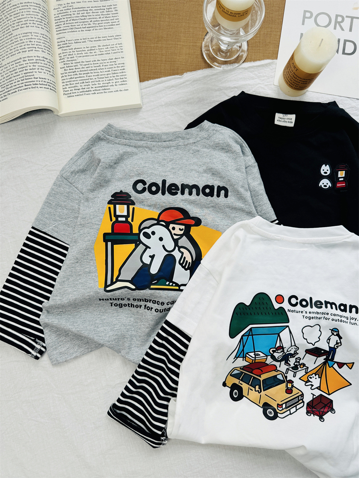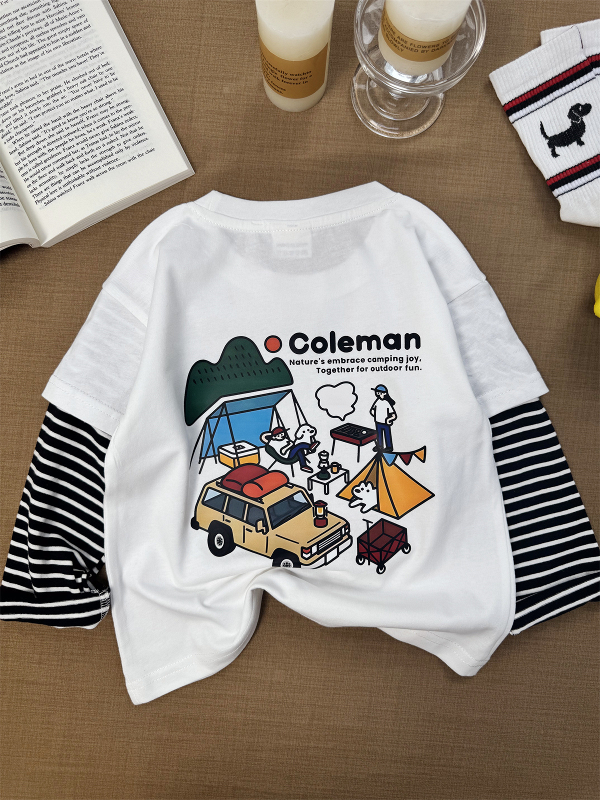 2024 새로운 소년과 소녀 만화 인쇄 긴 소매 탑 작은 어린이 아기 레저 가짜 2 조각 긴 소매 티셔츠 코튼스토어 가기