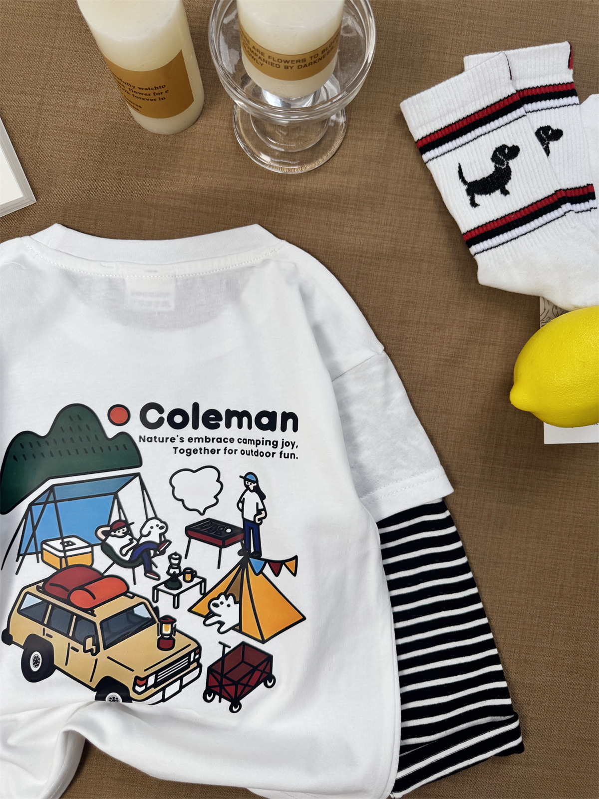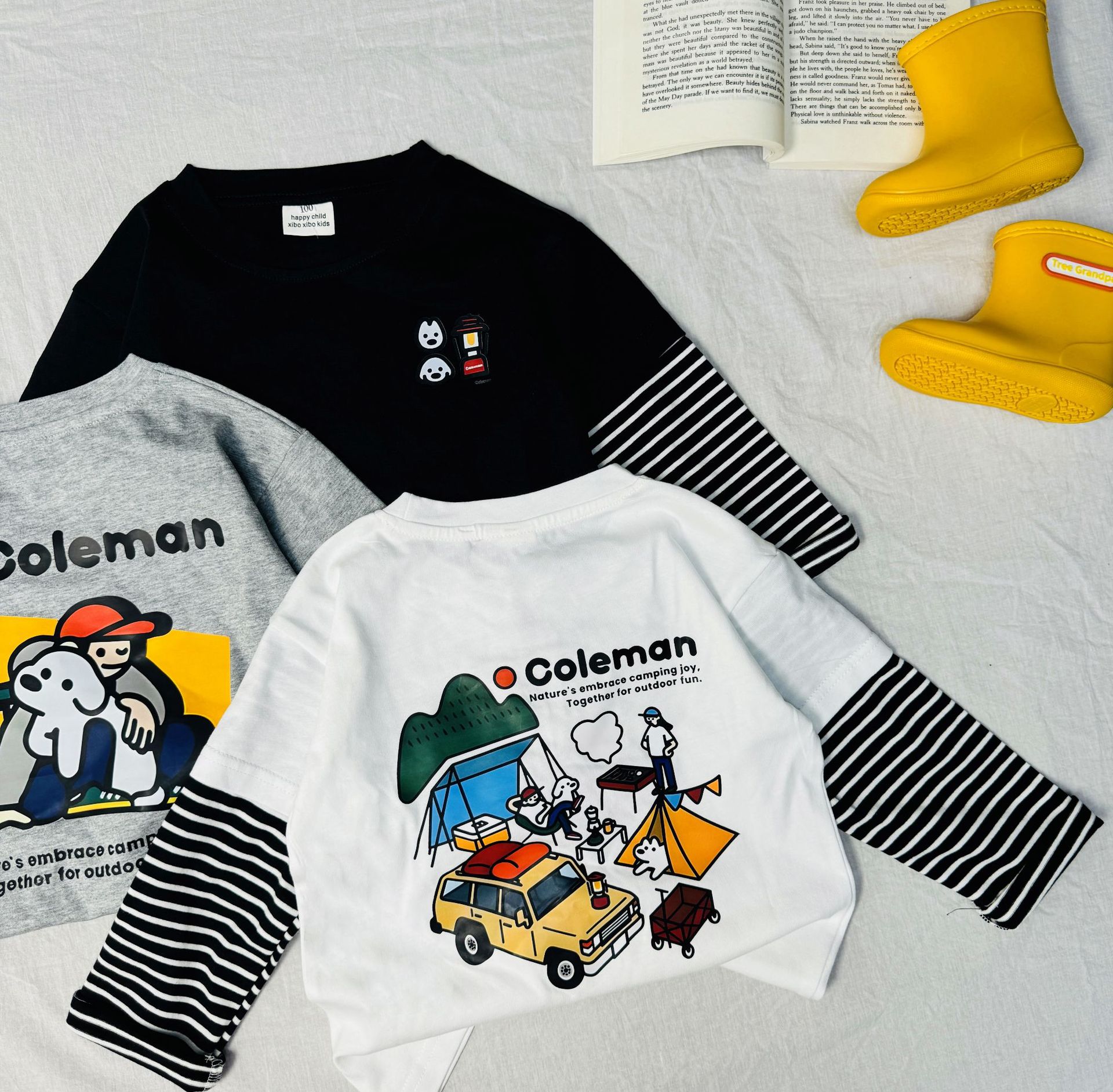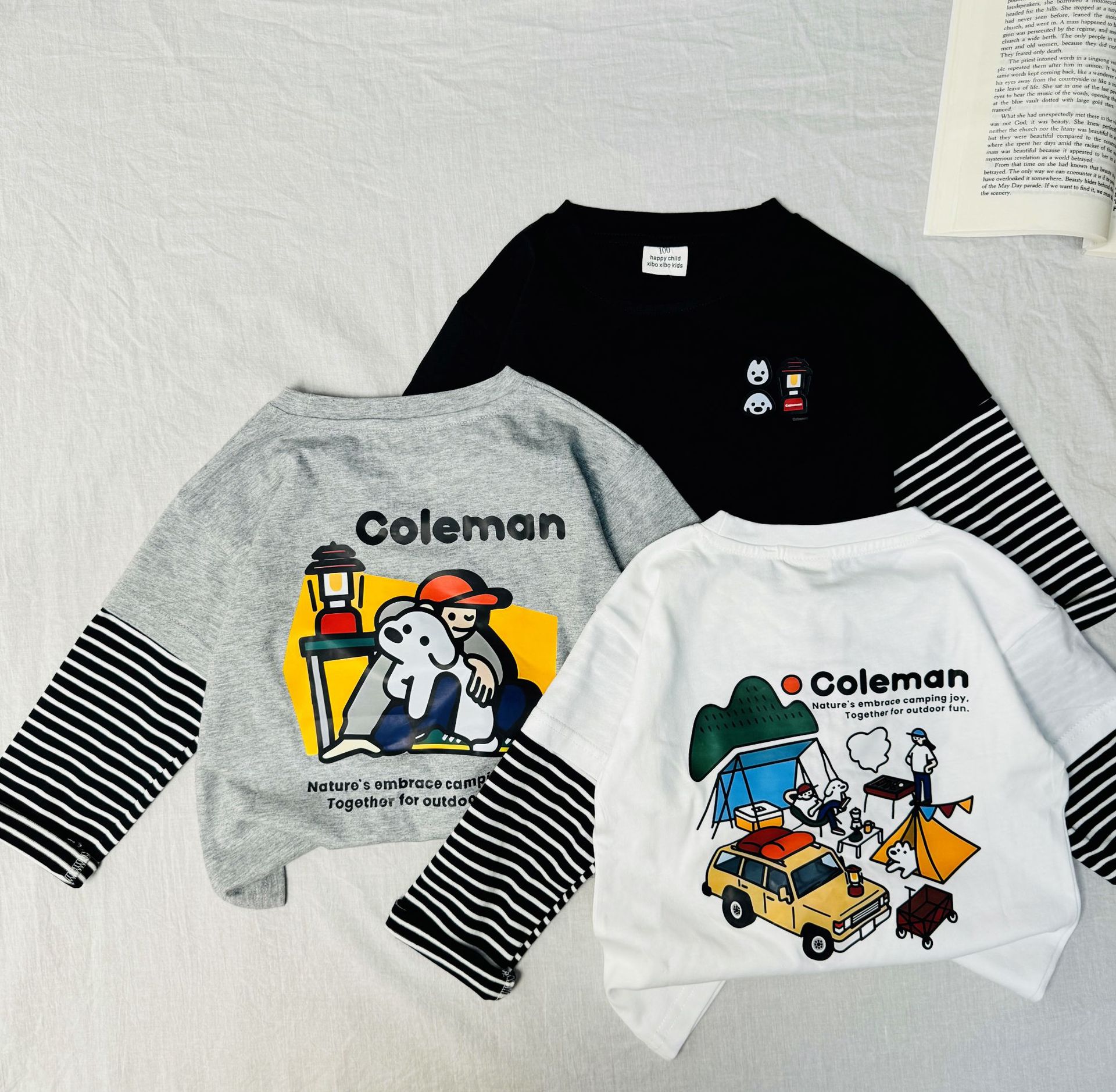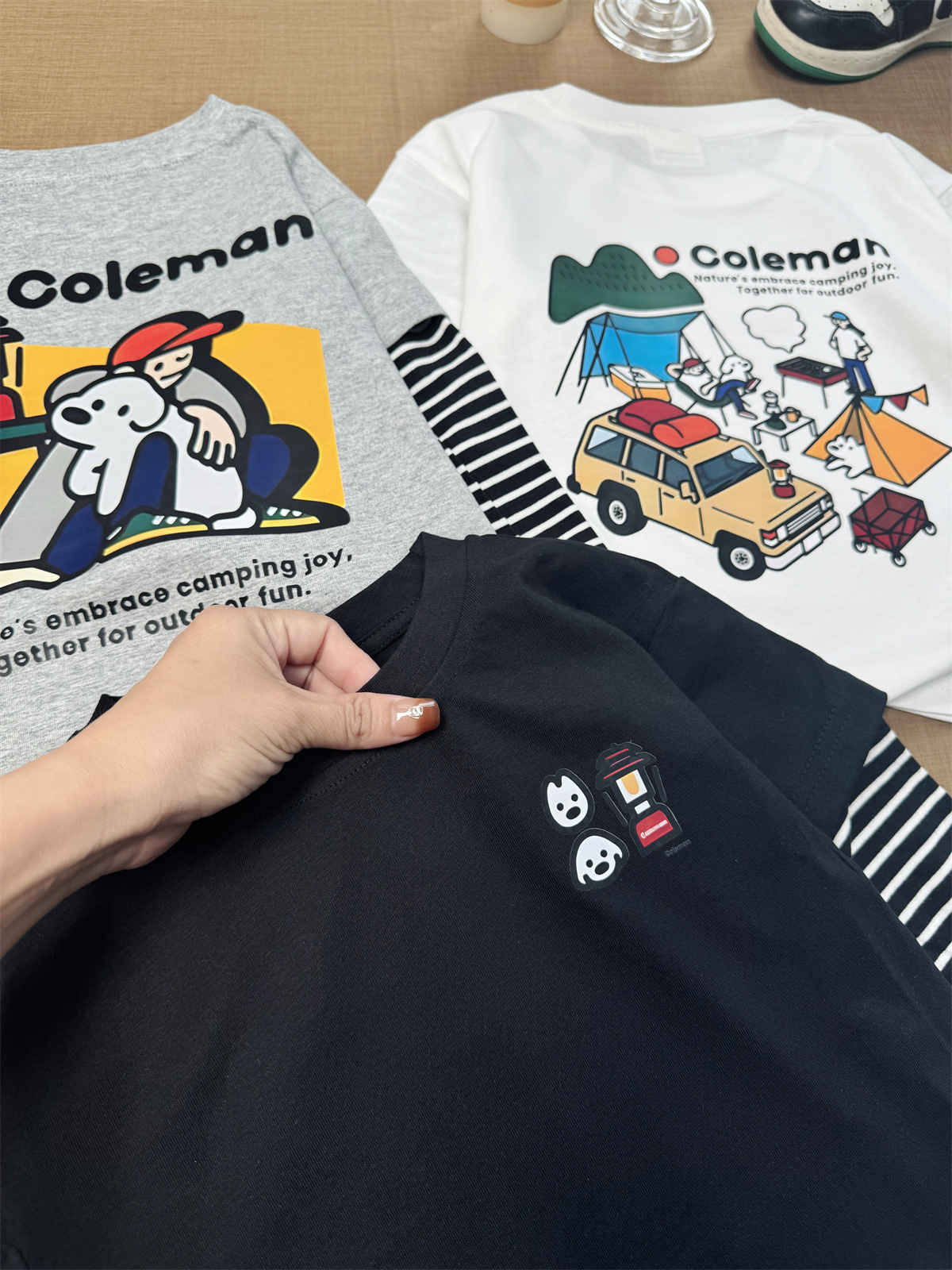 2024 새로운 소년과 소녀 만화 인쇄 긴 소매 탑 작은 어린이 아기 레저 가짜 2 조각 긴 소매 티셔츠 코튼스토어 가기