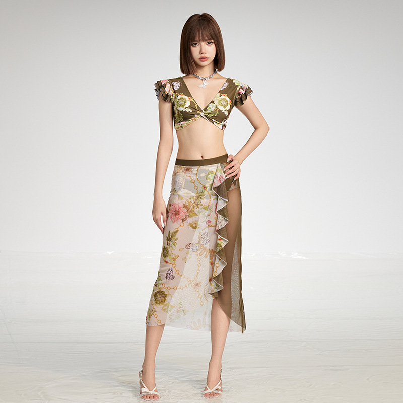 여름 새로운 수영복 여성의 배꼽 덮음 슬림 섹시한 순수한 욕망 인쇄 비치 랩 원피스 V-Neck 비키니 3 피스 세트