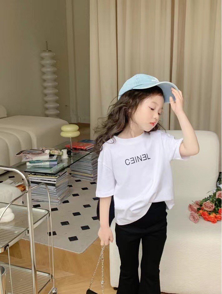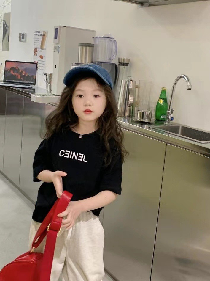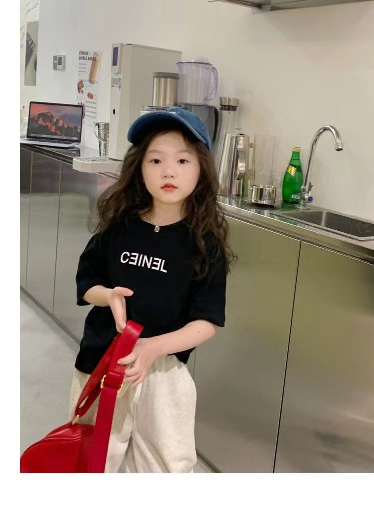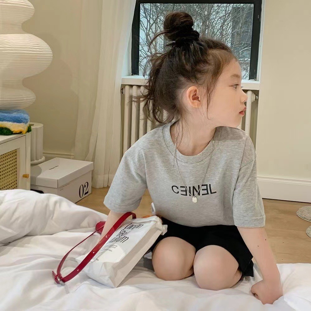 여자 여름 코튼 반팔 티셔츠 2024 여름 새로운 서양식 어린이 편지 인쇄 라운드 넥 올 매치 탑
