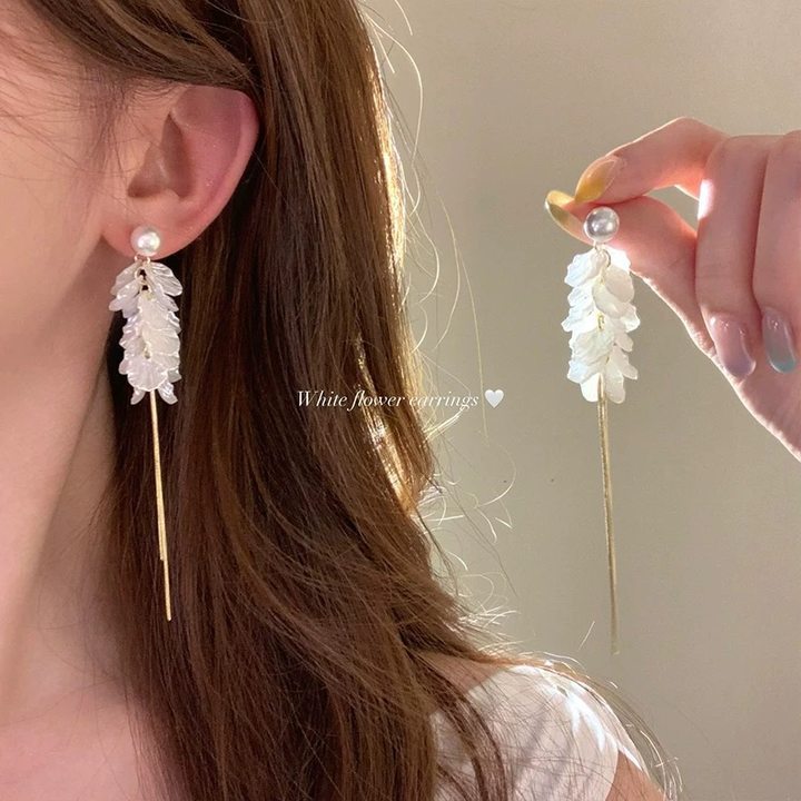 • 64#화이트 쉘 꽃잎 골드 롱 태슬 진주 스터드 귀걸이