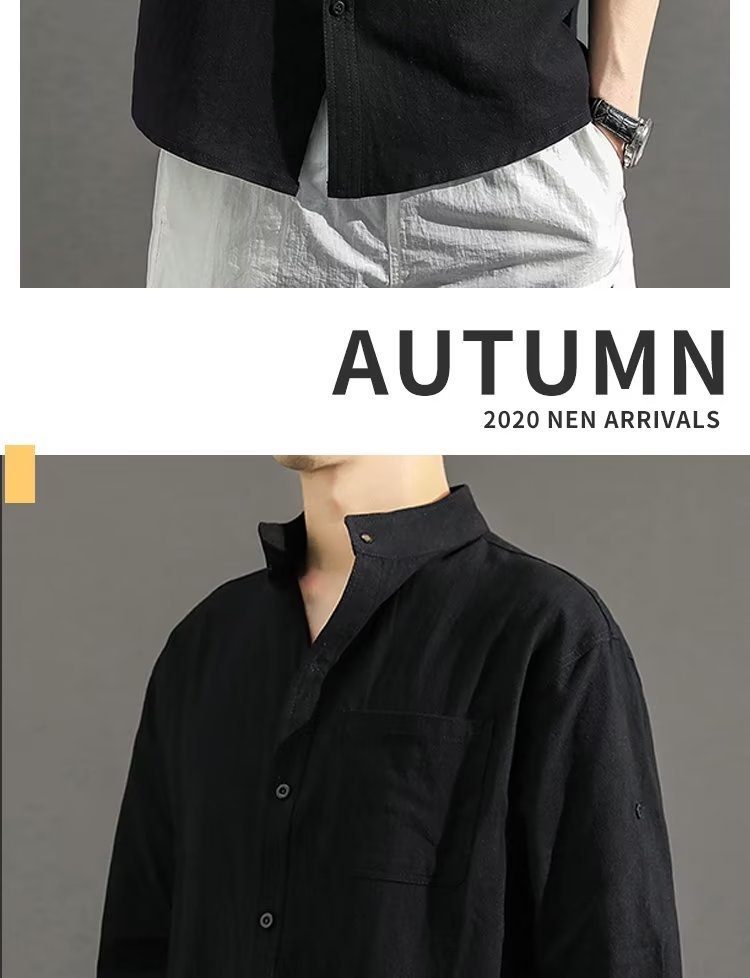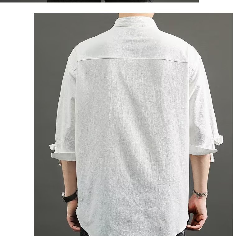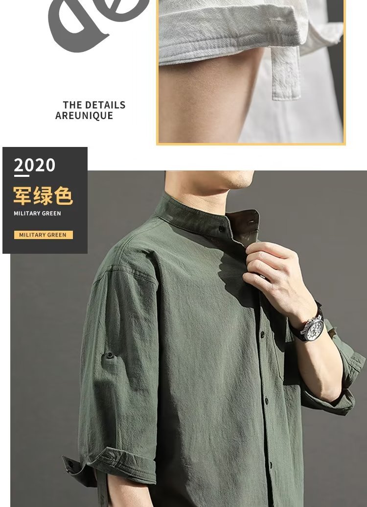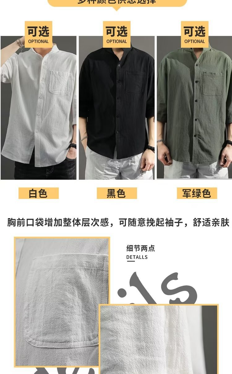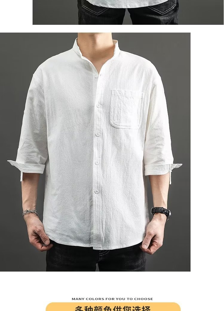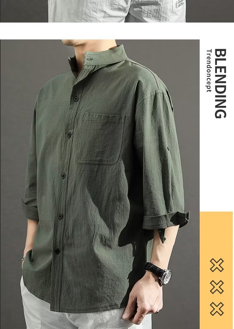 2023 여름 세븐 슬리브 단색 셔츠 남성용 일본식 캐주얼 루즈 칼라 셔츠 트렌디 남성용 탑스토어 가기