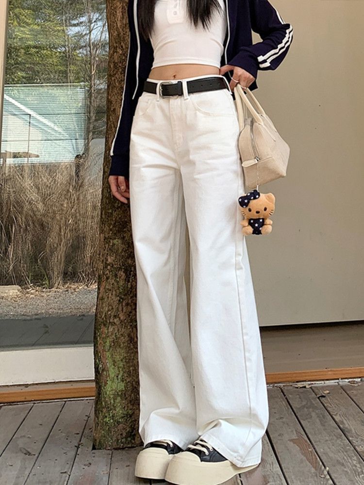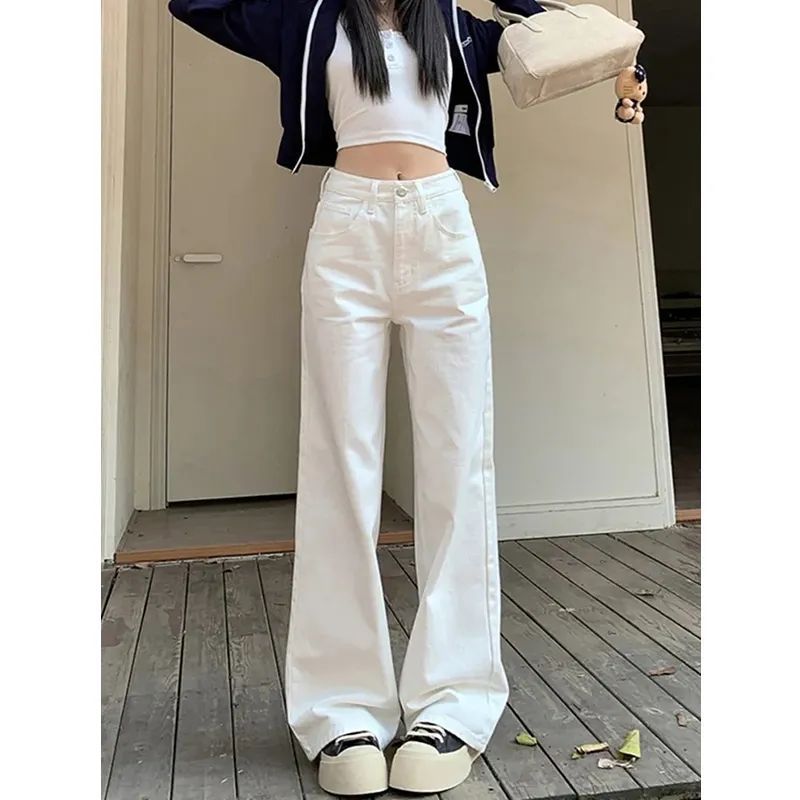 작은 미국 스타일 레트로 화이트 스트레이트 청바지 여성의 높은 허리 느슨한 슬림 슬림 넓은 다리 유행 유행 바지